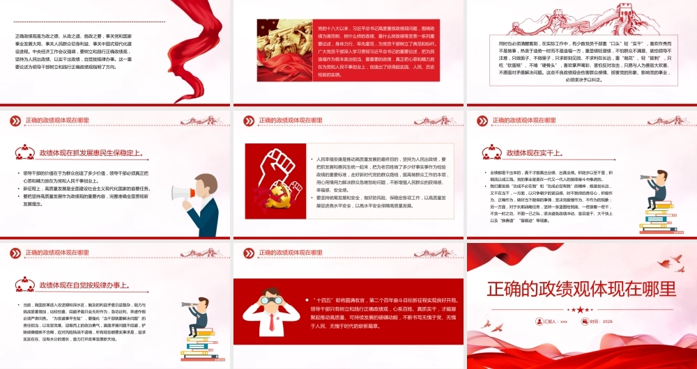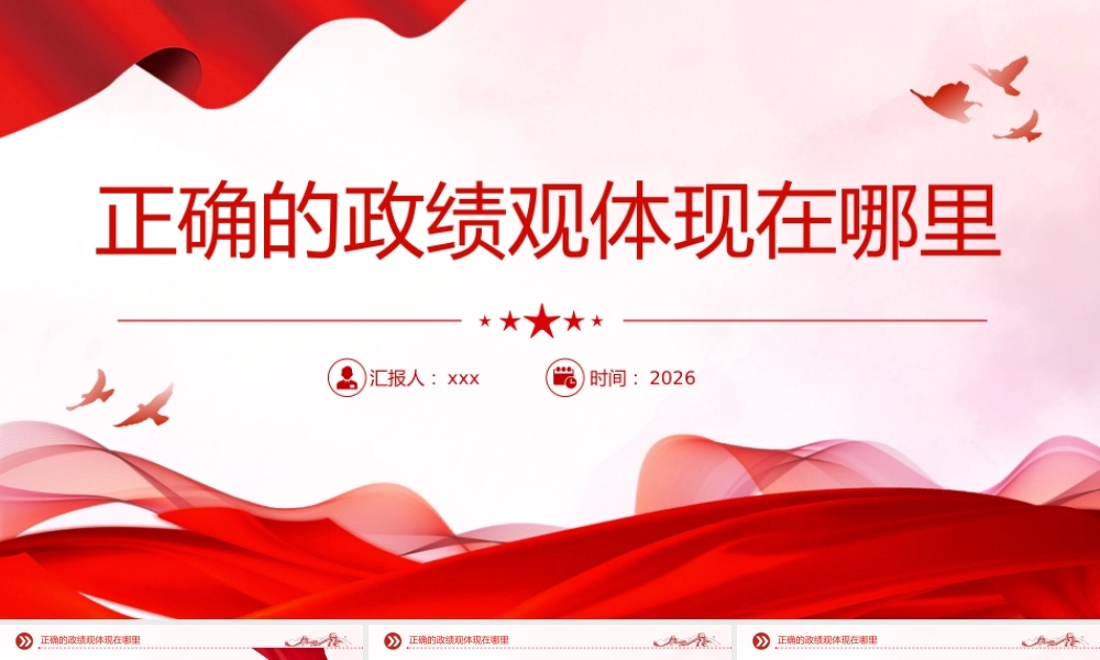 正确的政绩观体现在哪里汇报人: xxx时间: 2026正确的政绩观体现在哪里正确政绩观是为政之德、从政之道、施政之要,事关党和国家事业发展大局、事关人民群众切身利益、事关中国式现代化建设进程。中央经济工作会议强调,要树立和践行正确政绩观,坚持为人民出政绩、以实干出政绩,自觉按规律办事。这一重要论述为领导干部树立和践行正确政绩观指明了方向。党的十八大以来,习近平总书记高度重视政绩观问题,围绕政绩为谁而树、树什么样的政绩、靠什么树政绩等发表一系列重要论述,身体力行、率先垂范,为党员干部树立了典范和标杆。广大党员干部深入学习贯彻习近平总书记的重要论述,把为民造福作为根本政治担当、最重要的政绩,真正把心思和精力放在为党和人民干事创业上,创造出了经得起实践、人民、历史检验的实绩。正确的政绩观体现在哪里同时也必须清醒看到,在实际工作中,有少数党员干部重“口头”轻“实干”,喜欢作秀而不是做事,热衷于造势一时而不是造福一方,重显绩轻潜绩,不怕群众不满意、就怕领导不注意,只做面子、不做里子,只求即刻见效、不求利在长远,重“栽花”、轻“拔刺”,只吃“软蛋糕”、不啃“硬骨头”,喜欢掌声喝彩、害怕反对攻击,只愿与人为善皆大欢喜、不愿面对矛盾解决问题。这些不良政绩观会伤害群众感情、损害党的形象、影响党的事业,必须坚决予以纠正。正确的政绩观体现在哪里政绩体现在抓发展惠民生保稳定上。•领导干部的价值在于为群众创造了多少价值,领导干部必须真正把心思和精力放在为党和人民干事创业上。•新征程上,高质量发展是全面建设社会主义现代化国家的首要任务。•要把坚持高质量发展作为政绩观的重要内容,完整准确全面贯彻新发展理念。正确的政绩观体现在哪里正确的政绩观体现在哪里•人民幸福安康是推动高质量发展的最终目的,坚持为人民出政绩,要把抓发展和惠民生统一起来,把为老百姓做了多少好事实事作为检验政绩的重要标准,走好新时代党的群众路线,提高做群众工作的本领,用心用情用力解决群众急难愁盼问题,不断增强人民群众的获得感、幸福感、安全感。•要坚持统筹发展和安全,做好防风险、保稳定各项工作,以高质量发展促进高水平安全,以高水平安全保障高质量发展。政绩体现在实干上。•业绩都是干出来的,真干才能真出业绩、出真业绩。积跬步以至千里,积细流以成江海。党的事业就是在一代又一代人的接续奋斗中推进的。•我们要发扬“功成不必在我”和“功成必定有我”的精神,既谋划长远,又干在当下,一方面,以只争朝夕的紧迫感、时不我待的责任心,积极作为、正确作为,做好当下能做的事情,坚决克服慢作为、不作为的现象;另一方面,对于长期战略任务,坚持一张蓝图绘到底、一茬接着一茬干,不贪一时之功、不图一己之私,坚决避免政绩冲动、盲目蛮干、大干快上以及“换赛道”“留痕迹”等现象。正确的政绩观体现在哪里政绩体现在自觉按规律办事上。•当前,我国改革进入攻坚期和深水区,触及的利益矛盾日益复杂,阻力与挑战显著增加,拈轻怕重、回避矛盾只会无所作为,急功近利、弄虚作假必须严肃问责。“为官避事平生耻”,要强化“当干部就要解决问题”的责任担当,以攻坚克难、迎难而上的政治勇气,直面矛盾问题不回避,铲除顽瘴痼疾不含糊,应对风险挑战不退缩,所有规划都要实事求是,追求实实在在、没有水分的增长,奋力打开改革发展新天地。正确的政绩观体现在哪里正确的政绩观体现在哪里 “ 十四五”即将圆满收官,第二个百年奋斗目标新征程实现良好开局。领导干部只有树立和践行正确政绩观,心系百姓、真抓实干,才能凝聚起推动高质量、可持续发展的磅礴动能,不断书写无愧于党、无愧于人民、无愧于时代的崭新篇章。正确的政绩观体现在哪里汇报人: xxx时间: 2026
