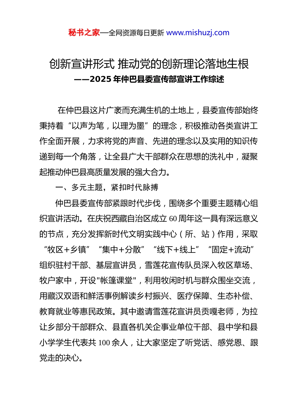 秘书之家—全网资源每日更新 www.mishuzj.com创新宣讲形式 推动党的创新理论落地生根——2025 年仲巴县委宣传部宣讲工作综述 在仲巴县这片广袤而充满生机的土地上,县委宣传部始终秉持着“以声为笔,以理为墨”的理念,积极推动各类宣讲工作全面开展,力求将党的声音、先进的理念以及实用的知识传递到每一个角落,让全县广大干部群众在思想的洗礼中,凝聚起推动仲巴县高质量发展的强大合力。一、多元主题,紧扣时代脉搏仲巴县委宣传部紧跟时代步伐,围绕多个重要主题精心组织宣讲活动。在庆祝西藏自治区成立 60 周年这一具有深远意义的节点,充分发挥新时代文明实践中心(所、站)作用,采取“牧区+乡镇”“集中+分散”“线下+线上”“固定+流动”组织驻村干部、基层宣讲员,雪莲花宣传队员深入牧区草场、牧户家中,开设"帐篷课堂",利用牧闲时机与群众围坐交流,用藏汉双语和鲜活事例解读乡村振兴、医疗保障、生态补偿、教育就业等惠民政策。其中邀请雪莲花宣讲员贡嘎老师,为拉让乡部分干部群众、县直各机关企事业单位干部、县中学和县小学学生代表共 100 余人,让大家坚定了听党话、感党恩、跟党走的决心。秘书之家—全网资源每日更新 www.mishuzj.com同时,积极推动习近平总书记给林芝市巴宜区林芝镇嘎拉村全体村民回信精神的学习与传播。7 月 9 日,自治区“十佳”基层宣讲员达瓦次仁赴仲巴县纳久乡开展习近平总书记给林芝市巴宜区林芝镇嘎拉村全体村民回信精神及铸牢中华民族共同体意识和“国家意识、公民意识、法治意识”宣讲活动,100余名群众热情参与。达瓦次仁详细解读回信内容,使群众深切体会到党中央对西藏地区发展的深切关怀,深刻认识到民族团结、生态保护以及乡村发展的重要意义,激发了大家建设家乡的热情。此外,仲巴县各驻村工作队也迅速响应,全方位、多层次开展学习宣讲习近平总书记给林芝市巴宜区林芝镇嘎拉村全体村民回信精神活动。通过精心组织,召开驻村工作临时党支部工作推进会,安排学习宣讲工作;开展形式多样的学习活动,如专题学习、结合“三会一课”等组织村“两委”学习讨论;走村入户,利用“百日走村入户大调研活动”契机向群众宣讲,始终以满足群众对美好生活的文化新需求、新期待为出发点和落脚点,聚焦新时代文明实践中心(所、站)、“一村一群”微信群,转发宣讲习近平总书记经典语句、深入贯彻中央八项规定精神学习教育、民生福祉、乡村振兴政策等 7420 余条次,宣讲 280 余场次,受众 16000 余人次,引导牧民群众学懂弄通、秘书之家—全网资源每日更新 www.mishuzj.com用好用活有关政策,自觉把个人和小家的幸福,与国家的发展、民族的梦想联系起来,自觉依靠党的好政策和勤劳双手创造幸福生活。二、创新形式,贴近群众生活为了让宣讲内容真正走进群众心里,仲巴县委宣传部不断创新宣讲形式,力求贴近群众生活。以旷野为教室,以亲历为教材,71 岁的老党员、自治区级基层牧民宣讲员边究,凭借丰富的生活阅历和质朴的语言风格,进机关、走村镇、入学校,讲述党史、国史和西藏解放史等。他用自己的亲身经历,让群众更直观地感受党的伟大,这种接地气的宣讲方式深受群众喜爱,在巡回宣讲活动中,为大家带来了一场场精彩又接地气的宣讲。在日常宣讲中,注重利用新媒体平台拓宽传播渠道。各驻村工作队通过微信公众号、工作群等推送原文、学习资料和解读文章,组织队员和群众开展线上学习讨论,打破了时间和空间的限制,让更多群众能够便捷地参与到学习中来。同时,针对不同受众群体,采用不同的宣讲方式。比如在学校开展包虫病知识宣讲及演讲比赛、法治宣讲活动等,以生动形象的方式,结合案例讲解、互动演示等形式,提高学生们的参与度和学习效果,增强他们的健康意识和法治观念。秘书之家—全网资源每日更新 www.mishuzj.com三、强化队伍,提升宣讲质量仲巴县委宣传部注重宣讲队伍建设,努力提升宣讲质量。积极邀请像贡嘎老师、达瓦次仁这样优秀的宣讲员开展宣讲活动,他们丰富的经验和专业的知识,为宣讲工作注入强大动力。同时,注重培养本土宣讲人才,老党员边究就是其中的杰出代表。他不仅自己深入学习党史等知识...
