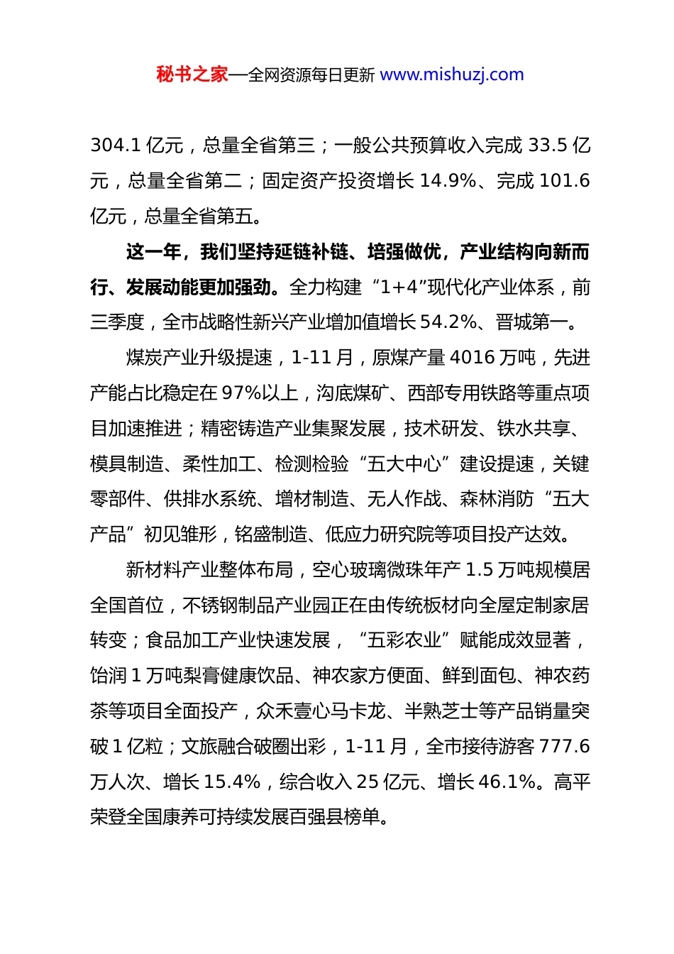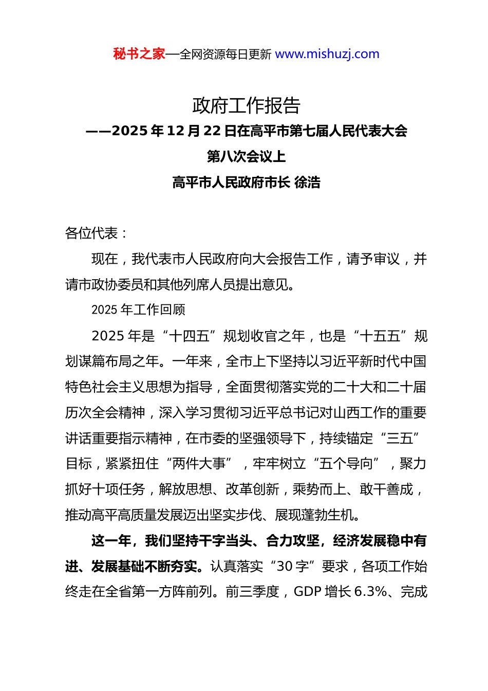 秘书之家—全网资源每日更新 www.mishuzj.com政府工作报告——2025 年 12 月 22 日在高平市第七届人民代表大会第八次会议上高平市人民政府市长 徐浩各位代表:现在,我代表市人民政府向大会报告工作,请予审议,并请市政协委员和其他列席人员提出意见。2025 年工作回顾2025 年是“十四五”规划收官之年,也是“十五五”规划谋篇布局之年。一年来,全市上下坚持以习近平新时代中国特色社会主义思想为指导,全面贯彻落实党的二十大和二十届历次全会精神,深入学习贯彻习近平总书记对山西工作的重要讲话重要指示精神,在市委的坚强领导下,持续锚定“三五”目标,紧紧扭住“两件大事”,牢牢树立“五个导向”,聚力抓好十项任务,解放思想、改革创新,乘势而上、敢干善成,推动高平高质量发展迈出坚实步伐、展现蓬勃生机。这一年,我们坚持干字当头、合力攻坚,经济发展稳中有进、发展基础不断夯实。认真落实“30 字”要求,各项工作始终走在全省第一方阵前列。前三季度,GDP 增长 6.3%、完成秘书之家—全网资源每日更新 www.mishuzj.com304.1 亿元,总量全省第三;一般公共预算收入完成 33.5 亿元,总量全省第二;固定资产投资增长 14.9%、完成 101.6亿元,总量全省第五。这一年,我们坚持延链补链、培强做优,产业结构向新而行、发展动能更加强劲。全力构建“1+4”现代化产业体系,前三季度,全市战略性新兴产业增加值增长 54.2%、晋城第一。煤炭产业升级提速,1-11 月,原煤产量 4016 万吨,先进产能占比稳定在 97%以上,沟底煤矿、西部专用铁路等重点项目加速推进;精密铸造产业集聚发展,技术研发、铁水共享、模具制造、柔性加工、检测检验“五大中心”建设提速,关键零部件、供排水系统、增材制造、无人作战、森林消防“五大产品”初见雏形,铭盛制造、低应力研究院等项目投产达效。新材料产业整体布局,空心玻璃微珠年产 1.5 万吨规模居全国首位,不锈钢制品产业园正在由传统板材向全屋定制家居转变;食品加工产业快速发展,“五彩农业”赋能成效显著,饴润 1 万吨梨膏健康饮品、神农家方便面、鲜到面包、神农药茶等项目全面投产,众禾壹心马卡龙、半熟芝士等产品销量突破 1 亿粒;文旅融合破圈出彩,1-11 月,全市接待游客 777.6万人次、增长 15.4%,综合收入 25 亿元、增长 46.1%。高平荣登全国康养可持续发展百强县榜单。秘书之家—全网资源每日更新 www.mishuzj.com这一年,我们坚持建管并重、协同联动,城乡融合成效显著、人居品质持续提升。认真学习践行“千万工程”经验,贯彻落实中央城市工作会议精神,加快构建县域内城乡融合“五大布局”,我市入选新型城镇化国家试点地区、晋城唯一。乡村振兴全面推进,累计建成 63 个精品示范村、151 个提档升级村,釜山片区六村连片发展做法获农业农村部充分肯定,经验全国推广。城市品质持续提升,老旧小区、背街小巷改造提升实现全覆盖;“五小”惠民工程累计建成口袋小公园166 个、便民小市场 12 个、老人小饭桌 105 个、阅读小空间15 个、共享小驿站 47 个;钟书阁全国首家县级城市店落地奥莱,全国首个未来音乐科技产业园落户开发区,留念炎乐艺术馆开馆。城乡融合一体发展,新改建“四好农村路”139 公里,国道 208 改线路基成型;张峰供水覆盖主城区和 8 个乡镇 35 万人;集中供热新增 200 万㎡,覆盖率 80%;民用燃气价格统一为 1.9 元/方;城乡环卫一体延伸到 7 个乡镇(街道)、覆盖率65%,垃圾无害化处理率 100%,卫生厕所普及率 91%。更多老百姓实现就地城镇化,享受到高品质生活。这一年,我们坚持聚焦重点、精准突破,改革开放纵深推进、发展活力充分释放。深入学习贯彻习近平总书记关于全面秘书之家—全网资源每日更新 www.mishuzj.com深化改革的重要论述,循序渐进、稳扎稳打推进各领域改革,为高质量发展和现代化建设提供强劲动能。改革创新不断深化,12 个方面 46 条改革举措落地见效,再生水利用配置、农业生产托管服务等 8 项国家和省级重点改革试点扎实推进;供销社改革领跑全省,全省深化供销合作社综合改革暨“五张网”构建业务培...