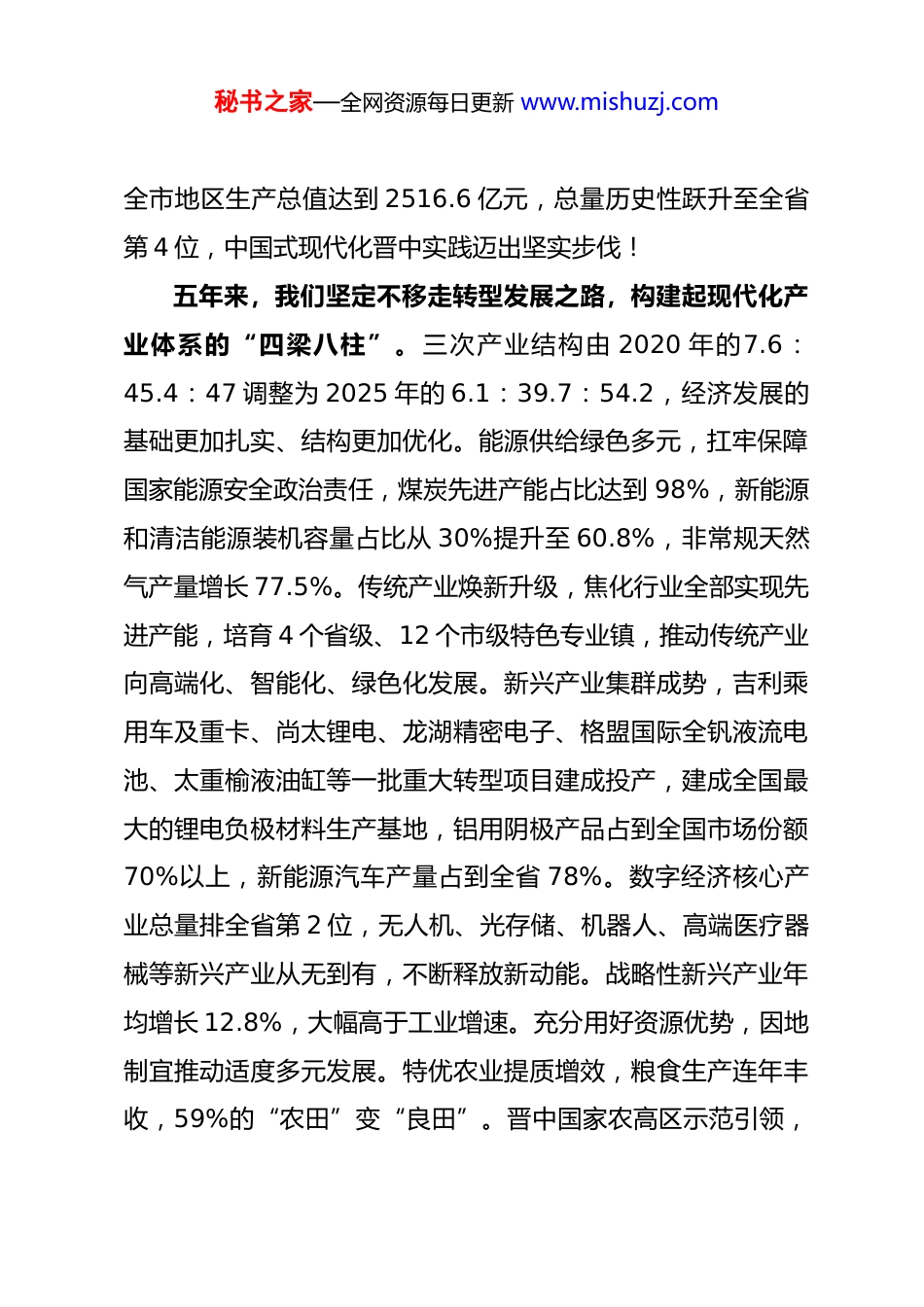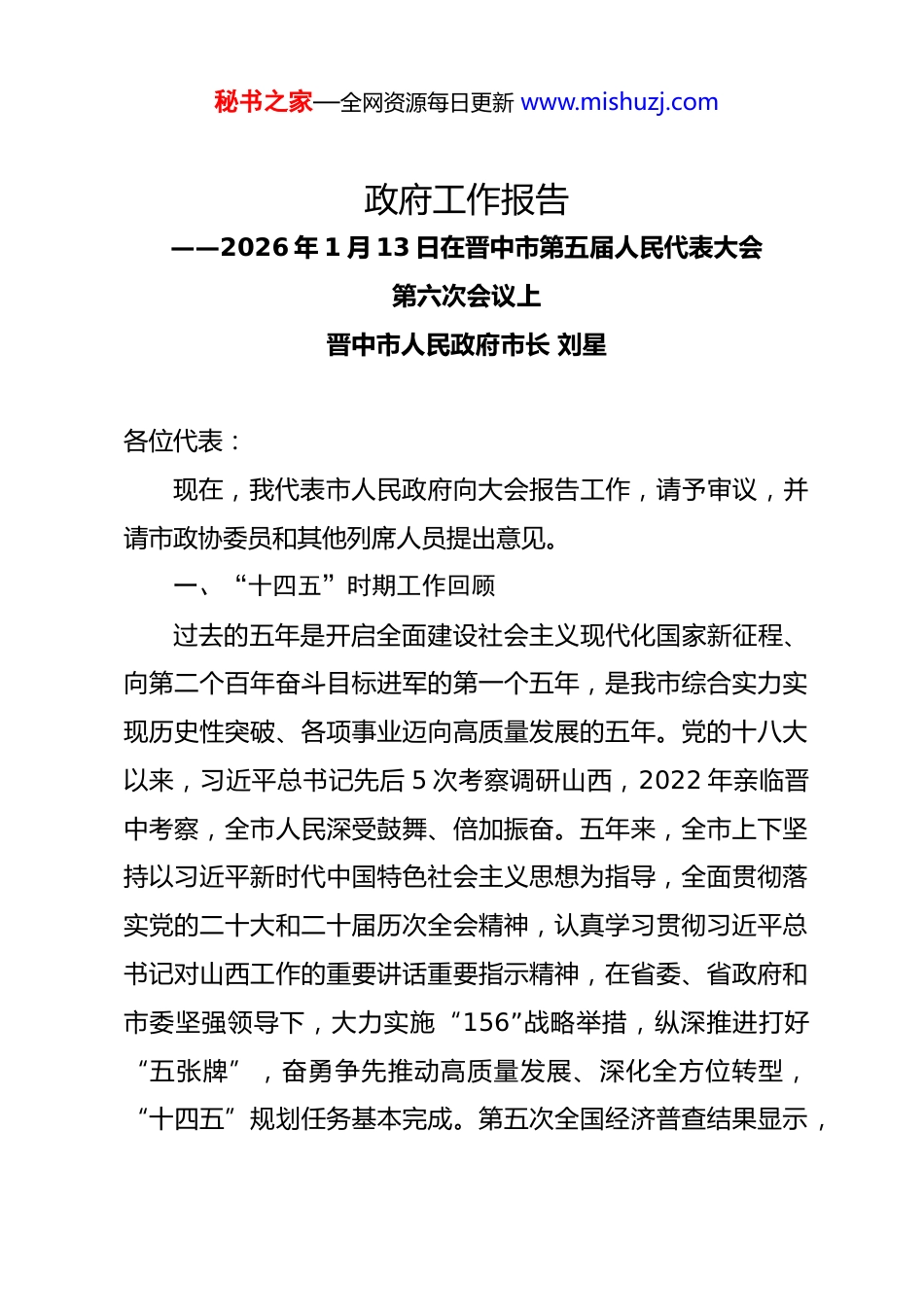 秘书之家—全网资源每日更新 www.mishuzj.com政府工作报告——2026 年 1 月 13 日在晋中市第五届人民代表大会第六次会议上晋中市人民政府市长 刘星各位代表:现在,我代表市人民政府向大会报告工作,请予审议,并请市政协委员和其他列席人员提出意见。一、“十四五”时期工作回顾过去的五年是开启全面建设社会主义现代化国家新征程、向第二个百年奋斗目标进军的第一个五年,是我市综合实力实现历史性突破、各项事业迈向高质量发展的五年。党的十八大以来,习近平总书记先后 5 次考察调研山西,2022 年亲临晋中考察,全市人民深受鼓舞、倍加振奋。五年来,全市上下坚持以习近平新时代中国特色社会主义思想为指导,全面贯彻落实党的二十大和二十届历次全会精神,认真学习贯彻习近平总书记对山西工作的重要讲话重要指示精神,在省委、省政府和市委坚强领导下,大力实施“156”战略举措,纵深推进打好“五张牌”,奋勇争先推动高质量发展、深化全方位转型,“十四五”规划任务基本完成。第五次全国经济普查结果显示,秘书之家—全网资源每日更新 www.mishuzj.com全市地区生产总值达到 2516.6 亿元,总量历史性跃升至全省第 4 位,中国式现代化晋中实践迈出坚实步伐!五年来,我们坚定不移走转型发展之路,构建起现代化产业体系的“四梁八柱”。三次产业结构由 2020 年的 7.6:45.4:47 调整为 2025 年的 6.1:39.7:54.2,经济发展的基础更加扎实、结构更加优化。能源供给绿色多元,扛牢保障国家能源安全政治责任,煤炭先进产能占比达到 98%,新能源和清洁能源装机容量占比从 30%提升至 60.8%,非常规天然气产量增长 77.5%。传统产业焕新升级,焦化行业全部实现先进产能,培育 4 个省级、12 个市级特色专业镇,推动传统产业向高端化、智能化、绿色化发展。新兴产业集群成势,吉利乘用车及重卡、尚太锂电、龙湖精密电子、格盟国际全钒液流电池、太重榆液油缸等一批重大转型项目建成投产,建成全国最大的锂电负极材料生产基地,铝用阴极产品占到全国市场份额70%以上,新能源汽车产量占到全省 78%。数字经济核心产业总量排全省第 2 位,无人机、光存储、机器人、高端医疗器械等新兴产业从无到有,不断释放新动能。战略性新兴产业年均增长 12.8%,大幅高于工业增速。充分用好资源优势,因地制宜推动适度多元发展。特优农业提质增效,粮食生产连年丰收,59%的“农田”变“良田”。晋中国家农高区示范引领,秘书之家—全网资源每日更新 www.mishuzj.com推广新品种新技术 1000 余项,认证名优农产品品牌 227 个,农产品精深加工集群发展,“小特产”成为“大产业”。文旅产业蓬勃发展,深入实施“双百”工程,成功创建晋中国家文化生态保护区,叫响“怡然见晋中”城市文旅 IP,推出“三大主题”,布局“九大业态群落”,以新供给创造新需求,培育形成了丰富多元的文旅场景,平遥古城等龙头景区人气旺盛,榆次老城、百草坡等优质文旅资源全面盘活,未来无限城、定阳路万达和漫乐城、怡然青年广场、昔阳民俗街等新商圈、新业态不断涌现、持续引流。2024 年以来,每年超六千万人次来晋中休闲旅游,带动消费市场繁荣活跃。全市经济在转型升级中积蓄能量,新旧动能加速转换,体现晋中特点、具有比较优势的现代化产业体系正在形成!五年来,我们持续推动深化改革、扩大开放、协同创新共同发力,激发出高质量发展的强劲动能。进一步全面深化改革,119 项重点改革事项全面完成,教育、养老、医改、农业农村、基层治理、营商环境等一批改革走在全国全省前列。坚持和落实“两个毫不动摇”,持续深化国资国企改革,支持民营企业发展,百亿企业达到 8 户,18 户企业跻身山西“百强民企”,规上工业企业数量稳居全省首位,省级以上“专精特新”企业、高新技术企业数量均排全省第 2 位。扩大高水平对外开放,与秘书之家—全网资源每日更新 www.mishuzj.com146 个国家和地区建立贸易往来,县县都有外贸企业,外贸进出口总额年均增长 25.5%,中欧中亚班列常态化运营,亮宇炭素制品出口连续五年居全国行业榜首,更多优质产品漂洋过海、销往全球。大力推进“双...