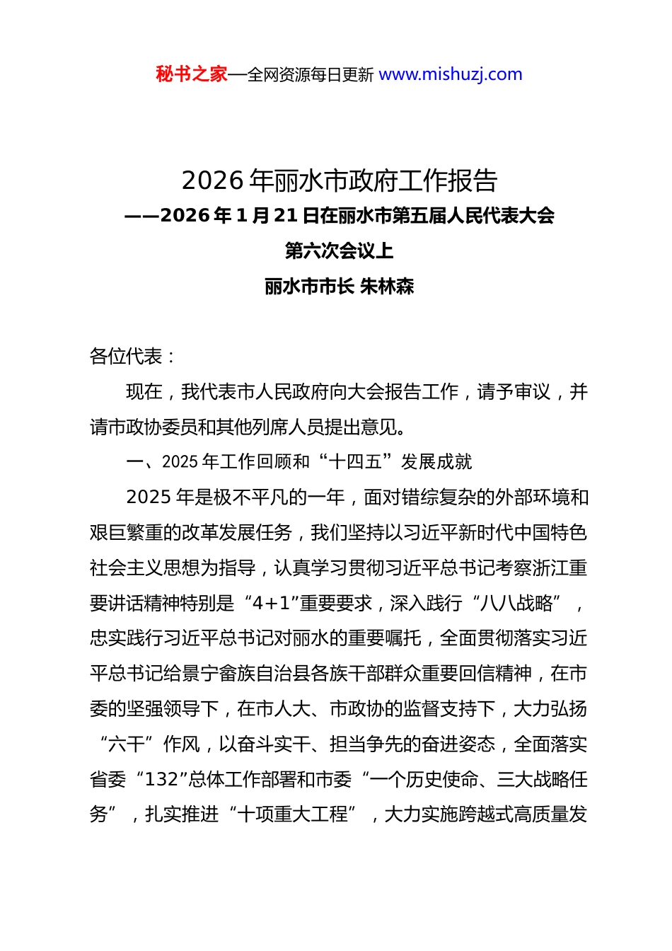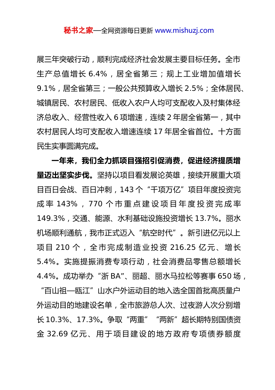 秘书之家—全网资源每日更新 www.mishuzj.com2026 年丽水市政府工作报告——2026 年 1 月 21 日在丽水市第五届人民代表大会第六次会议上丽水市市长 朱林森各位代表:现在,我代表市人民政府向大会报告工作,请予审议,并请市政协委员和其他列席人员提出意见。一、2025 年工作回顾和“十四五”发展成就2025 年是极不平凡的一年,面对错综复杂的外部环境和艰巨繁重的改革发展任务,我们坚持以习近平新时代中国特色社会主义思想为指导,认真学习贯彻习近平总书记考察浙江重要讲话精神特别是“4+1”重要要求,深入践行“八八战略”,忠实践行习近平总书记对丽水的重要嘱托,全面贯彻落实习近平总书记给景宁畲族自治县各族干部群众重要回信精神,在市委的坚强领导下,在市人大、市政协的监督支持下,大力弘扬“六干”作风,以奋斗实干、担当争先的奋进姿态,全面落实省委“132”总体工作部署和市委“一个历史使命、三大战略任务”,扎实推进“十项重大工程”,大力实施跨越式高质量发秘书之家—全网资源每日更新 www.mishuzj.com展三年突破行动,顺利完成经济社会发展主要目标任务。全市生产总值增长 6.4%,居全省第三;规上工业增加值增长9.1%,居全省第三;一般公共预算收入增长 2.5%;全体居民、城镇居民、农村居民、低收入农户人均可支配收入及村集体经济总收入、经营性收入 6 项增速,连续 2 年居全省第一,其中农村居民人均可支配收入增速连续 17 年居全省首位。十方面民生实事圆满完成。一年来,我们全力抓项目强招引促消费,促进经济提质增量迈出坚实步伐。坚持以项目看发展论英雄,接续开展重大项目百日会战、百日冲刺,143 个“千项万亿”项目年度投资完成 率 143% , 770 个 市 重 点 建 设 项 目 年 度 投 资 完 成 率149.3%,交通、能源、水利基础设施投资增长 13.7%。丽水机场顺利通航,我市正式迈入“航空时代”。新引进亿元以上项 目 210 个 , 全 市 完 成 制 造 业 投 资 216.25 亿 元 、 增 长5.4%。实施提振消费专项行动,社会消费品零售总额增长4.4%。成功举办“浙 BA”、丽超、丽水马拉松等赛事 650 场,“百山祖—瓯江”山水户外运动目的地入选全国首批高质量户外运动目的地建设名单,全市旅游总人次、过夜游人次分别增长 10.3%、17.3%。争取“两重”“两新”超长期特别国债资金 32.69 亿 元 、 用 于 项 目 建 设 的 地 方 政 府 专 项 债 券 额 度秘书之家—全网资源每日更新 www.mishuzj.com190.08 亿元、用地计划指标 1.68 万亩,生态纳爱斯智能工厂、追觅智能家电制造等 304 个项目开工建设,衢丽铁路、义龙庆高速、棠溪水库等一批重大项目提速推进。一年来,我们加快建设创新丽水,推动产业高质量发展迈出坚实步伐。丽水学院智能制造产业学院入选省级重点支持现代产业学院建设点,丽水职业技术学院建成省高水平专业群 2个。新增全省重点实验室 4 家,实施产创、产学研合作项目170 个,解决产业技术难题 46 个。授权 197 家企业自主认定人才,新增产业工程师 1553 人、制造业高技能人才 1.13 万人,“大国工匠”实现零的突破。特色半导体、中医药大健康产业链规上产值分别突破 200 亿元、170 亿元,时尚轻工产业集群产值突破 500 亿元。入选国家中小企业数字化转型城市试点,青田县成为省低空经济“先飞区”试点。一年来,我们以“强城”为重点带“兴村”促“融合”,缩小“三大差距”迈出坚实步伐。推动市域发展轴规划成型,入选首批省级“县城—中心镇—重点村”发展轴 9 条、新一轮省级中心镇 13 个、省级重点村 33 个。提升中心城市辐射带动力,“三江口”协同发展区建设提速,花街路、小白岩路、瓯江大桥等基础设施建设稳步推进,数智经济产业园、电信三江口核心机楼全面开工,恒天领锐新能源电驱总成项目引进落地。秘书之家—全网资源每日更新 www.mishuzj.com打造“小县大城”2.0 版,80 个县城承载能力提升项目完成投资 195.2 亿元,松阳县成为城乡基础设施一体化省级试点。推进乡村全面振兴,强村公司共富工坊选品中心投...