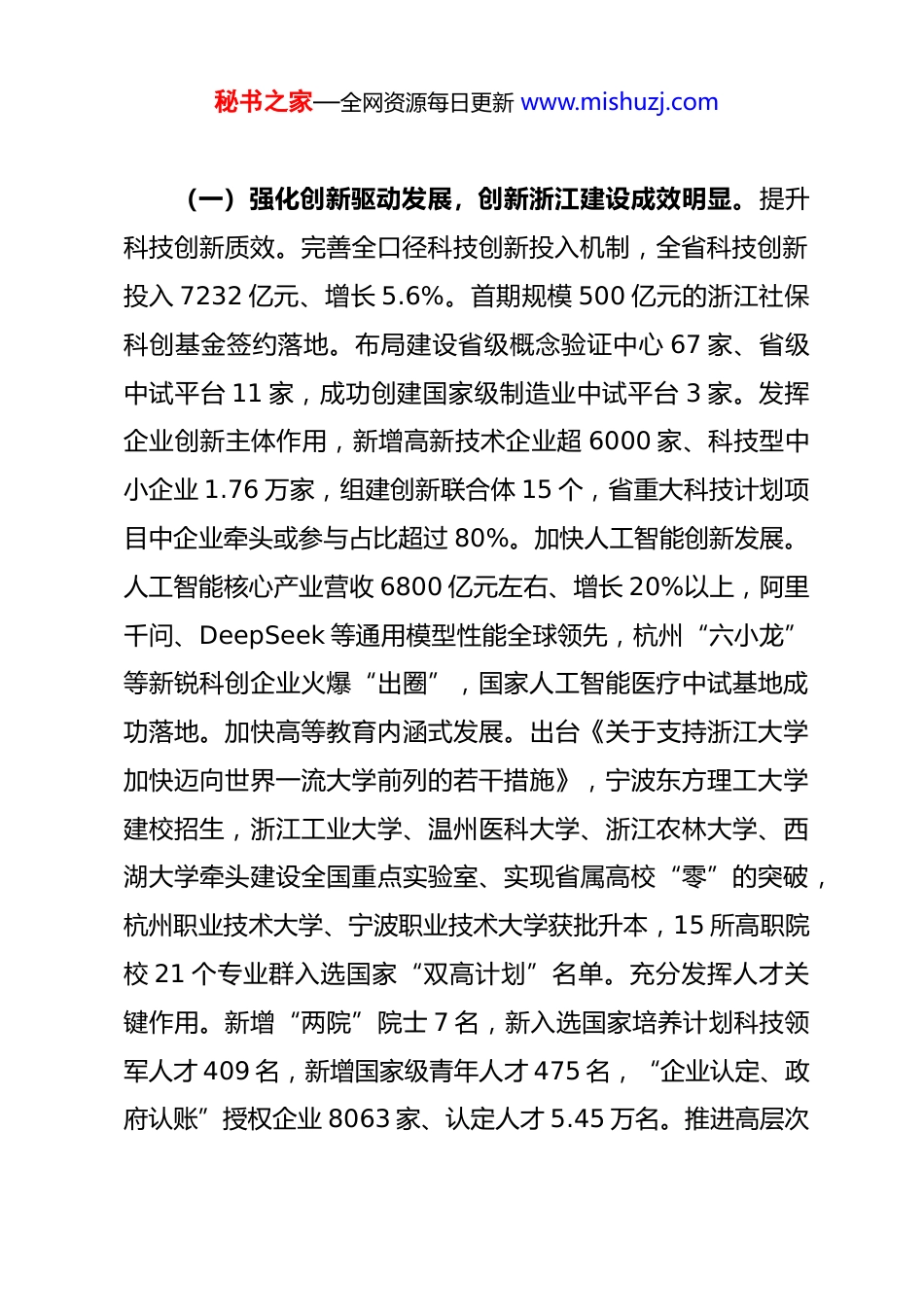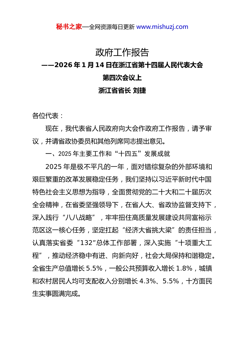 秘书之家—全网资源每日更新 www.mishuzj.com政府工作报告——2026 年 1 月 14 日在浙江省第十四届人民代表大会第四次会议上浙江省省长 刘捷各位代表:现在,我代表省人民政府向大会作政府工作报告,请予审议,并请省政协委员和其他列席同志提出意见。一、2025 年主要工作和“十四五”发展成就2025 年是极不平凡的一年,面对错综复杂的外部环境和艰巨繁重的改革发展稳定任务,我们坚持以习近平新时代中国特色社会主义思想为指导,全面贯彻党的二十大和二十届历次全会精神,在省委坚强领导下,在省人大、省政协监督支持下,深入践行“八八战略”,牢牢扭住高质量发展建设共同富裕示范区这一核心任务,坚定扛起“经济大省挑大梁”的责任担当,认真落实省委“132”总体工作部署,深入实施“十项重大工程”,推动经济稳中有进、向新向好,社会大局保持和谐稳定。全省生产总值增长 5.5%,一般公共预算收入增长 1.8%,城镇和农村居民人均可支配收入分别增长 4.3%、5.5%,十方面民生实事圆满完成。秘书之家—全网资源每日更新 www.mishuzj.com(一)强化创新驱动发展,创新浙江建设成效明显。提升科技创新质效。完善全口径科技创新投入机制,全省科技创新投入 7232 亿元、增长 5.6%。首期规模 500 亿元的浙江社保科创基金签约落地。布局建设省级概念验证中心 67 家、省级中试平台 11 家,成功创建国家级制造业中试平台 3 家。发挥企业创新主体作用,新增高新技术企业超 6000 家、科技型中小企业 1.76 万家,组建创新联合体 15 个,省重大科技计划项目中企业牵头或参与占比超过 80%。加快人工智能创新发展。人工智能核心产业营收 6800 亿元左右、增长 20%以上,阿里千问、DeepSeek 等通用模型性能全球领先,杭州“六小龙”等新锐科创企业火爆“出圈”,国家人工智能医疗中试基地成功落地。加快高等教育内涵式发展。出台《关于支持浙江大学加快迈向世界一流大学前列的若干措施》,宁波东方理工大学建校招生,浙江工业大学、温州医科大学、浙江农林大学、西湖大学牵头建设全国重点实验室、实现省属高校“零”的突破,杭州职业技术大学、宁波职业技术大学获批升本,15 所高职院校 21 个专业群入选国家“双高计划”名单。充分发挥人才关键作用。新增“两院”院士 7 名,新入选国家培养计划科技领军人才 409 名,新增国家级青年人才 475 名,“企业认定、政府认账”授权企业 8063 家、认定人才 5.45 万名。推进高层次秘书之家—全网资源每日更新 www.mishuzj.com人才校企有序流动共享,省市县选派科技副总 1787 名、产业教授 973 名。(二)巩固实体经济根基,现代化产业体系建设步伐加快发挥工业经济“压舱石”作用。规上工业增加值增长 6.9%。企业竞争力不断提升,新增制造业单项冠军企业 45 家、专精特新“小巨人”企业 397 家、重点“小巨人”企业 149 家。推进制造业强筋壮骨。改造提升传统产业,17 个重点传统制造业增加值增长 5.3%,绍兴黄酒、金华火腿、西湖龙井茶 3 个历史经典产业入围国家培育名单。培育壮大新兴产业,战略性新兴产业、高新技术产业增加值分别增长 10%、7.9%,新能源汽 车 、 集 成 电 路 、 工 业 机 器 人 产 量 分 别 增 长49.8%、11.9%、36.4%。海康威视获我省首个制造业领域中国质量奖。科学布局未来产业,新培育省级未来产业先导区 13个。促进服务业优质高效发展。服务业增加值增长 5.8%,软件和信息技术服务业增加值增长 9.6%,金融业增加值增长7.9%。启动实施平台经济强省建设三年行动,平台企业营收增长 7%以上。设立全国首个省级银发经济产业园。(三)千方百计扩大内需,高质量发展内生动力持续增强大力提振消费。研究出台首发经济、会展经济、健康消费等方面 29 项促消费政策,全省社会消费品零售总额增长 4%。积极秘书之家—全网资源每日更新 www.mishuzj.com打造消费新热点,首届“浙 BA”联赛场场爆满、成为全民嘉年华。扩大有效投资。1596 个“千项万亿”重大项目完成投资1.5 万亿元,投资完成率 125.5%。温福高铁、沪杭高铁、润泽智算中心三期等项...