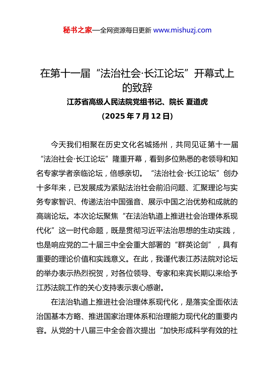 秘书之家—全网资源每日更新 www.mishuzj.com在第十一届“法治社会·长江论坛”开幕式上的致辞江苏省高级人民法院党组书记、院长 夏道虎(2025 年 7 月 12 日)今天我们相聚在历史文化名城扬州,共同见证第十一届“法治社会·长江论坛”隆重开幕,看到多位熟悉的老领导和知名专家学者亲临论坛,倍感亲切。“法治社会·长江论坛”创办十多年来,已发展成为紧贴法治社会前沿问题、汇聚理论与实务专家智识、传递法治中国强音、展示中国之治优势和成就的高端论坛。本次论坛聚焦“在法治轨道上推进社会治理体系现代化”这一时代命题,既是贯彻习近平法治思想的生动实践,也是响应党的二十届三中全会重大部署的“群英论剑”,具有重要的理论价值和实践意义。在此,我谨代表江苏法院对论坛的举办表示热烈祝贺,对各位领导、专家和来宾长期以来给予江苏法院工作的关心支持表示衷心感谢。在法治轨道上推进社会治理体系现代化,是落实全面依法治国基本方略、推进国家治理体系和治理能力现代化的重要内容。从党的十八届三中全会首次提出“加快形成科学有效的社秘书之家—全网资源每日更新 www.mishuzj.com会治理体制”,到党的二十届三中全会专项部署“健全社会治理体系”,我们党对社会治理规律的认识不断深化,推动了中国特色社会治理的实践创新、理论创新、制度创新,书写了经济快速发展和社会长期稳定“两大奇迹”新篇章。习近平总书记不仅对坚持全面依法治国、在法治轨道上推进国家治理体系和治理能力现代化有系列重要论述,而且对司法机关担负社会治理重大责任有系列重要论述,强调中国有 14亿人口,我国国情决定了不能成为诉讼大国,必须抓前端治未病,必须坚持和发展新时代“枫桥经验”,必须把非诉讼纠纷解决机制挺在前面。不仅如此,习近平总书记还赋予江苏“在强化基层治理和民生保障上走在前”“在推进社会治理现代化上实现新提升”的重大任务。江苏省委坚定贯彻习近平总书记重要指示,由省领导牵头开展专题调研,出台加强基层社会治理专门行动方案,强力推进综治中心规范化建设,江苏人大出台《江苏省预防化解矛盾纠纷条例》,为推进社会治理法治化提供有力制度保障。江苏法院坚持“办案就是治理”,在维护社会安全稳定、优化法治化营商环境、强化民生司法保障、维护社会公平正义等方面全面依法履职尽责,努力将社会主义法治优势转化为国家治理效能,以司法之力推动良法善治。近年来,江苏法院抓的一项重要工作就是坚持和发展新时代“枫桥秘书之家—全网资源每日更新 www.mishuzj.com经验”,抓前端、治未病,推动构建“源头预防化解、诉中实质解纷、诉后延伸治理”工作新格局。一是在诉前坚持多元共治,推动矛盾纠纷预防化解。全省 109 家基层法院主动融入综治中心规范化建设,目前已全部实现与县级综治中心对接,还在镇、村两级综治中心和行业协会建成 5685 个在线“融合法庭”,借助“一根线、一张网、一块屏”,实时提供调解指导、业务培训、普法宣传等服务,与扬州大学共建江苏调解学院,联合 15 家省级单位深入推进在线诉调对接机制建设,全省 480个调解组织、1809 个调解员入驻人民法院调解平台,推动把大量矛盾纠纷化解在基层、化解在萌芽状态,近两年诉前成功调解矛盾纠纷均超 100 万件,去年首次实现各类新收一审案件全面下降。二是在诉中强化实质解纷,努力做到案结事了人和。坚持“如我在诉”,强化定分止争,积极引导立案后先行调解,今年以来全省法院开展先行调解 29.8 万件,调解成功 17 万件,均居全国前列;对不能调解结案的,也力求实质解纷,防止程序空转,强化释法说理,解“法结”化“心结”。去年全省法院一审服判息诉达 90.53%,二审后达 98.19%。对类型化、群体性纠纷,我们推行“示范裁判+集中调处”机制,出台示范裁判工作指南,选取典型案件作出示范裁判,推动关联纠纷以非诉方式集中批量化解。在一起小区业主集体索赔逾期交房违秘书之家—全网资源每日更新 www.mishuzj.com约金案中,择取 2 件作出判决,促成开发商与其他 1168 户业主参照判决达成和解。三是在诉后落实标本兼治,促进提升社会治理效能。注重发挥司法...