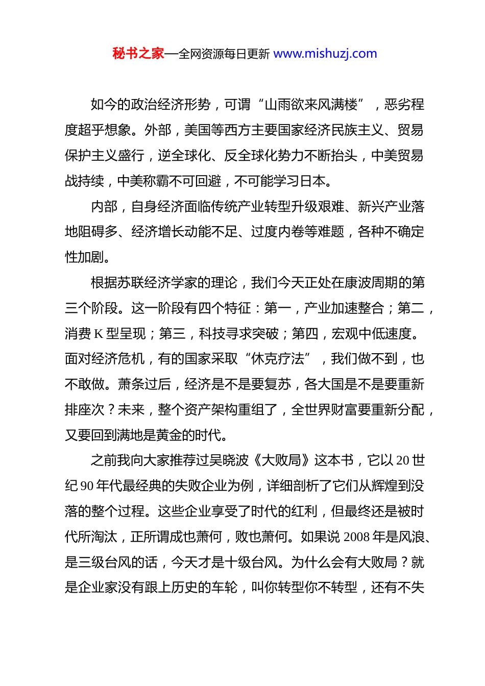 秘书之家—全网资源每日更新 www.mishuzj.com救世主太遥远,唯有自我救赎——在公司上半年工作会议上的讲话(摘要)蒋杰(2025 年 7 月 19 日)各位同仁:大家上午好!今天,我们在这里召开公司上半年工作会议全体中高管齐聚一堂,全面总结复盘公司上半年业绩情况,剖析市场环境和行业趋势。在这里,我只是作一个引导性的报告,作为引子,以期抛砖引玉,希望各业务线分组讨论,思考一下未来的发展和下半年的工作。今天我讲话的主题是《救世主太遥远,唯有自我救赎》。首先,推荐一部电视剧给大家——《天道》,该剧作者段位之高、格局之大甚为罕见,见过太多、知道太多,台词鞭辟入里,字字珠玑,剧作文本的深度和高度非一般阅历见地的人可写,估计多少年内难再有了。所以,若大家不懂商业、不懂人性,可以多看看书、多学习,老不信、老不信,就变成“老百姓”,书上讲得清清楚楚、明明白白。一、当前形势空前严峻,但未来长期看好秘书之家—全网资源每日更新 www.mishuzj.com如今的政治经济形势,可谓“山雨欲来风满楼”,恶劣程度超乎想象。外部,美国等西方主要国家经济民族主义、贸易保护主义盛行,逆全球化、反全球化势力不断抬头,中美贸易战持续,中美称霸不可回避,不可能学习日本。内部,自身经济面临传统产业转型升级艰难、新兴产业落地阻碍多、经济增长动能不足、过度内卷等难题,各种不确定性加剧。根据苏联经济学家的理论,我们今天正处在康波周期的第三个阶段。这一阶段有四个特征:第一,产业加速整合;第二,消费 K 型呈现;第三,科技寻求突破;第四,宏观中低速度。面对经济危机,有的国家采取“休克疗法”,我们做不到,也不敢做。萧条过后,经济是不是要复苏,各大国是不是要重新排座次?未来,整个资产架构重组了,全世界财富要重新分配,又要回到满地是黄金的时代。之前我向大家推荐过吴晓波《大败局》这本书,它以 20 世纪 90 年代最经典的失败企业为例,详细剖析了它们从辉煌到没落的整个过程。这些企业享受了时代的红利,但最终还是被时代所淘汰,正所谓成也萧何,败也萧何。如果说 2008 年是风浪、是三级台风的话,今天才是十级台风。为什么会有大败局?就是企业家没有跟上历史的车轮,叫你转型你不转型,还有不失秘书之家—全网资源每日更新 www.mishuzj.com败的?看了《大败局》才知道,原来死了那么多老板!比尔·盖茨曾告诫微软的高管们:“微软离破产永远只有180 天”。所有的企业家都是睡不着觉的。诺基亚、摩托罗拉呢?柯达、富士胶卷呢?你不转型,那你只有死亡。所以比尔·盖茨真的不是危言耸听。我们必须清醒地认识到,我们正处在一个大变革的时代。医药行业、CRO 行业的一场残酷无情的淘汰赛已经拉开序幕。仿制药自身内卷化、立项数量断崖下跌、B 证签发收严以及创新药融资寒冬,行业的供求关系发生根本转变,行业竞争加剧,大多数药厂难以生存。仿制药一致性评价红利及创新药时代,随便一家 CRO 都能“风口起舞”,现在僧多粥少,才是真正考验 CRO 实力与商业模式的时候。不是要不要卷的问题,是谁还有资格卷的问题?未来 5 年内过剩产能会持续出清,CRO 破产与转型并存。一些早期具有一定区域影响力的 CRO 正在悄然消失,有分析指出,未来 5 年内过剩产能会持续出清,CRO 破产与转型并存,很多公司已经把 CRO 砍掉了、不做了。中国医药产业的创新加速,创新药将是我们和美国竞争的一个热门战场,创新药 CRO 一定会有机会。整个医药行业都要重构。所以未来国标一定要往创新药方向转型。在今天,创新秘书之家—全网资源每日更新 www.mishuzj.com药基本等同于生物药。我们反躬自省,现在面临的复杂局面和经营压力前所未有竞争日趋白热化,政策调整变动频仍,导致公司增长明显放缓,同时我们的团队素质、管理能力、技术水平、人才厚度等离优秀企业还存在着较明显的差距和短板,效率远低于对手,严重制约了公司发展。部分核心管理者依然没有做到居安思危,处于麻木状态,长期对问题视而不见,行动更多只是停留在口头上,一旦落实到具体行动,便畏首畏尾、瞻前顾后、窝窝囊囊。今天的核心内容是“三个必须”...