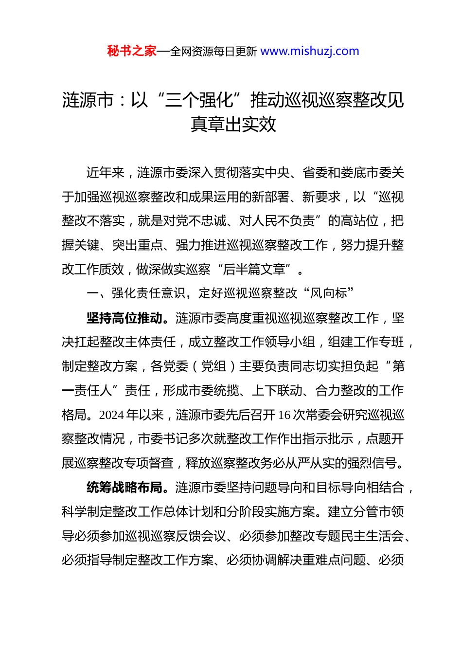 秘书之家—全网资源每日更新 www.mishuzj.com涟源市:以“三个强化”推动巡视巡察整改见真章出实效近年来,涟源市委深入贯彻落实中央、省委和娄底市委关于加强巡视巡察整改和成果运用的新部署、新要求,以“巡视整改不落实,就是对党不忠诚、对人民不负责”的高站位,把握关键、突出重点、强力推进巡视巡察整改工作,努力提升整改工作质效,做深做实巡察“后半篇文章”。一、强化责任意识,定好巡视巡察整改“风向标”坚持高位推动。涟源市委高度重视巡视巡察整改工作,坚决扛起整改主体责任,成立整改工作领导小组,组建工作专班,制定整改方案,各党委(党组)主要负责同志切实担负起“第一责任人”责任,形成市委统揽、上下联动、合力整改的工作格局。2024 年以来,涟源市委先后召开 16 次常委会研究巡视巡察整改情况,市委书记多次就整改工作作出指示批示,点题开展巡察整改专项督查,释放巡察整改务必从严从实的强烈信号。统筹战略布局。涟源市委坚持问题导向和目标导向相结合,科学制定整改工作总体计划和分阶段实施方案。建立分管市领导必须参加巡视巡察反馈会议、必须参加整改专题民主生活会、必须指导制定整改工作方案、必须协调解决重难点问题、必须秘书之家—全网资源每日更新 www.mishuzj.com报告履职督促情况的“五必须”督导机制。加强联动督导。涟源市委注重发挥各部门之间的协作配合,形成合力推进巡视巡察整改工作。在整改工作中涉及到多部门的问题和困难,及时沟通协商解决,共同推动整改工作取得实效。同时通过听取汇报、实地走访、查阅资料等方式精细化督导整改工作,发现问题立即提醒督促,及时进行整改,确保整改“不悬空”“不走空账”。十三届市委书记点人点事 58 件、意见建议书 35 条,全部办结。二、强化结果导向,评好巡视巡察整改“质效卷”科学设置评价标准。坚持客观公正、注重实效原则,制定巡察评估问卷,全面准确评估整改情况,推动问题整改落到实处、取得实效,为巡视巡察整改评估销号工作科学化、规范化、标准化开展奠定良好基础。2024 年上半年,发放 11 家整改责任单位评估问卷 237 份,99.5%认为巡察整改带来明显变化。探索建立“五方会审”。由市委巡察办牵头,市纪委监委、市委组织部、市委宣传部、市委巡察组参与,按照措施与效果、定量与定性、客观与主观、集中整改成效与长期整改预期相结合的“四结合”原则,采取个别谈话了解、下沉一线察访等方式开展评估。巡察整改成效评估坚持“让群众说了算”,群众不满意的坚决不过关,真正让群众成为名符其实的“阅卷人”。秘书之家—全网资源每日更新 www.mishuzj.com坚持以责促效。根据整改评估情况,对整改不力的责任单位班子成员和巡察工作开展不力的工作人员严肃问责追责,向分管市领导制发《工作提示》。2024 年上半年,市委巡察工作领导小组约谈整改不力的责任单位班子成员 8 人次,工作有欠缺的正副组长 4 人次,制发《工作提示》21 份,对后续整改不力的 3 家单位扣除 2023 年度“党风廉政建设和反腐”工作绩效考核相应分值。三、强化成果运用,打好巡视巡察整改“组合拳”边巡边改暖民心。涟源市委将群众反映集中、能够及时解决的问题纳入“立行立改”事项,及时解决路难走、钱难拿、门难进等群众“急难愁盼”问题 135 余件,以立竿见影的巡察成效践行以人民为中心的价值取向。堵塞漏洞强监督。十三届市委巡察以来,围绕行政执法、保障性住房、校园有偿服务等重点领域,推动开展专项治理 12项,针对农村集体“三资”管理混乱的共性问题,推动开展集中整治,涉及金额 765 万余元。标本兼治促发展。加强对制约巡察高质量发展、涉及体制机制障碍等深层次问题综合分析研判,先后完善编印《巡视巡察政治理论学习资料汇编》《十三届市委第六轮巡察工作指南》等相关文件,完善村(社区)党组织“四个聚焦”监督重秘书之家—全网资源每日更新 www.mishuzj.com点细化清单 51 条、农村集体“三资”管理监督重点细化清单 29条,推动健全完善内控制度 4 个。截至今年 6 月,十三届市委前四轮巡察反馈问题 3535 个,整改完成率 94.7%。