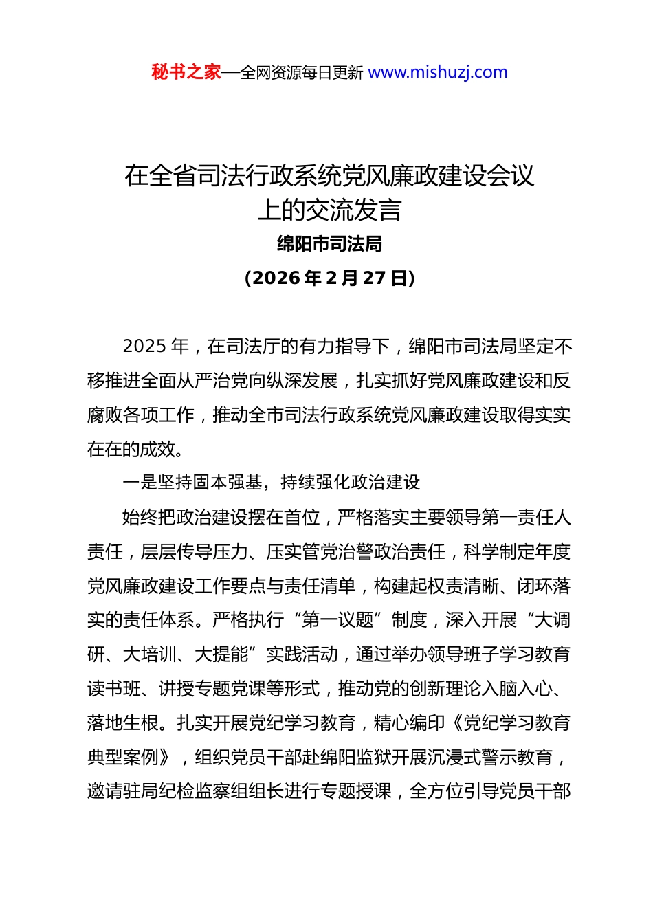 秘书之家—全网资源每日更新 www.mishuzj.com在全省司法行政系统党风廉政建设会议上的交流发言绵阳市司法局(2026 年 2 月 27 日)2025 年,在司法厅的有力指导下,绵阳市司法局坚定不移推进全面从严治党向纵深发展,扎实抓好党风廉政建设和反腐败各项工作,推动全市司法行政系统党风廉政建设取得实实在在的成效。一是坚持固本强基,持续强化政治建设始终把政治建设摆在首位,严格落实主要领导第一责任人责任,层层传导压力、压实管党治警政治责任,科学制定年度党风廉政建设工作要点与责任清单,构建起权责清晰、闭环落实的责任体系。严格执行“第一议题”制度,深入开展“大调研、大培训、大提能”实践活动,通过举办领导班子学习教育读书班、讲授专题党课等形式,推动党的创新理论入脑入心、落地生根。扎实开展党纪学习教育,精心编印《党纪学习教育典型案例》,组织党员干部赴绵阳监狱开展沉浸式警示教育,邀请驻局纪检监察组组长进行专题授课,全方位引导党员干部秘书之家—全网资源每日更新 www.mishuzj.com筑牢思想防线、严守纪法底线。二是坚持正风肃纪,推动党风廉政向好发展以严的基调强化正风肃纪,深入开展中央八项规定精神学习教育专项整治,修订完善请销假、差旅费管理等内部管理制度,全面排查廉政风险点并精准制定防控措施,扎紧制度笼子。扎实开展“廉政警示教育月”活动,创新打造“法治+廉政”特色文化品牌,以文化浸润涵养清风正气。强化日常监督管理,常态化开展纪律建设专项督查,规范召开领导干部述责述廉会议,以严格监督倒逼责任落实、作风转变。三是聚焦行业监管,全面提升法律服务质效紧扣市委“党建惠企”工作部署,主动担当作为,率先设立涉外法治工作科,成立市公证行业党委,全面推进收费标准、投诉电话等服务信息公开,以透明化管理提升服务公信力。聚焦重点领域强化监督制约,充分发挥行政复议监督职能,持续规范涉企行政执法行为,深入推进“亮码入企+综合查一次”改革试点,助力优化营商环境。畅通群众监督与服务渠道,精心开展新春法援赶百集、根治欠薪等便民利民活动,以优质高效的法律服务践行党风廉政建设成效。