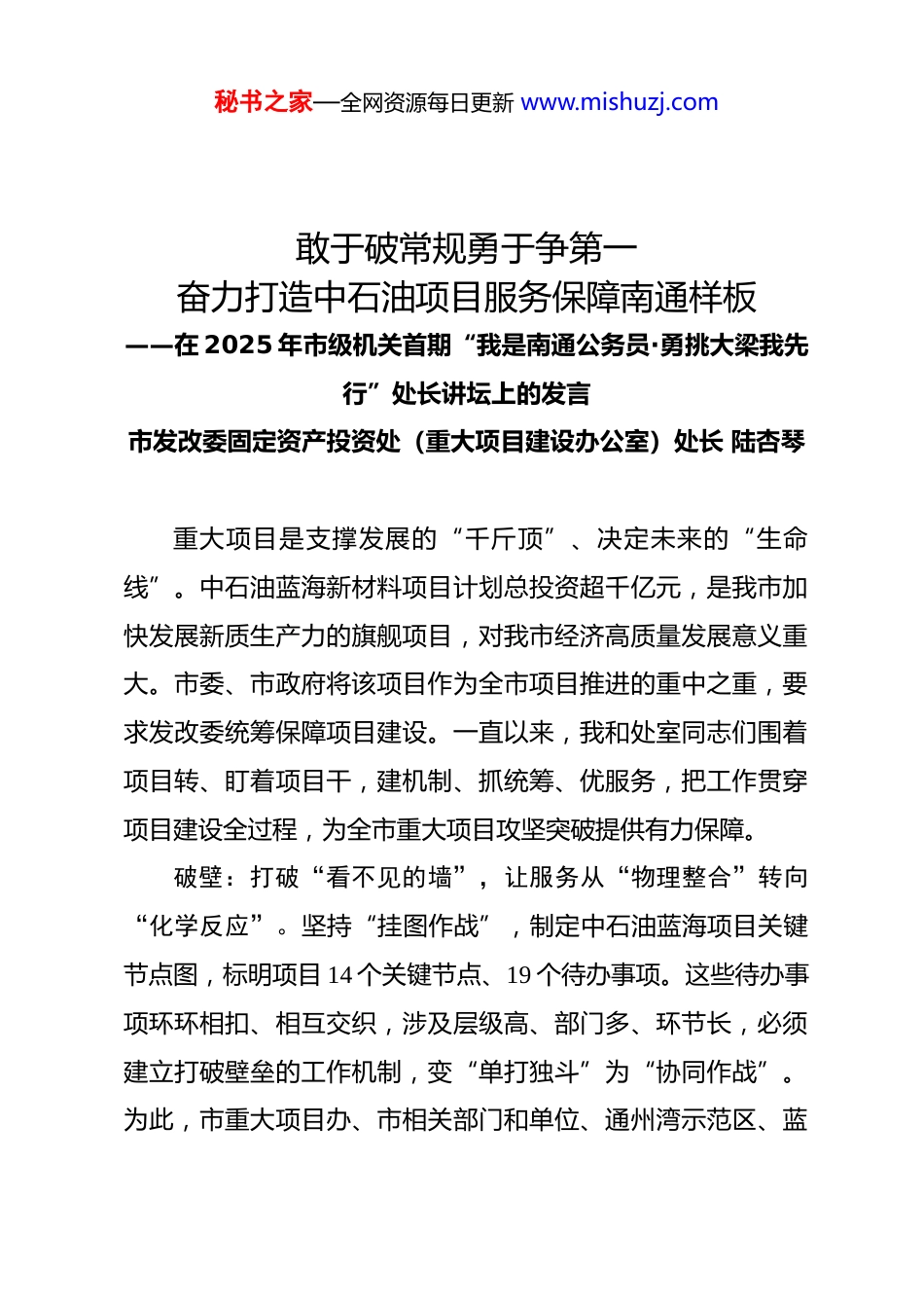 秘书之家—全网资源每日更新 www.mishuzj.com敢于破常规勇于争第一奋力打造中石油项目服务保障南通样板——在 2025 年市级机关首期“我是南通公务员·勇挑大梁我先行”处长讲坛上的发言市发改委固定资产投资处(重大项目建设办公室)处长 陆杏琴重大项目是支撑发展的“千斤顶”、决定未来的“生命线”。中石油蓝海新材料项目计划总投资超千亿元,是我市加快发展新质生产力的旗舰项目,对我市经济高质量发展意义重大。市委、市政府将该项目作为全市项目推进的重中之重,要求发改委统筹保障项目建设。一直以来,我和处室同志们围着项目转、盯着项目干,建机制、抓统筹、优服务,把工作贯穿项目建设全过程,为全市重大项目攻坚突破提供有力保障。破壁:打破“看不见的墙”,让服务从“物理整合”转向“化学反应”。坚持“挂图作战”,制定中石油蓝海项目关键节点图,标明项目 14 个关键节点、19 个待办事项。这些待办事项环环相扣、相互交织,涉及层级高、部门多、环节长,必须建立打破壁垒的工作机制,变“单打独斗”为“协同作战”。为此,市重大项目办、市相关部门和单位、通州湾示范区、蓝秘书之家—全网资源每日更新 www.mishuzj.com海项目方成立联合工作专班,建立诉求直报、交办督办、节点把控、常态报告“四项机制”。具体工作中,我们与蓝海项目方扁平化对接、常态化互动,及时收集新情况新问题,分级分类即时交办,相关部门按照“部门长+分管负责人+业务处室负责人”建立服务架构,全力推进交办事项。专班每周调度,联合研判办理情况,对进展顺利的亮绿灯,缓慢的亮黄灯、落后的亮红灯。一月一专报、急事即汇报,实现清单管理、销号办结。目前,28 个部门、52 个处室、156 人的工作架构正高效运转,形成了快速响应、责任清晰、融合推进的良性循环。突围:用“尖兵姿态”攻坚,将“不可能”变为“超预期”。围绕蓝海项目推进中“最难啃的硬骨头”列出“任务清单”,园区认定、乙烯纳规、资金争取……几乎每一条都需要国家、省等多方协调,时间紧、任务重,各责任部门和单位正在全力攻坚突破。区域供水平海线通州湾支线是保障蓝海项目用水的“关键十公里”,资金来源主要靠向上争取。我们靠前服务,多次赴国家、省发改委汇报情况,申报政策资金支持。积极寻找突破口,对服务区范围内已有供水管道进行梳理分析,从新建管道替换已有管道,实现供水能力显著提升的角度,挖掘项目更新改造的属性,全力汇报争取,最终获批资金 8713 万元,即将开工建设。同时,在地方财政紧平衡的状态下,我们秘书之家—全网资源每日更新 www.mishuzj.com抢抓政策机遇,积极向上争取,去年成功为蓝海项目配套基础设施建设争取到 10 亿元地方政府专项债券,有力保障了项目资金需求。护航:与项目“并肩奔跑”,让服务有力度更有温度。当前,中石油蓝海项目正处于滚石上山的关键期,我们几乎每周到项目现场,了解项目推进情况和存在困难。每次看到 4 平方公里的土地上塔吊林立、机器轰鸣,建设进度日新月异,都会由衷感到震撼和振奋!作为中石油集团的“一号工程”,集团对蓝海项目寄予厚望,从 3 月开始项目建设全面提速,所有工作马力全开,我们的服务保障也在全速跟进。同时,中石油项目现场有 300 名管理人员和 3000 名施工人员,不久将会有 8000人同时参与建设,其中不乏很多高校毕业的大学生,得知情况后,我们立即对接市妇联,准备在今年七夕组织机关单位和中石油项目部开展联谊活动,为他们干在南通、留在南通创造条件。对于一个有着梦想的企业,和一个跨越发展的城市,这是一次彼此共赢的战斗,一场绝不能错付的“长跑”。我们有幸参与其中,当竭尽全力与项目一起并肩奔跑、全程护航。在蓝海项目推进过程中,我们也认识到还存在一些不足,责任链条还需进一步压紧、节点控制还需更加精准。下一步,重大项目秘书之家—全网资源每日更新 www.mishuzj.com办将挺膺担当、事不避难,进一步打造中石油蓝海项目服务样板。一是全域协同推进。健全联动服务保障机制,进一步提升部门间、部门和板块间、板块和项目方工作合力。二是加力攻坚突破。加强穿透式调度,推动各地各部...