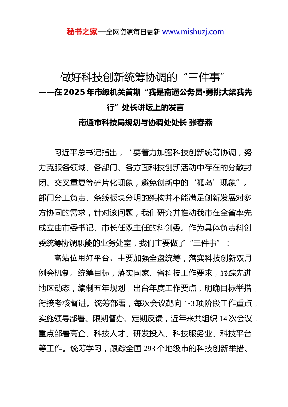 秘书之家—全网资源每日更新 www.mishuzj.com做好科技创新统筹协调的“三件事”——在 2025 年市级机关首期“我是南通公务员·勇挑大梁我先行”处长讲坛上的发言南通市科技局规划与协调处处长 张春燕习近平总书记指出,“要着力加强科技创新统筹协调,努力克服各领域、各部门、各方面科技创新活动中存在的分散封闭、交叉重复等碎片化现象,避免创新中的‘孤岛’现象”。部门分工负责、条线板块分明的架构并不能满足创新发展对多方协同的需求,针对该问题,我们研究并推动我市在全省率先成立由市委书记、市长任双主任的科创委。作为具体负责科创委统筹协调职能的业务处室,我们主要做了“三件事”:高站位用好平台。主要加强全盘统筹,落实科技创新双月例会机制。统筹目标,落实国家、省科技工作要求,跟踪先进地区动态,编制五年规划,出台年度工作要点,明确目标举措,衔接考核督进。统筹部署,每次会议靶向 1-3 项阶段工作重点,实施领导部署、限期督办、定期反馈,近年来共组织 14 次会议,重点部署高企、科技人才、研发投入、科技服务业、科技平台等工作。统筹学习,跟踪全国 293 个地级市的科技创新举措、秘书之家—全网资源每日更新 www.mishuzj.com政策,建立创新生态“萤光涌现”项目库,定期形成专报、报告供决策参考;创新会议模式,从市内开会“学习互鉴”升级为赴上海、苏南取“他山之石”,实施“研究部署+学习借鉴+科技招商”,签订合作项目 50 余个,丰富会议成果。沉一线抽丝剥茧。主要加强研究分析,提出解决工作短板的路径。面对市县财政分离导致对下科技管理难触底的问题,研究出台《南通市企业科技创新活力积分评估工作规则(试行)》,搭建信息平台,实施企业科技创新活力积分管理,实现政策“一张清单”、管理“一个系统”和活力“一个榜单”。面对高企增幅落后于先进地区的问题,走访服务机构、申报企业和板块、园区,找出缺乏新项目导入这一隐藏根源,研究出台《关于加快推进全市科技招商工作的实施意见》,成功推动该项工作的落地实施,近几年全市招引 4276 个科创项目,转化成为高企 476 个,为实现高企总量增幅持续全省领先奠定前期基础。多角度聚拢资源。主要加强沟通对接,提升可统筹分配资源总量。向上沟通争取,协调争取国家部委项目;对接上海“富矿”,推动市政府与上海科委续签《沪通深化科技创新全面战略合作协议》,与上海普陀签订《合作备忘录》《合作框架协议》,组织长江口产业创新协同对接会等活动十余场。主秘书之家—全网资源每日更新 www.mishuzj.com动参与招商源头引荐,并推动申琅生物、科缔思生物等数十家科创企业实际落地。马克思主义科技学说认为“科学是一种在历史上起推动作用的、革命的力量”。习近平总书记强调“积极培育新能源、新材料、先进制造、电子信息等战略性新兴产业,积极培育未来产业,加快形成新质生产力,增强发展新动能”,把“科技是第一生产力”推进到通过创新驱动实现生产力能级跃升的新阶段,深刻回应了马克思主义生产力理论在数智时代的创新需求。科技创新统筹协调,就是通过深化改革、重点部署,以制度为保障、以需求为导向、以企业为主体,推动科技创新与产业创新深度融合,形成“创新驱动-产业升级-生产力跃迁”的良性循环,加快发展新质生产力,推动经济高质量发展。接下来,我们将做好“三件事”。一是加强制度保障“补缺堵漏”。推动设立科技咨询委员会,形成“核心决策+专业支撑”架构,补齐统筹机制依赖领导决策的短板。研究出台“飞地孵化”“收益共享”等跨区域协同试行机制,畅通要素资源流动。二是围绕需求导向“精准滴灌”。围绕市场需求,组织开展“十五五”科技创新大调查,科学编制规划,建立“规划-反馈-迭代”闭环。靶向科技招商、未来产业培育等城市发展需求,研究推动与其他上海城区、苏南城市的创新合作,以南通优质承秘书之家—全网资源每日更新 www.mishuzj.com载对接上海、苏南企业发展需求。三是推动企业主体“量质并重”。深度嵌入板块、园区生物医药等未来产业科技招商工作,蓄积科创企业源头“活水”。为龙头企业协调项目资源,组织企业参加科技创新双月例...