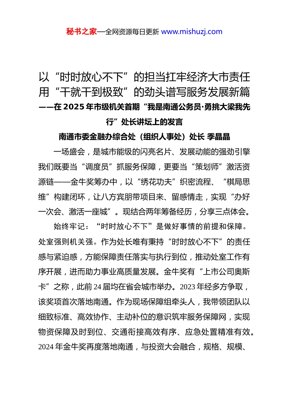 秘书之家—全网资源每日更新 www.mishuzj.com以“时时放心不下”的担当扛牢经济大市责任用“干就干到极致”的劲头谱写服务发展新篇——在 2025 年市级机关首期“我是南通公务员·勇挑大梁我先行”处长讲坛上的发言南通市委金融办综合处(组织人事处)处长 季晶晶一场盛会,是城市能级的闪亮名片、发展动能的强劲引擎我们既要当“调度员”抓服务保障,更要当“策划师”激活资源链——金牛奖筹办中,以“绣花功夫”织密流程、“棋局思维”构建闭环,让八方宾朋带项目来、留感情走,实现“办好一次会、激活一座城”。现结合两年筹备经历,分享三点体会。始终牢记:“时时放心不下”是做好事情的前提和保障。处室强则机关强。作为处长唯有秉持“时时放心不下”的责任感与紧迫感,方能保障责任落实与执行到位,推动处室工作有序开展,进而助力事业高质量发展。金牛奖有“上市公司奥斯卡”之称,此前 24 届均在省会城市举办。2023 年经多方争取,该奖项首次落地南通。作为现场保障组牵头人,我带领团队以细致标准、高效协作、主动补位的意识筑牢服务保障网,实现物资保障及时到位、交通衔接高效有序、应急处置精准有效。2024 年金牛奖再度落地南通,与投资大会融合,规格、规模、秘书之家—全网资源每日更新 www.mishuzj.com难度均创历史新高。作为筹备总牵头人,我既追求“事经我手无差错”的极致标准,更涵养“事谋全局有章法”的系统思维,超前谋划部署,科学分工协作,从嘉宾、市领导、时空等多维度排出 9 方面 46 道工序,逐项落实到百余名工作人员,确保为每位嘉宾提供细致周到服务。为做到在规范前提下取得突破,实现多方共赢,我们在吃透政策基础上,科学编制预算、规范执行采购程序、全程把控支出,实际支出较前年两活动总支出显著降低。经多轮打磨,在中证报主导议程中植入市情推介、基金签约、项目路演等环节,达到“润物无声”的宣传效果。始终坚信:实干是最好的方法论,担当是最好的精气神。秉持“实干为要、担当为先”理念,在破解发展难题中锤炼本领,在守正创新中探索新路径,努力推动各项工作从“物理叠加”向“化学反应”跃升。上市公司金牛奖是“送上门的宝贵资源”。为用好宝贵资源,进一步放大活动成效,在活动组织上我们实现了三个转变。以求实效为导向,从“我有什么”向“我要什么”转变,聚焦上市公司对区域经济综合带动作用,不再采取组织参会嘉宾赴各板块参观模式,转而于活动次日组织上市公司、投资机构与本地企业开展路演,切实提升资源配置精准性与实效性。以提质效为目标,从“以我为主”向“以板块为主”转变,前年虽搭建了板块与上市公司对接渠道,但秘书之家—全网资源每日更新 www.mishuzj.com未结合企业特点与区域优势制定个性化方案、精准对接和后续跟踪都不够。去年我们细化分类、精准匹配,压实板块对接服务与跟踪推进责任,有效提升了招商活动组织效能。以情感联结为纽带,从“被动留企”向“主动共融”转变,前年因准备不充分,出现多头联系、板块争抢等无序现象。去年,我们想方设法提前获取参会企业信息,为板块与企业联络感情留足时间空间,科学指导板块有序开展嵌入式服务,实现了参会嘉宾从被动接受安排到主动走进南通的转变。通过持续努力,多个上市公司产业项目陆续签约落地,这正是金牛奖赋能南通的核心成效。始终践行:小我融入大我,以炽热情怀服务发展大局。以“功成不必在我”的境界胸怀大局,以“功成必定有我”的担当创新突破。金牛奖连续两年在南通成功举办,累计吸引千余家上市公司、投资机构来通,多位院士分享前沿趋势。为提升今年活动质效,我将重点优化三个方面:精细化,梳理近五年获奖名单,筛选出近百家高频获奖重点企业;分析两年数据,提升食宿行预估精准度;逐项评估形成嘉宾信息管理签署保密协议、重要嘉宾接待提前设计专项调研方案等优化举措。特色化,提前谋划活动方案,深度融入南通元素,前延后伸活动日程,增强与中证报协商方案主导性。智慧化,针对传统会务流秘书之家—全网资源每日更新 www.mishuzj.com程碎片化、协同效率低等痛点,创新研发多模块智慧办会系统,可实现接待任务精准派单、...