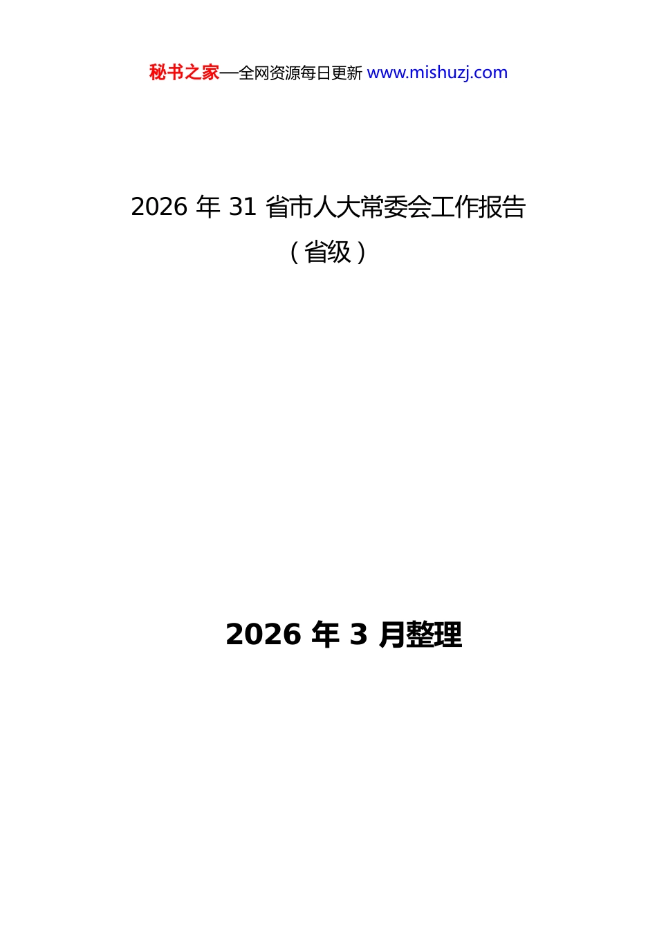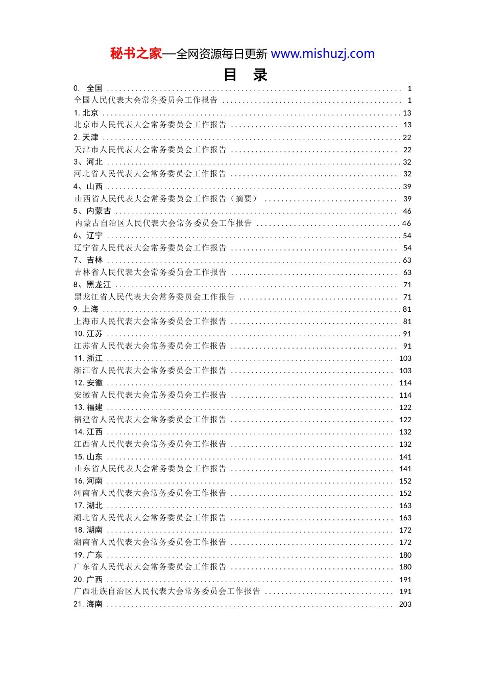 秘书之家—全网资源每日更新 www.mishuzj.com2026 年 31 省市人大常委会工作报告(省级)2026 年 3 月整理秘书之家—全网资源每日更新 www.mishuzj.com目 录0. 全国 ........................................................................ 1全国人民代表大会常务委员会工作报告 ............................................ 11.北京 .........................................................................13北京市人民代表大会常务委员会工作报告 ......................................... 132.天津 .........................................................................22天津市人民代表大会常务委员会工作报告 ......................................... 223、河北 ........................................................................32河北省人民代表大会常务委员会工作报告 ......................................... 324、山西 ........................................................................39山西省人民代表大会常务委员会工作报告(摘要) ................................ 395、内蒙古 ..................................................................... 46内蒙古自治区人民代表大会常务委员会工作报告 ...................................466、辽宁 ........................................................................54辽宁省人民代表大会常务委员会工作报告 ......................................... 547、吉林 ........................................................................63吉林省人民代表大会常务委员会工作报告 ......................................... 638、黑龙江 ..................................................................... 71黑龙江省人民代表大会常务委员会工作报告 ....................................... 719.上海 .........................................................................81上海市人民代表大会常务委员会工作报告 ......................................... 8110.江苏 ........................................................................91江苏省人民代表大会常务委员会工作报告 ......................................... 9111.浙江 ...................................................................... 103浙江省人民代表大会常务委员会工作报告 ........................................ 10312.安徽 ...................................................................... 114安徽省人民代表大会常务委员会工作报告 ........................................ 11413.福建 ...................................................................... 122福建省人民代表大会常务委员会工作报告 ........................................ 12214.江西 ...................................................................... 132江西省人民代表大会常务委员会工作报告 ........................................ 13215.山东 ...................................................................... 141山东省人民代表大会常务委员会工作报告 ........................................ 14116.河南 ...................................................................... 152河南省人民代表大会常务委员会工作报告 ........................................ 15217.湖北 ...................................................................... 163湖北省人民代表大会常务委员会工作报告 ........................................ 16318.湖南 ...................................................................... 172湖南省人民代表大会常务委员会工作报告 ........................................ 17219.广东 ......