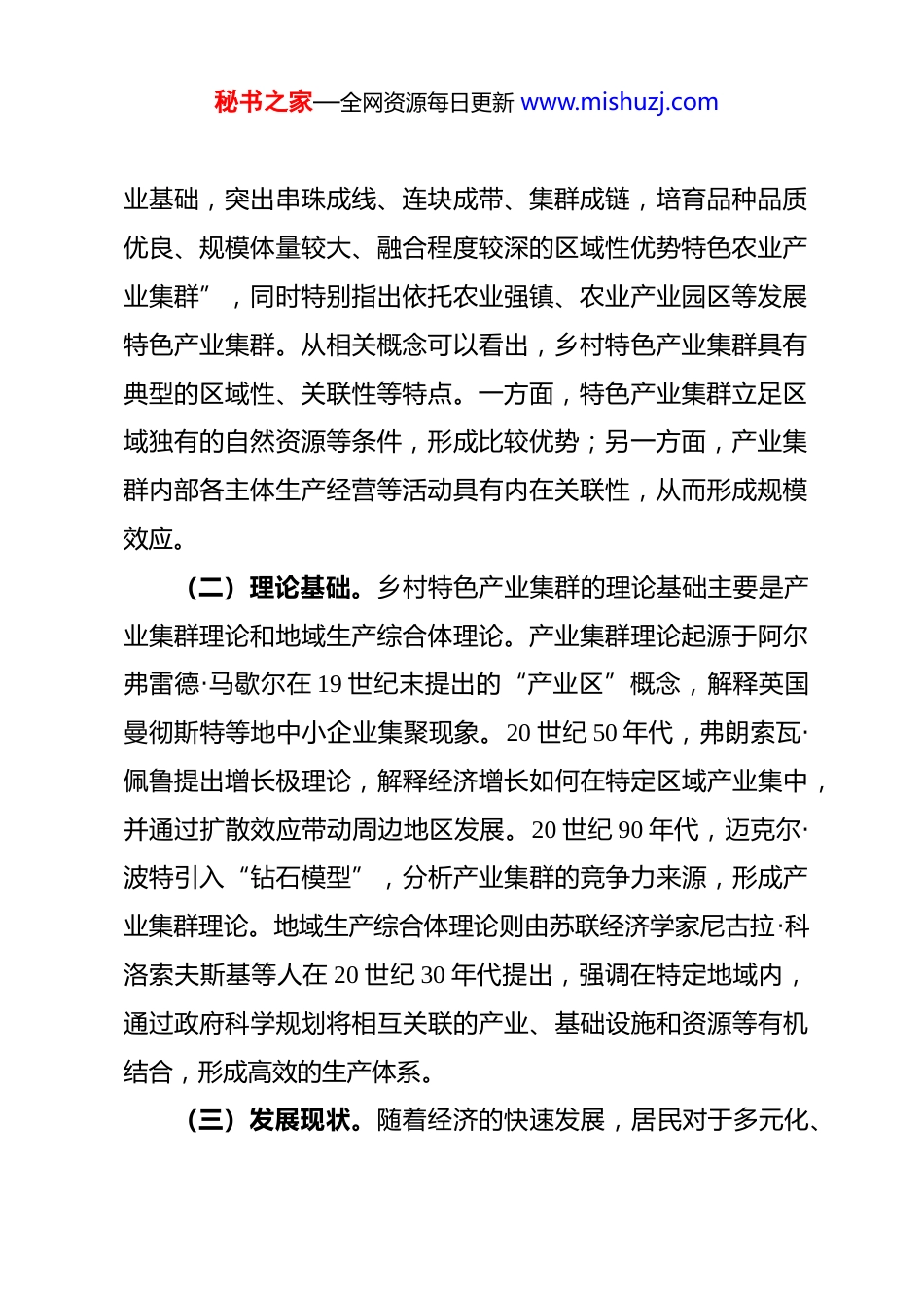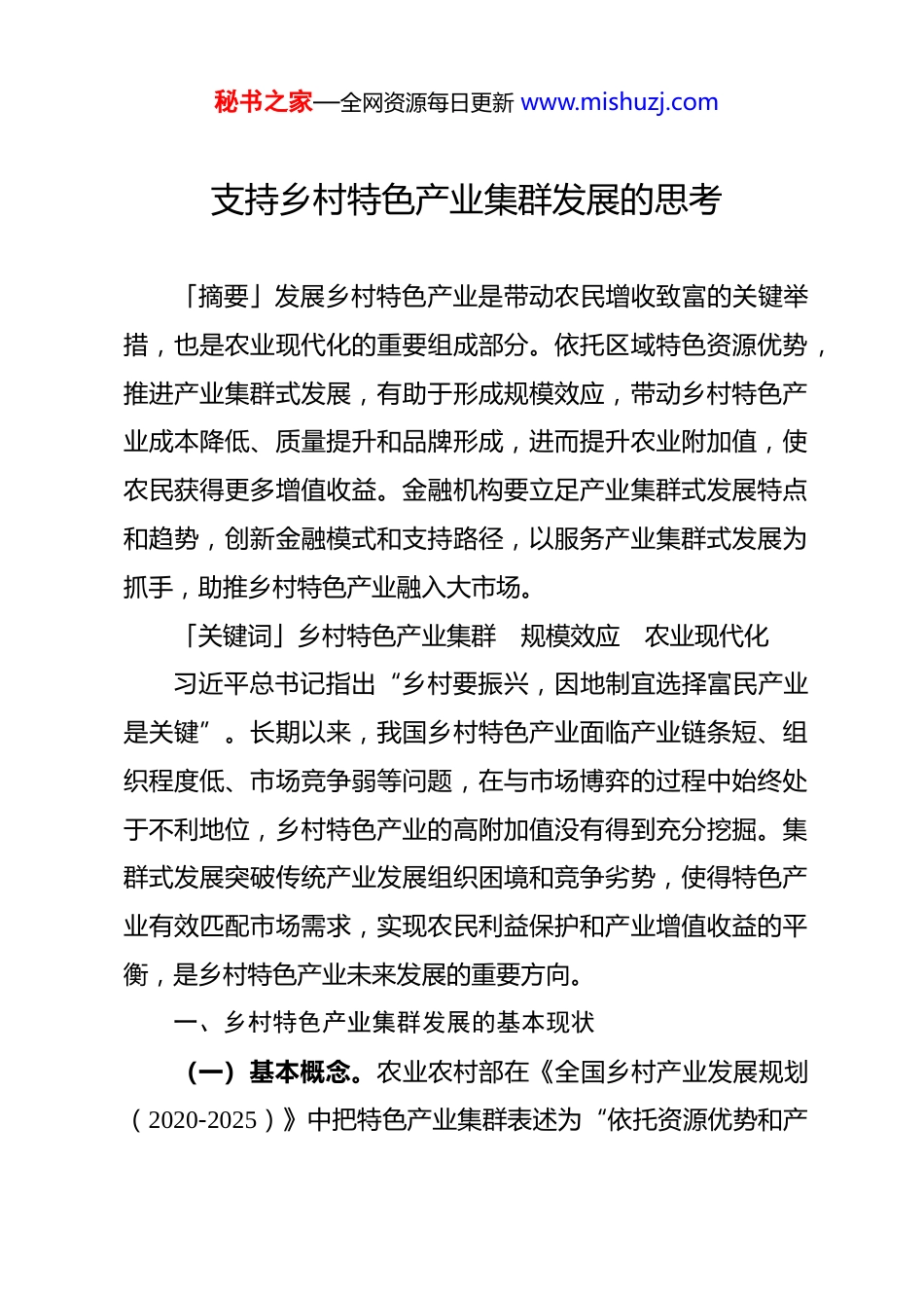 秘书之家—全网资源每日更新 www.mishuzj.com支持乡村特色产业集群发展的思考「摘要」发展乡村特色产业是带动农民增收致富的关键举措,也是农业现代化的重要组成部分。依托区域特色资源优势,推进产业集群式发展,有助于形成规模效应,带动乡村特色产业成本降低、质量提升和品牌形成,进而提升农业附加值,使农民获得更多增值收益。金融机构要立足产业集群式发展特点和趋势,创新金融模式和支持路径,以服务产业集群式发展为抓手,助推乡村特色产业融入大市场。「关键词」乡村特色产业集群 规模效应 农业现代化习近平总书记指出“乡村要振兴,因地制宜选择富民产业是关键”。长期以来,我国乡村特色产业面临产业链条短、组织程度低、市场竞争弱等问题,在与市场博弈的过程中始终处于不利地位,乡村特色产业的高附加值没有得到充分挖掘。集群式发展突破传统产业发展组织困境和竞争劣势,使得特色产业有效匹配市场需求,实现农民利益保护和产业增值收益的平衡,是乡村特色产业未来发展的重要方向。一、乡村特色产业集群发展的基本现状(一)基本概念。农业农村部在《全国乡村产业发展规划(2020-2025)》中把特色产业集群表述为“依托资源优势和产秘书之家—全网资源每日更新 www.mishuzj.com业基础,突出串珠成线、连块成带、集群成链,培育品种品质优良、规模体量较大、融合程度较深的区域性优势特色农业产业集群”,同时特别指出依托农业强镇、农业产业园区等发展特色产业集群。从相关概念可以看出,乡村特色产业集群具有典型的区域性、关联性等特点。一方面,特色产业集群立足区域独有的自然资源等条件,形成比较优势;另一方面,产业集群内部各主体生产经营等活动具有内在关联性,从而形成规模效应。(二)理论基础。乡村特色产业集群的理论基础主要是产业集群理论和地域生产综合体理论。产业集群理论起源于阿尔弗雷德·马歇尔在 19 世纪末提出的“产业区”概念,解释英国曼彻斯特等地中小企业集聚现象。20 世纪 50 年代,弗朗索瓦·佩鲁提出增长极理论,解释经济增长如何在特定区域产业集中,并通过扩散效应带动周边地区发展。20 世纪 90 年代,迈克尔·波特引入“钻石模型”,分析产业集群的竞争力来源,形成产业集群理论。地域生产综合体理论则由苏联经济学家尼古拉·科洛索夫斯基等人在 20 世纪 30 年代提出,强调在特定地域内,通过政府科学规划将相互关联的产业、基础设施和资源等有机结合,形成高效的生产体系。(三)发展现状。随着经济的快速发展,居民对于多元化、秘书之家—全网资源每日更新 www.mishuzj.com高价值的农产品需求量显著上升,根据统计,2023 年城镇居民人均猪肉、牛羊肉和蛋类消费量分别为 28.7 公斤、5.7 公斤和14.6 公斤,分别比 1956 年增长 3.9 倍、2.6 倍和 3.3 倍,农村居民也有类似的消费结构变化。顺应这种变化,2020 年,农业农村部等部门印发《关于开展优势特色产业集群建设的通知》(农办计财〔2020〕7 号),推动特色产业集群建设,首批确定了北京设施蔬菜、天津都市型奶业、山西旱作高粱等 50 个特色产业集群。截至 2024 年底,我国已培育产值超过 100 亿元的产业集群 158 个,产值超 10 亿元的农业产业强镇超过 390 个,涵盖稻米、油料、果蔬、畜牧、水产、中药材等多个领域,经济和社会效益显著。二、几种典型的乡村特色产业集群分析(一)基于社会资本主导的产业集群模式。产业集群发展初期,较为普遍的模式是通过“公司+农户”等模式实现产业集群市场化纵向分工,农户依托土地等自然资源进行生产种植、企业凭借市场技术优势负责加工销售,二者通过订单农业等形式构建利益联结机制,形成特色产业集群。该模式企业掌握较大话语权,农户处于相对弱势地位。为了获取更大的增值收益,近年来,农户之间呈现合作化趋势,如通过成立合作社等形式解决个体投入不足和对接市场不够等问题。截至目前,我国实秘书之家—全网资源每日更新 www.mishuzj.com行产加销一体化服务的合作社已达到 104.3 万家,以运销服务为主的合作社 10.2 万家,以加工服务为主的合作社 7.1 万家,充分说明农户自组织...