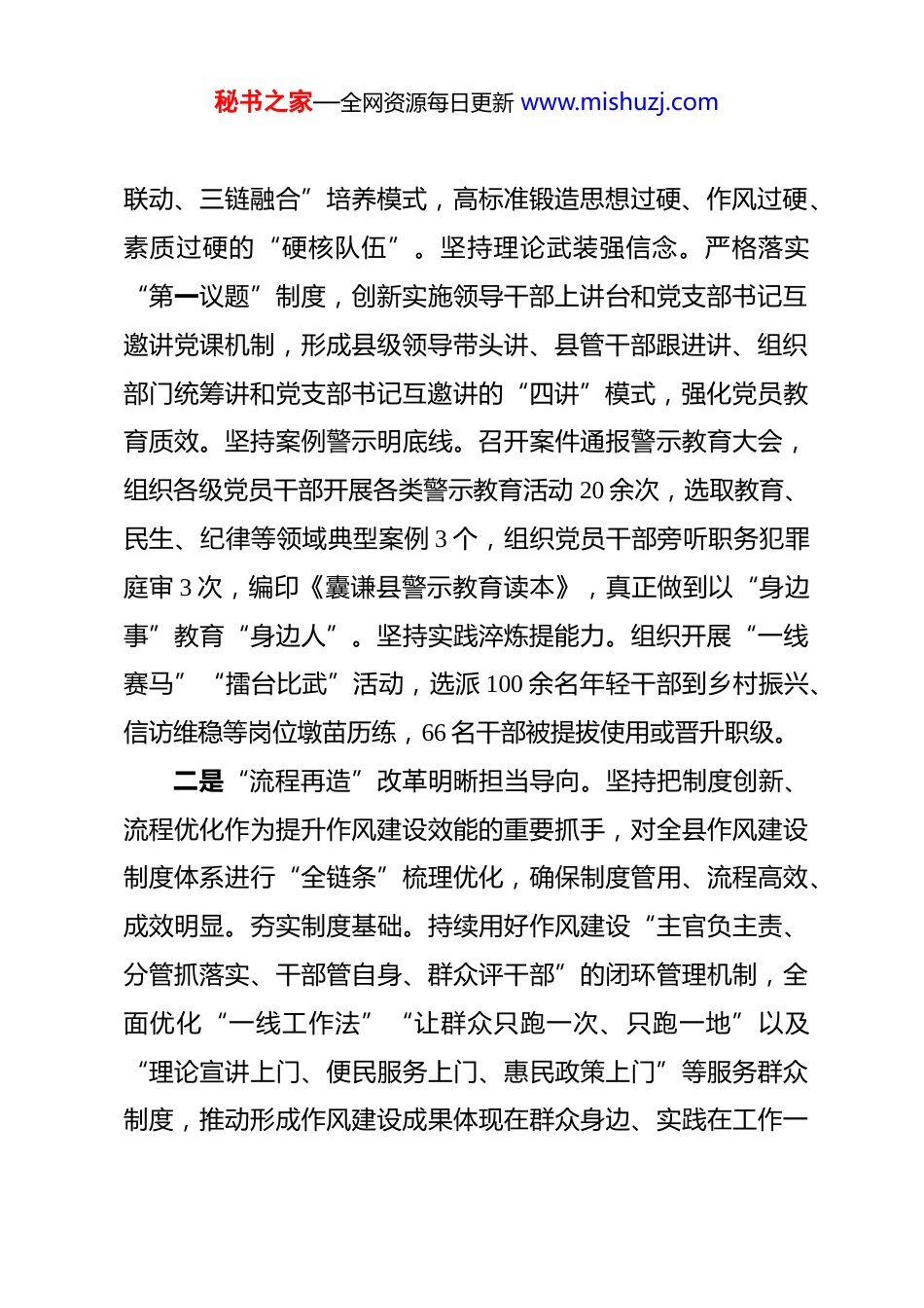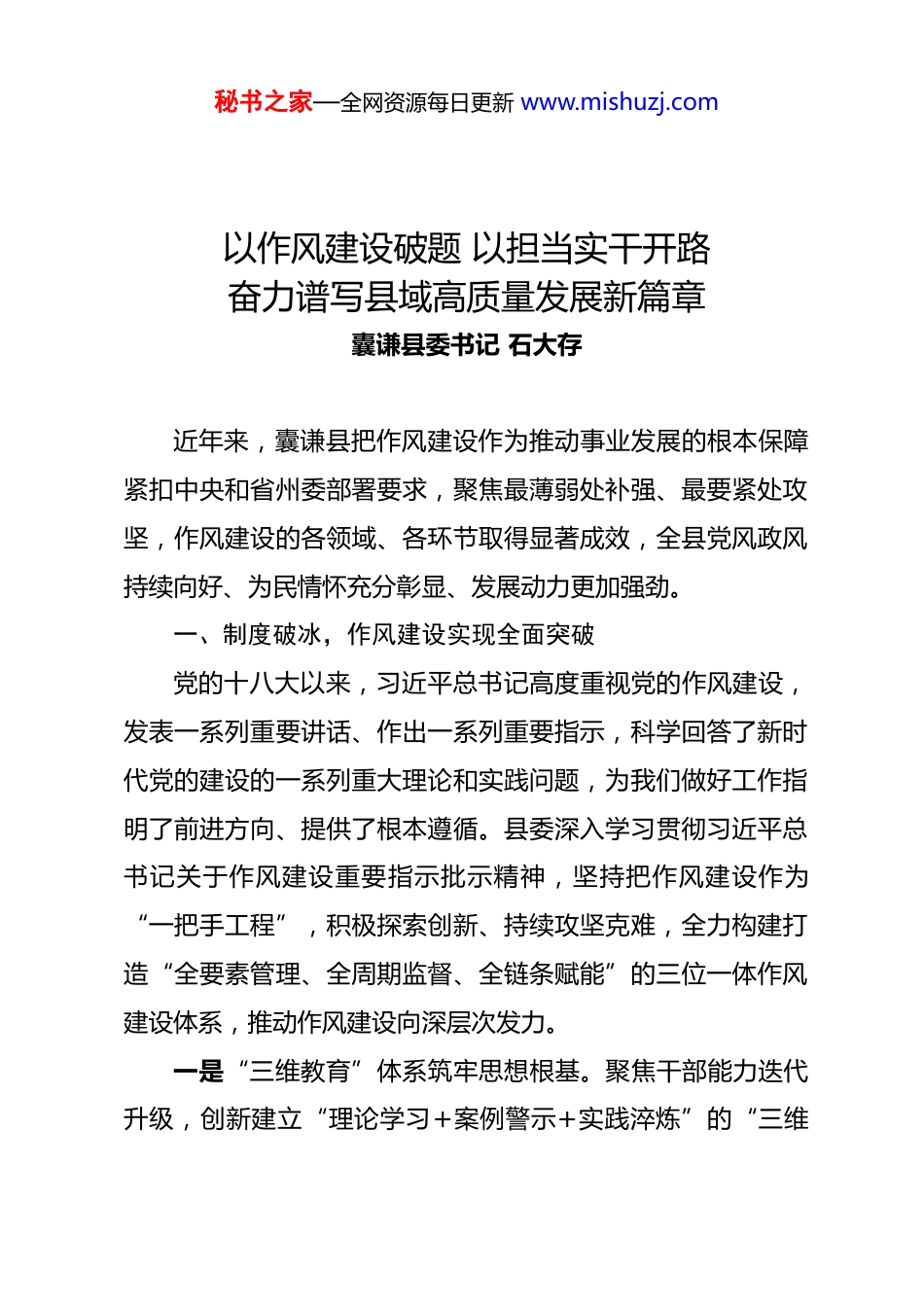 秘书之家—全网资源每日更新 www.mishuzj.com以作风建设破题 以担当实干开路奋力谱写县域高质量发展新篇章囊谦县委书记 石大存近年来,囊谦县把作风建设作为推动事业发展的根本保障紧扣中央和省州委部署要求,聚焦最薄弱处补强、最要紧处攻坚,作风建设的各领域、各环节取得显著成效,全县党风政风持续向好、为民情怀充分彰显、发展动力更加强劲。一、制度破冰,作风建设实现全面突破党的十八大以来,习近平总书记高度重视党的作风建设,发表一系列重要讲话、作出一系列重要指示,科学回答了新时代党的建设的一系列重大理论和实践问题,为我们做好工作指明了前进方向、提供了根本遵循。县委深入学习贯彻习近平总书记关于作风建设重要指示批示精神,坚持把作风建设作为“一把手工程”,积极探索创新、持续攻坚克难,全力构建打造“全要素管理、全周期监督、全链条赋能”的三位一体作风建设体系,推动作风建设向深层次发力。一是“三维教育”体系筑牢思想根基。聚焦干部能力迭代升级,创新建立“理论学习+案例警示+实践淬炼”的“三维秘书之家—全网资源每日更新 www.mishuzj.com联动、三链融合”培养模式,高标准锻造思想过硬、作风过硬、素质过硬的“硬核队伍”。坚持理论武装强信念。严格落实“第一议题”制度,创新实施领导干部上讲台和党支部书记互邀讲党课机制,形成县级领导带头讲、县管干部跟进讲、组织部门统筹讲和党支部书记互邀讲的“四讲”模式,强化党员教育质效。坚持案例警示明底线。召开案件通报警示教育大会,组织各级党员干部开展各类警示教育活动 20 余次,选取教育、民生、纪律等领域典型案例 3 个,组织党员干部旁听职务犯罪庭审 3 次,编印《囊谦县警示教育读本》,真正做到以“身边事”教育“身边人”。坚持实践淬炼提能力。组织开展“一线赛马”“擂台比武”活动,选派 100 余名年轻干部到乡村振兴、信访维稳等岗位墩苗历练,66 名干部被提拔使用或晋升职级。二是“流程再造”改革明晰担当导向。坚持把制度创新、流程优化作为提升作风建设效能的重要抓手,对全县作风建设制度体系进行“全链条”梳理优化,确保制度管用、流程高效、成效明显。夯实制度基础。持续用好作风建设“主官负主责、分管抓落实、干部管自身、群众评干部”的闭环管理机制,全面优化“一线工作法”“让群众只跑一次、只跑一地”以及“理论宣讲上门、便民服务上门、惠民政策上门”等服务群众制度,推动形成作风建设成果体现在群众身边、实践在工作一秘书之家—全网资源每日更新 www.mishuzj.com线的浓厚氛围。用好巡察利剑。扎实推进省委巡视和州委提级巡察反馈问题整改工作,对县委巡察的 18 家单位开展巡察整改“回头看”,对 24 家县直机关党组和 10 个乡镇党委围绕“四个聚焦”开展“点穴式”巡察,坚决杜绝敷衍整改、选择整改、“纸面”整改等问题,确保巡察整改“后半篇文章”谋到细处、落到实处。激发干部活力。将党风廉政建设、巡视巡察整改、群众满意度测评等涉及作风建设内容纳入领导班子年度考核权重稳定在 30%,对排名靠后的单位主要负责人进行约谈、对先进集体给予绩效奖励。从一线提拔选任 34 名政治过硬、实绩突出、群众公认的“好作风”干部,推动形成“有为者有位、实干者实惠”的鲜明用人导向和激励机制。三是“多方监督”机制破除落实盲区。紧盯全县监督力量少、覆盖范围窄等问题,有力发挥“纪检队伍+职能部门+干部群众”的乘数效应,充分运用“线上举报+线下督查”的监督载体,有力强化作风建设改革攻坚的锐度和力度。注重畅通监督渠道。在县融媒体中心、“廉洁囊谦”微信公众号和全县各级政务新媒体累计发布藏汉双语“群腐”集中整治公告 300余次,在县城人群聚集地和全县各乡镇、村(社区)公示栏全覆盖式张贴公告,年均受理群众信访举报件 100 条以上,确保群众知情权和举报权。注重结合重点工作。围绕生态保护、乡秘书之家—全网资源每日更新 www.mishuzj.com村振兴、生态农牧业和文化旅游业、环境卫生整治等政治要事、民生实事,整合纪委监委、生态、农牧、文旅、交通、城管、住建、公安、市场等部门,开展生态修复、惠民政策落地...