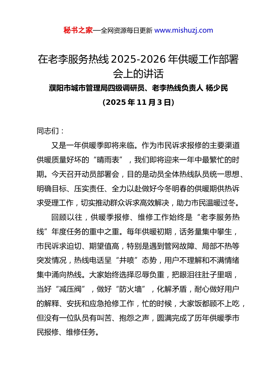 秘书之家—全网资源每日更新 www.mishuzj.com在老李服务热线 2025-2026 年供暖工作部署会上的讲话濮阳市城市管理局四级调研员、老李热线负责人 杨少民(2025 年 11 月 3 日)同志们:又是一年供暖季即将来临。作为市民诉求报修的主要渠道供暖质量好坏的“晴雨表”,我们即将迎来一年中最繁忙的时期。今天召开动员部署会,目的是动员全体热线队员统一思想、明确目标、压实责任、全力以赴做好今冬明春的供暖期供热诉求受理工作,切实推动群众诉求高效解决,助力市民温暖过冬。回顾以往,供暖季报修、维修工作始终是“老李服务热线”年度任务的重中之重。每年供暖初期,话务量集中攀生,市民诉求迫切、期望值高,特别是遇到管网故障、局部不热等突发情况,热线电话呈“井喷”态势,用户不理解和不满情绪集中涌向热线。大家始终选择忍辱负重,把眼泪往肚子里咽,当好“减压阀”,做好“防火墙”,化解矛盾,耐心做好用户的解释、安抚和应急抢修工作,忙的时候,大家饭都顾不上吃,但没有一位队员有叫苦、抱怨之声,圆满完成了历年供暖季市民报修、维修任务。秘书之家—全网资源每日更新 www.mishuzj.com上一供暖季热线电话量首次出现回落,这背后,是供热企业通过管网改造、能源保供、服务升级等措施,让千家万户室内温度切实提升,“热线冷了”恰恰印证了全市供暖保障能力的整体进步,也体现了我们服务质效的持续优化。在 10 月 24日市城区供暖提质增效工作动员会上,李局长对老李热线提出了新的更高要求,明确要进一步提升业务水平,增强与市民沟通协调能力,做到“能即时解答不转办”,切实为热力各分公司减负增效。这既为我们树立了新的工作标尺,也带来了全新的实践课题。下面,我就如何全面做好今冬供热诉求受理工作强调几点意见:一、统一思想,提高认识,切实增强做好供暖热线保障工作的责任感和使命感冬季供暖是关系到千家万户冷暖、社会和谐稳定的重大民生工程。热线作为连接供热企业与市民群众的桥梁纽带,是感知供热服务质量的“前哨站”,是化解供用热矛盾的“减压阀”,更是展现行业形象和政府公信力的重要窗口。全体热线队员必须进一步提高政治站位,牢固树立“群众利益无小事”的服务理念,把供暖季热线保障作为当前压倒一切的中心任务,坚决克服麻痹思想和侥幸心里,以高度的责任担当和行动自觉,全力以赴投入各项工作。秘书之家—全网资源每日更新 www.mishuzj.com二、聚焦重点,强化措施,全面提升热线服务保障效能和水平面对新形势、新任务、新要求,我们必须坚持目标导向、问题导向、结果导向相统一,,精准发力,务求实效,全面提升服务保障能力。(一)强化队伍建设与能力培训。要科学研判话务高峰,合理调配话务班次,全力应对供热期接线压力,确保热线诉求渠道全时畅通。持续关注供热企业服务信息发布情况,组织开展针对性、时效性强的业务培训,重点围绕供暖政策、温度标准、费用退补、常见故障判断、用暖注意事项、暖气自检、沟通技巧、情绪疏导等内容,全面提升话务员的专业解答、高效引导和应急处突能力,抢修人员要熟练掌握操作规范与安全要求,确保技能过硬、响应迅速。(二)优化运行机制与协调联动。要进一步梳理优化从接听、记录、派单、跟踪、督办到回访的全流程闭环管理。加强与供热企业的协调沟通,建立快速响应通道,明确各类诉求的处置时限和标准,特别是对于爆管、大面积不热等紧急情况,确保衔接顺畅、处置高效,减少市民等待时间。(三)确保信息准确与数据赋能。要及时更新完善供热知识库服务信息,确保最新供热政策、服务范围、报停流程、服秘书之家—全网资源每日更新 www.mishuzj.com务范围、管道维护、缴费流程等高频咨询信息,确保答复准确无误。保持与供热调度部门的密切沟通,及时掌握供热系统运行状况、计划性停暖等信息,加强对每日诉求数据的汇总、分析与研判,精准识别高发区域、集中问题与变化趋势,形成高质量的研判报告,为局党组决策和供热企业优化供热保障服务提供有力数据支撑。(四)夯实后勤保障与应急准备。进一步细化供暖突发事件应急处置预案,提前做好维修车辆、设备、工具的全面检修,备齐应急抢修...