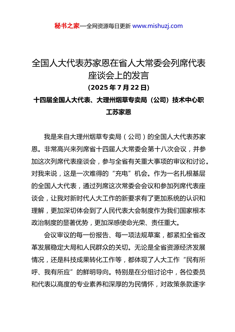 秘书之家—全网资源每日更新 www.mishuzj.com全国人大代表苏家恩在省人大常委会列席代表座谈会上的发言(2025 年 7 月 22 日)十四届全国人大代表、大理州烟草专卖局(公司)技术中心职工苏家恩我是来自大理州烟草专卖局(公司)的全国人大代表苏家恩。非常高兴来列席省十四届人大常委会第十八次会议,并参加这次列席代表座谈会,参与全省有关重大事项的审议和讨论。对我来说,这是一次难得的“充电”机会。作为一名扎根基层的全国人大代表,通过列席这次常委会会议和参加列席代表座谈会,让我对新时代人大工作的新要求有了更加系统的认识和理解,更加深切体会到了人民代表大会制度作为我们国家根本政治制度的显著优势,更加深感使命光荣、责任重大。会议审议的每一份报告、每一项法规草案,都紧扣全省改革发展稳定大局和人民群众的关切。无论是全省资源经济发展情况,还是科技成果转化工作等,都体现了人大工作“民有所呼、我有所应”的鲜明导向。特别是在分组讨论中,各位委员和代表以高度的专业素养和深厚的为民情怀,对政策条款逐字秘书之家—全网资源每日更新 www.mishuzj.com推敲、对民生痛点直言不讳,让我深刻感受到人大立法和监督工作的“严、慎、细、实”。我看到省科技厅的报告中写到:“加快布局科技成果转化平台载体,发挥我省优势开展精准对接引进一批优质科技成果在我省落地转化和产业化。”结合我日常对烟农群众的走访调查,我在分组审议发言中提出了“加快云南省闭式热泵烤房科技成果转化”的建议。闭式热泵烤房不仅是当前烟草行业烤房中烘烤效果最好、烘烤能耗成本最低的一类烤房,而且这种烤房还可以综合利用,比如烘烤中药材、种植蘑菇等等。闭式热泵烤房是烟叶生产高端化、智能化、绿色化转型的典型代表,广大烟区的烟农群众都非常希望能够使用到这种新设备,恳请加快推广力度。回到工作岗位后,我将把本次会议的收获转化为履职动力重点做好以下工作:一是当好政策宣传员,用群众听得懂的语言,宣讲本次会议通过的法规政策,特别是涉及基层治理、民生保障的内容;二是架好民意连心桥,依托代表联络站,积极收集群众对相关政策的建议,推动“民声”融入“政声”;三是做好监督践行者,针对本次会议关注的生态环境保护、乡村振兴等领域工作,深入开展调研,以“小切口”监督推动问题解决。