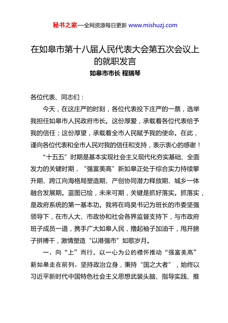 秘书之家—全网资源每日更新 www.mishuzj.com在如皋市第十八届人民代表大会第五次会议上的就职发言如皋市市长 程瑞琴各位代表、同志们:今天,在这庄严的时刻,各位代表投下庄严的一票,选举我担任如皋市人民政府市长。这份厚爱,承载着各位代表给予我的信任;这份厚望,承载着全市人民赋予我的使命。在此,谨向各位代表和全市人民对我的信任和支持,表示衷心的感谢!“十五五”时期是基本实现社会主义现代化夯实基础、全面发力的关键时期,“强富美高”新如皋正处于综合实力持续攀升期、跨江向海格局塑造期、产创协同潜力释放期、城乡一体融合发展期。蓝图已绘,未来可期,关键是抓好落实。抓落实,是政府系统的第一基本功。我将在鸣昊书记为班长的市委坚强领导下,在市人大、市政协和社会各界监督支持下,与市政府班子成员一道,携手广大如皋人民,撸起袖子加油干,甩开膀子拼搏干,激情塑造“以港强市”如歌岁月。一、向“上”而行,以一心为公的襟怀推动“强富美高”新如皋走在前列。坚持政治立身,秉持“国之大者”,始终以习近平新时代中国特色社会主义思想武装头脑、指导实践、推秘书之家—全网资源每日更新 www.mishuzj.com动工作,坚定拥护“两个确立”、坚决做到“两个维护”。贯通式落实中央大政方针,省、南通市决策部署,和市委工作要求,穿透式推进“以港强市”战略,在抬头看路中建树“上下一致、步调一致、表里一致”的全局观,在埋头拉车中打造“心往一处想、劲往一处使、力往一处用”的执行力,合力塑造如皋忠诚如一、党政如一、干群如一的政治生态。树立正确政绩观,着眼打基础、谋长远,坚持做难而正确的事、小而关键的事,在紧环境下化危为机、化繁为简,在双循环中见机行事、寻机突破,以恒心致恒业,以实干促实效,久久为功,务实打造“以港强市”新胜景。二、向“新”而行,以夙夜在公的担当推动“强富美高”新如皋攀高走强。聚焦以港强市“四大目标定位”,突出产创融合、开放融合、跨江融合、城乡融合,扎实推进守正创新、改革创新、系统创新,打造桥头堡、塑造新高峰、锻造急先锋,在港产城融合发展中抢滩长江口、争先长三角、奋力挑大梁。着力传统产业稳固优势、新兴产业增创优势、未来产业积蓄优势,因势利导推进新型工业化,因地制宜发展新质生产力,加快形成具有如皋辨识度、体现如皋显示度、代表如皋新高度的现代化产业体系。坚持大抓招商、大抓项目、大抓服务,在优江拓海、追高逐新中落户一批“重特大”产业项目、集聚一批秘书之家—全网资源每日更新 www.mishuzj.com“高精新”科创项目、实施一批“小而美”民生项目,加速崛起创新创业新皋地。三、向“善”而行,以廉洁奉公的自觉推动“强富美高”新如皋行稳致远。突出“投资于人”导向,优化“前港、中区、后城”功能布局和“生产、生活、生态”空间布局,夯实“规划、建设、管理”统筹机制和“产业、企业、就业”配套机制,扎实推进一二三产业融合发展,全面提升长寿长富、可感可及、共建共享的幸福质态,努力让人民群众充分享受共同富裕的获得感。坚持科学、民主、依法行政,自觉按法律行事、按政策谋事、按制度办事、按规矩干事,时刻接受人大法律监督、政协民主监督和社会舆论监督,让政府工作经得起历史和人民的检验。坚持以身作则、以上率下,永葆忠诚干净担当、为民务实清廉的政治本色,共同营造一心为公、一身正气、一尘不染的廉政氛围。各位代表,同志们!击鼓催征时不我待,奋斗脚步永不停歇。我将在市委的坚强领导下,立足历届市政府班子打下的良好基础,和市政府系统同志一道,与全市干部群众一起,同舟共济争上游、同向发力打头阵,合力描绘“以港强市”壮美图景,奋力谱写“强富美高”新如皋现代化建设崭新篇章。