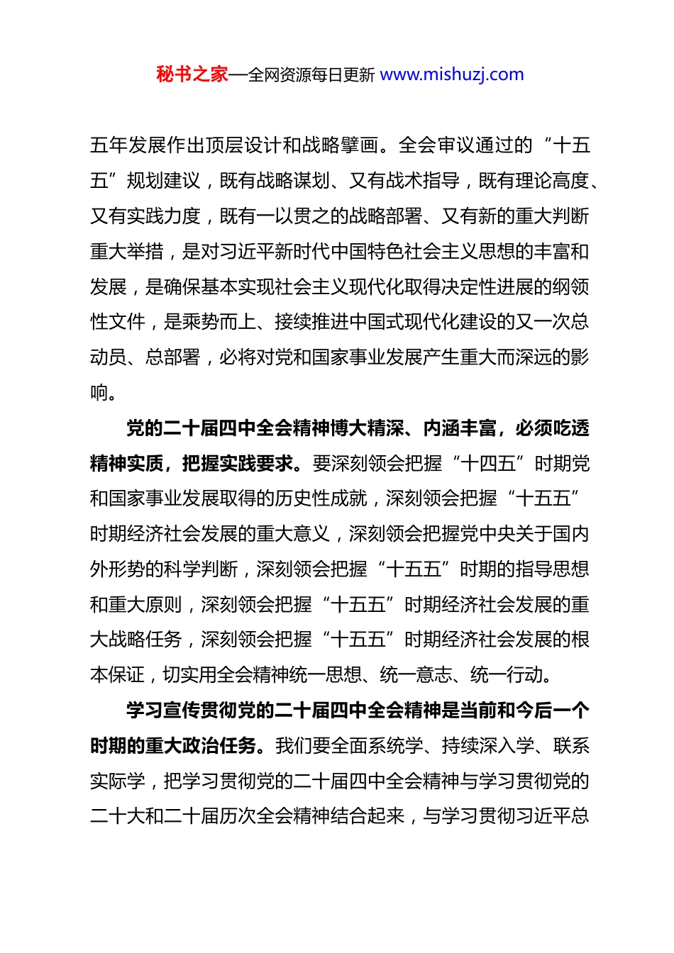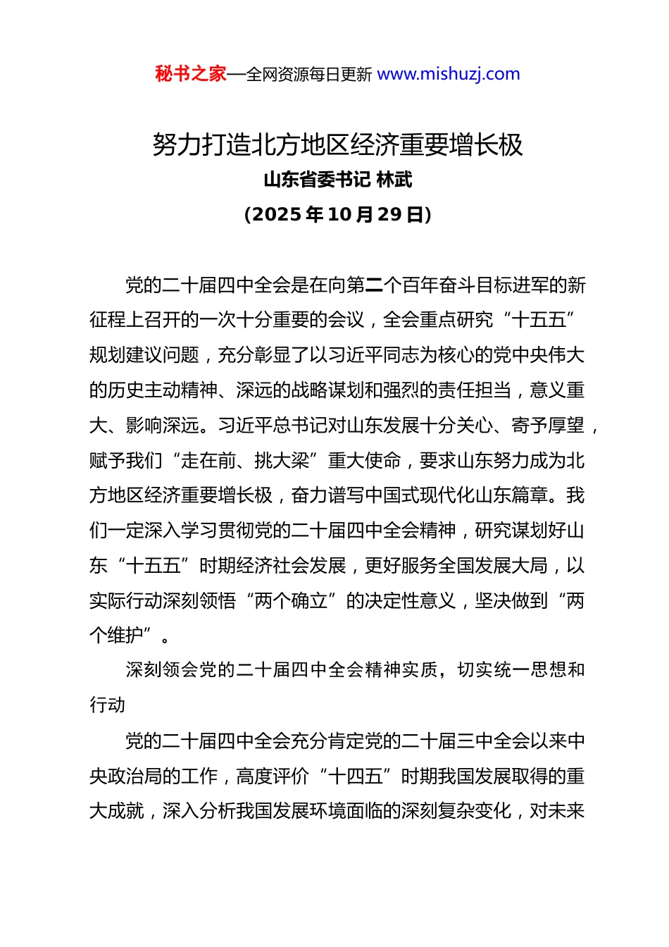 秘书之家—全网资源每日更新 www.mishuzj.com努力打造北方地区经济重要增长极山东省委书记 林武(2025 年 10 月 29 日)党的二十届四中全会是在向第二个百年奋斗目标进军的新征程上召开的一次十分重要的会议,全会重点研究“十五五”规划建议问题,充分彰显了以习近平同志为核心的党中央伟大的历史主动精神、深远的战略谋划和强烈的责任担当,意义重大、影响深远。习近平总书记对山东发展十分关心、寄予厚望,赋予我们“走在前、挑大梁”重大使命,要求山东努力成为北方地区经济重要增长极,奋力谱写中国式现代化山东篇章。我们一定深入学习贯彻党的二十届四中全会精神,研究谋划好山东“十五五”时期经济社会发展,更好服务全国发展大局,以实际行动深刻领悟“两个确立”的决定性意义,坚决做到“两个维护”。深刻领会党的二十届四中全会精神实质,切实统一思想和行动党的二十届四中全会充分肯定党的二十届三中全会以来中央政治局的工作,高度评价“十四五”时期我国发展取得的重大成就,深入分析我国发展环境面临的深刻复杂变化,对未来秘书之家—全网资源每日更新 www.mishuzj.com五年发展作出顶层设计和战略擘画。全会审议通过的“十五五”规划建议,既有战略谋划、又有战术指导,既有理论高度、又有实践力度,既有一以贯之的战略部署、又有新的重大判断重大举措,是对习近平新时代中国特色社会主义思想的丰富和发展,是确保基本实现社会主义现代化取得决定性进展的纲领性文件,是乘势而上、接续推进中国式现代化建设的又一次总动员、总部署,必将对党和国家事业发展产生重大而深远的影响。党的二十届四中全会精神博大精深、内涵丰富,必须吃透精神实质,把握实践要求。要深刻领会把握“十四五”时期党和国家事业发展取得的历史性成就,深刻领会把握“十五五”时期经济社会发展的重大意义,深刻领会把握党中央关于国内外形势的科学判断,深刻领会把握“十五五”时期的指导思想和重大原则,深刻领会把握“十五五”时期经济社会发展的重大战略任务,深刻领会把握“十五五”时期经济社会发展的根本保证,切实用全会精神统一思想、统一意志、统一行动。学习宣传贯彻党的二十届四中全会精神是当前和今后一个时期的重大政治任务。我们要全面系统学、持续深入学、联系实际学,把学习贯彻党的二十届四中全会精神与学习贯彻党的二十大和二十届历次全会精神结合起来,与学习贯彻习近平总秘书之家—全网资源每日更新 www.mishuzj.com书记考察山东重要讲话和重要指示批示精神结合起来,做到融会贯通、心领神会。以高度的政治责任感,周密组织部署,切实抓好学习培训,组织专题研讨班,开展集中轮训,推动学习培训全覆盖。深入开展集中宣讲,发挥领导干部示范带动作用,深入企业、学校、农村、社区等进行宣讲。精心组织新闻宣传,利用各种宣传渠道和载体,开展全方位宣传报道,持续巩固壮大主流舆论强势。加强理论研究阐释,推出一批有学理深度、有实践价值的理论成果,在全省迅速兴起学习宣传贯彻党的二十届四中全会精神的热潮。始终牢记习近平总书记嘱托,全面对标科学谋划“十五五”发展“十四五”以来,山东始终坚持以习近平新时代中国特色社会主义思想为指导,深入贯彻习近平总书记对山东工作的重要指示批示精神,稳扎稳打、踏踏实实做好各项工作,现代化强省建设取得积极成效,为“十五五”发展奠定了坚实基础。综合实力迈上新台阶,全省地区生产总值连续跨过 3 个万亿元台阶,从 2020 年的 7.44 万亿元增加到 2024 年的 9.86 万亿元,今年将突破 10 万亿元大关。新质生产力发展取得新成效,制造业总体规模和综合实力稳居全国第一梯队,高新技术产业产值占比达到 55.2%,高新技术企业总量突破 3.5 万家,数字经济占秘书之家—全网资源每日更新 www.mishuzj.com比超过 49%。绿色低碳转型实现新突破,非化石能源装机超过1.3 亿千瓦、占比达 53.4%,万元 GDP 能耗四年累计下降18.5%,2021 年至 2024 年在中央污染防治攻坚战成效考核中获得“四连优”。城乡区域发展呈现新局面,黄河重大国家战略深入实施,片区化推进乡村振兴成效显著,海洋经济总量稳居...