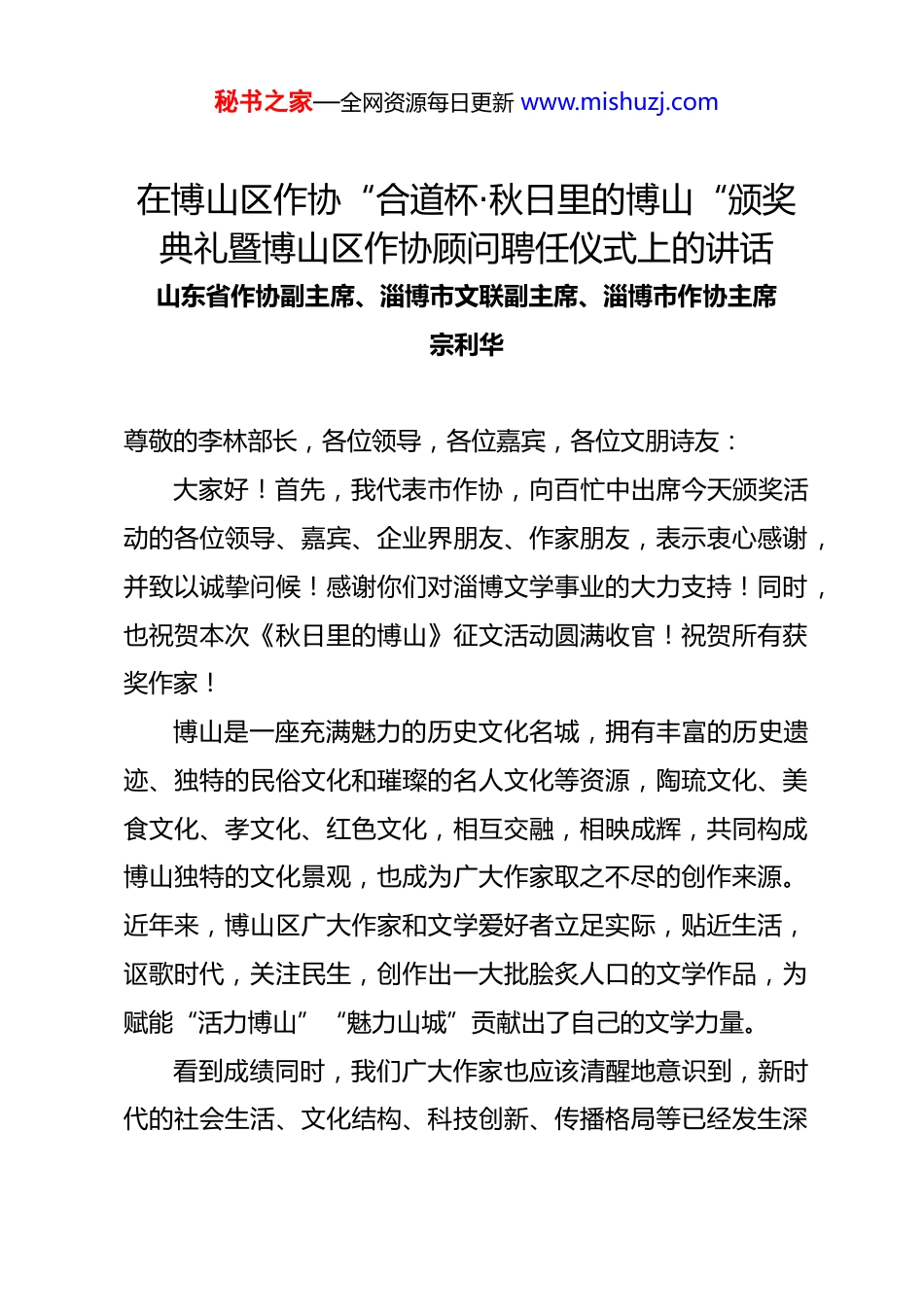 秘书之家—全网资源每日更新 www.mishuzj.com在博山区作协“合道杯·秋日里的博山“颁奖典礼暨博山区作协顾问聘任仪式上的讲话山东省作协副主席、淄博市文联副主席、淄博市作协主席宗利华尊敬的李林部长,各位领导,各位嘉宾,各位文朋诗友:大家好!首先,我代表市作协,向百忙中出席今天颁奖活动的各位领导、嘉宾、企业界朋友、作家朋友,表示衷心感谢,并致以诚挚问候!感谢你们对淄博文学事业的大力支持!同时,也祝贺本次《秋日里的博山》征文活动圆满收官!祝贺所有获奖作家!博山是一座充满魅力的历史文化名城,拥有丰富的历史遗迹、独特的民俗文化和璀璨的名人文化等资源,陶琉文化、美食文化、孝文化、红色文化,相互交融,相映成辉,共同构成博山独特的文化景观,也成为广大作家取之不尽的创作来源。近年来,博山区广大作家和文学爱好者立足实际,贴近生活,讴歌时代,关注民生,创作出一大批脍炙人口的文学作品,为赋能“活力博山”“魅力山城”贡献出了自己的文学力量。看到成绩同时,我们广大作家也应该清醒地意识到,新时代的社会生活、文化结构、科技创新、传播格局等已经发生深秘书之家—全网资源每日更新 www.mishuzj.com刻变化,文学样态、呈现方式越来越多样化,文学边界不断扩展。“新大众文艺”蓬勃发展,“大文学观”理念越来越成为共识。文学与文化产业,文学与文旅融合,文学助力区域经济发展,文学向影视、动漫、戏剧、网游的转化,等等一系列新课题,摆在作家面前,也给我们广大作家提出新要求、新思路、新理念。在此,也希望作家朋友们进一步深入生活,广开视野。真正到生活中去,到自然中去,到民间去,体验、感受新时代山乡巨变,在行走和交流中不断开阔创作视野。要主动顺应时代潮流,把握时代脉搏,紧跟时代发展步伐,用手中的笔记录时代之变、城市之进,为时代画像、为时代立传、为时代明德。要立足博山本土文化,创作反映时代风貌、引发读者共鸣的精品力作。同时,探索文学作品传播新途径,做好文学与影视、与戏剧、与动漫、与网游等等的创造性转化。希望广大作家和文学工作者,努力挖掘、传播博山优秀传统文化,努力讲好新时代博山故事,共同书写淄博文学事业繁荣发展的新篇章。为推动淄博文化名城建设,继续奉献出我们的文学力量!最后,祝各位领导、嘉宾、作家朋友们身体健康,万事如意!秘书之家—全网资源每日更新 www.mishuzj.com谢谢大家!