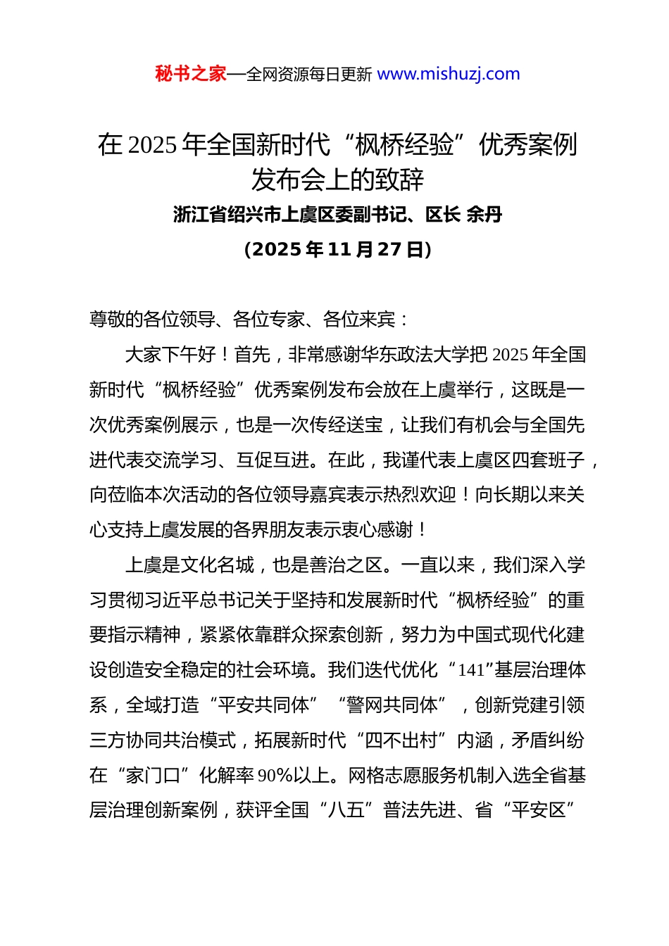 秘书之家—全网资源每日更新 www.mishuzj.com在 2025 年全国新时代“枫桥经验”优秀案例发布会上的致辞浙江省绍兴市上虞区委副书记、区长 余丹(2025 年 11 月 27 日)尊敬的各位领导、各位专家、各位来宾:大家下午好!首先,非常感谢华东政法大学把 2025 年全国新时代“枫桥经验”优秀案例发布会放在上虞举行,这既是一次优秀案例展示,也是一次传经送宝,让我们有机会与全国先进代表交流学习、互促互进。在此,我谨代表上虞区四套班子,向莅临本次活动的各位领导嘉宾表示热烈欢迎!向长期以来关心支持上虞发展的各界朋友表示衷心感谢!上虞是文化名城,也是善治之区。一直以来,我们深入学习贯彻习近平总书记关于坚持和发展新时代“枫桥经验”的重要指示精神,紧紧依靠群众探索创新,努力为中国式现代化建设创造安全稳定的社会环境。我们迭代优化“141”基层治理体系,全域打造“平安共同体”“警网共同体”,创新党建引领三方协同共治模式,拓展新时代“四不出村”内涵,矛盾纠纷在“家门口”化解率 90%以上。网格志愿服务机制入选全省基层治理创新案例,获评全国“八五”普法先进、省“平安区”秘书之家—全网资源每日更新 www.mishuzj.com称号,成功夺得省“一星平安金鼎”。基层强则国家强,基层安则天下安。接下来,我们将以此活动为契机,坚持好、发展好新时代“枫桥经验”,健全完善共建共治共享的社会治理制度,不断夯实网格化管理、精细化服务、信息化支撑的基层治理平台,全力打造全国县域治理现代化示范样板。今天机会难得,诚挚希望各位领导、各位专家能在上虞多走走看看,提出宝贵意见。希望各兄弟县市区之间能常来常往、多多交流、取长补短。最后,预祝本次发布活动取得圆满成功!祝各位领导、各位专家、各位来宾身体健康、工作顺利、万事如意!谢谢大家!
