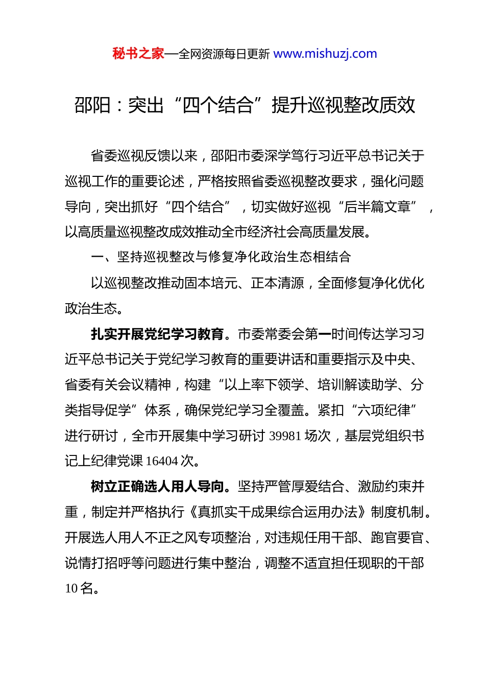 秘书之家—全网资源每日更新 www.mishuzj.com邵阳:突出“四个结合”提升巡视整改质效省委巡视反馈以来,邵阳市委深学笃行习近平总书记关于巡视工作的重要论述,严格按照省委巡视整改要求,强化问题导向,突出抓好“四个结合”,切实做好巡视“后半篇文章”,以高质量巡视整改成效推动全市经济社会高质量发展。一、坚持巡视整改与修复净化政治生态相结合以巡视整改推动固本培元、正本清源,全面修复净化优化政治生态。扎实开展党纪学习教育。市委常委会第一时间传达学习习近平总书记关于党纪学习教育的重要讲话和重要指示及中央、省委有关会议精神,构建“以上率下领学、培训解读助学、分类指导促学”体系,确保党纪学习全覆盖。紧扣“六项纪律”进行研讨,全市开展集中学习研讨 39981 场次,基层党组织书记上纪律党课 16404 次。树立正确选人用人导向。坚持严管厚爱结合、激励约束并重,制定并严格执行《真抓实干成果综合运用办法》制度机制。开展选人用人不正之风专项整治,对违规任用干部、跑官要官、说情打招呼等问题进行集中整治,调整不适宜担任现职的干部10 名。秘书之家—全网资源每日更新 www.mishuzj.com推动监督体系贯通协调。出台《市委巡察整改会商工作规程》等制度,持续完善片区协作、纪巡联动等机制。出台《推进政协民主监督与纪委监委专责监督贯通协调实施办法》,建立健全纪检监察监督与民主监督、审计监督等贯通协调机制。今年来,接收并处置巡视巡察移送线索 242 件,处理处分 2852人次。二、坚持巡视整改与全面从严治党相结合切实扛牢全面从严治党政治责任,坚持严字当头、全面从严、一严到底,推动全面从严治党走深走实。全面压实管党治党责任。严格落实“第一议题”制度,及时跟进学习习近平总书记关于全面从严治党的重要论述。出台《邵阳市压实全面从严治党政治责任持续净化政治生态“十必严”》,使严的基调、严的措施、严的氛围全面形成。紧盯重点领域深化开展第五轮政治巡察,对 5 个政法单位开展对口专项巡察,12 个县市区政法部门开展交叉巡察,层层压实管党治党政治责任。驰而不息正风肃纪反腐。深入开展群众身边不正之风和腐败问题集中整治,坚决查处隆回县学生营养餐、洞口县棚户区改造背后失职渎职及腐败问题。深化“两带头五整治”纠风防腐专项行动和“明方向、立规矩、正风气、强免疫”干部队伍秘书之家—全网资源每日更新 www.mishuzj.com作风建设专项整治活动,查处“四风”问题 427 起,处理处分736 人。扎实开展以案促改。分层分类开展警示教育,市委常委会会议组成人员带头前往邵阳监狱接受警示教育。三、坚持巡视整改与推动高质量发展相结合针对巡视指出经济发展不够快不够优的问题,坚持“产业兴邵”不动摇,稳增长、调结构、促改革,加快推动经济高质量发展。以巡视整改助推现代化产业体系建设。持续推进产业发展“千百十”工程,加快构建具有邵阳特色的“3×3”现代化产业体系。今年 1-5 月,九大重点产业链实现产值新突破。三一专汽获评国家制造业单项冠军企业,实现历史性“破零”。以巡视整改助推全面深化改革开放。统筹推进要素市场化配置、投融资体制、财税体制等改革,落实开放强市“五大举措”,全面融入中部地区崛起和长江经济带发展战略,加强与粤港澳、东盟、非洲等地的深度合作。以巡视整改助推营商环境优化。结合“走找想促”和“三送三解三优”行动,建立政企常态化沟通机制,定期开展“企业家接待日”“政银企对接会”等活动,帮助企业解决用地、用工、融资等重点问题 265 个,为各类经营主体解决拖欠账款秘书之家—全网资源每日更新 www.mishuzj.com和兑现政策 1.52 亿元。以巡视整改助推乡村振兴。持续开展防返贫监测帮扶,实施“五有”产业帮扶、“雨露计划+”就业促进等行动,培育壮大农业特色产业,完善联农带农机制,促进脱贫群众持续增收。四、坚持巡视整改与保障改善民生相结合针对巡视反馈民生领域欠账较多、维稳压力较大的问题,加大对民生领域的投入力度,大力优化公共服务,兜住兜牢民生底线。办好人民满意教育。出台优化乡村小规模学校布局等系列文件,切实改善农村教育办学水平...