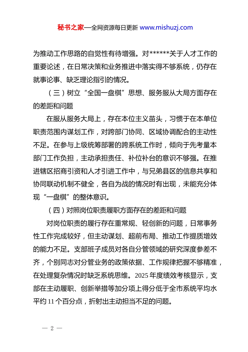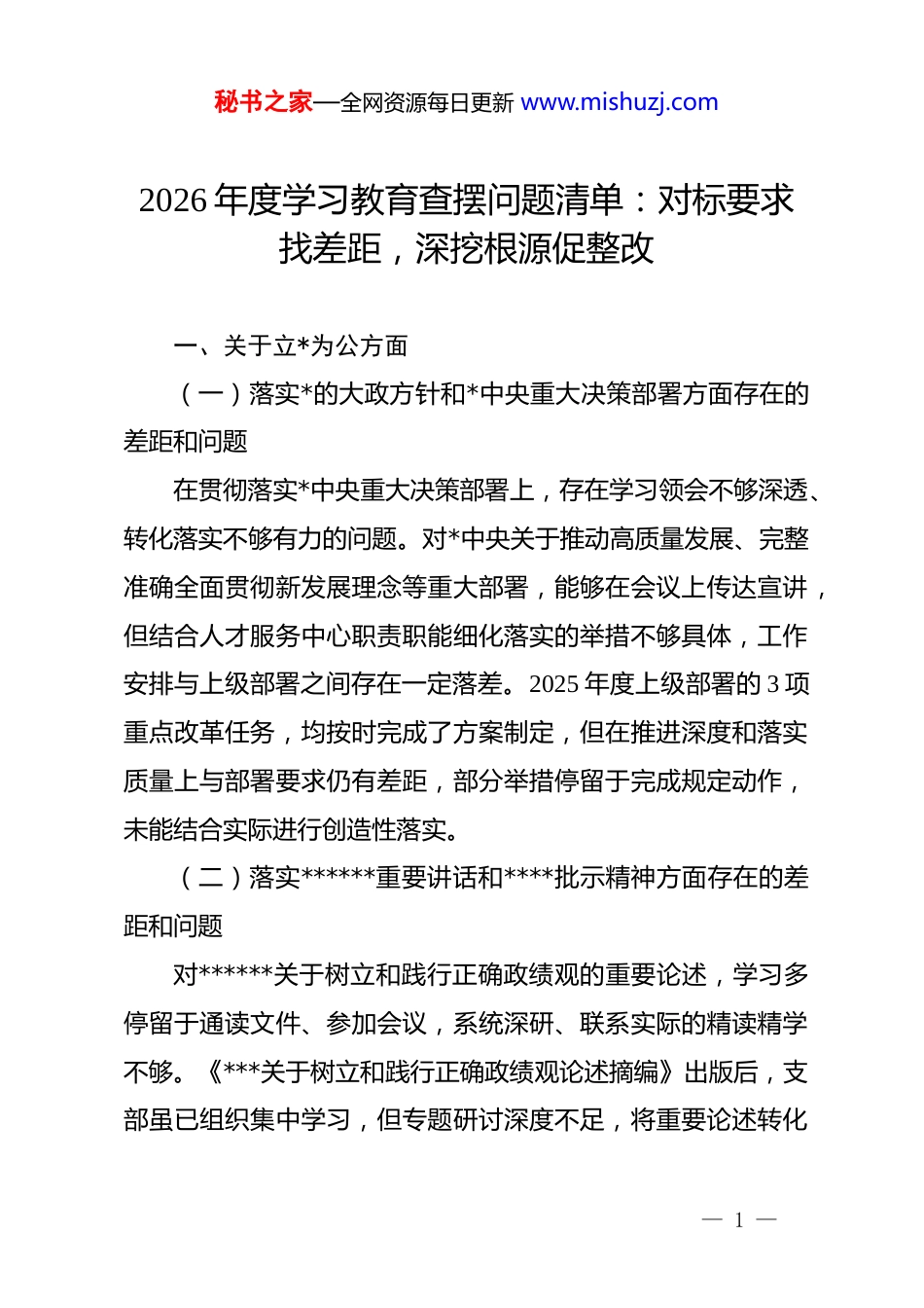 秘书之家—全网资源每日更新 www.mishuzj.com2026 年度学习教育查摆问题清单:对标要求找差距,深挖根源促整改一、关于立*为公方面(一)落实*的大政方针和*中央重大决策部署方面存在的差距和问题在贯彻落实*中央重大决策部署上,存在学习领会不够深透、转化落实不够有力的问题。对*中央关于推动高质量发展、完整准确全面贯彻新发展理念等重大部署,能够在会议上传达宣讲,但结合人才服务中心职责职能细化落实的举措不够具体,工作安排与上级部署之间存在一定落差。2025 年度上级部署的 3 项重点改革任务,均按时完成了方案制定,但在推进深度和落实质量上与部署要求仍有差距,部分举措停留于完成规定动作,未能结合实际进行创造性落实。(二)落实******重要讲话和****批示精神方面存在的差距和问题对******关于树立和践行正确政绩观的重要论述,学习多停留于通读文件、参加会议,系统深研、联系实际的精读精学不够。《***关于树立和践行正确政绩观论述摘编》出版后,支部虽已组织集中学习,但专题研讨深度不足,将重要论述转化— 1 —秘书之家—全网资源每日更新 www.mishuzj.com为推动工作思路的自觉性有待增强。对******关于人才工作的重要论述,在日常决策和业务推进中落实得不够系统,仍存在就事论事、缺乏理论指引的情况。(三)树立“全国一盘棋”思想、服务服从大局方面存在的差距和问题在服从服务大局上,存在本位主义苗头,习惯于在本单位职责范围内谋划工作,对跨部门协同、区域协调配合的主动性不足。在参与上级统筹部署的跨系统工作时,倾向于先考量本部门工作负担,主动承担责任、补位补台的意识不够强。在推进辖区招商引资和人才引进工作中,与兄弟县区的信息共享和协同联动机制不健全,各自为战的情况时有出现,未能充分体现“一盘棋”的整体意识。(四)对照岗位职责履职方面存在的差距和问题对岗位职责的履行存在重常规、轻创新的问题,日常事务性工作完成较好,但主动谋划、超前布局、推动工作提质增效的能力不足。支部班子成员对各自分管领域的研究深度参差不齐,个别同志对分管业务的政策依据、工作规律把握不够精准,在处理复杂情况时缺乏系统思维。2025 年度绩效考核显示,支部在主动履职、创新举措等加分项上得分低于全市系统平均水平约 11 个百分点,折射出主动担当不足的问题。— 2 —秘书之家—全网资源每日更新 www.mishuzj.com二、关于为民造福方面(一)坚持人民至上、践行全心全意为人民服务宗旨方面存在的差距和问题人民至上的理念在实际工作中落实不够充分,部分工作更多从便于管理的角度设计,而非从服务对象的实际需求出发。在处理企业和人才诉求时,存在就制度讲制度、缺乏换位思考的情况,服务的温度和主动性不够。对“为民造福是最大政绩”这一重要论断的认同,更多体现在思想层面,在具体工作安排的优先级排序和资源配置上,尚未充分转化为行动自觉。年度工作总结中展示的亮点多为对上汇报便于量化的内容,对群众真正满不满意、获得感强不强的关注和呈现相对不足。(二)深入基层、联系服务群众方面存在的差距和问题下基层调研的频次和质量有待提升。2025 年全年,支部班子成员赴企业和人才一线开展实地走访累计 37 次,但多为配合专项检查和上级安排的被动走访,主动登门服务、带着问题下沉调研的占比不足三成。走访形式偏于程序化,召开座谈会多、深入一线实地查看少,了解实情的深度有限。对部分服务对象反映的具体困难,当场记录后跟进落实不及时,部分诉求在台账中久未销号,影响了联系服务群众工作的实效。(三)推动解决民生、信访、群众急难愁盼问题方面存在— 3 —秘书之家—全网资源每日更新 www.mishuzj.com的差距和不足在推动解决群众急难愁盼问题上,存在重受理、轻解决的倾向。辖区部分企业和人才长期反映的政策兑现周期偏长、申请材料繁杂等问题,虽多次列入工作台账,但推动优化的力度和进度不够,问题解决率不高。2025 年度受理的服务对象诉求中,3 个月内有效解决率为 68%,仍有 32%的诉求存在超期未结情况。对信访问题的处置,存在就事论事、缺乏举一反三的问题,未能从根本上排查化解同类型...