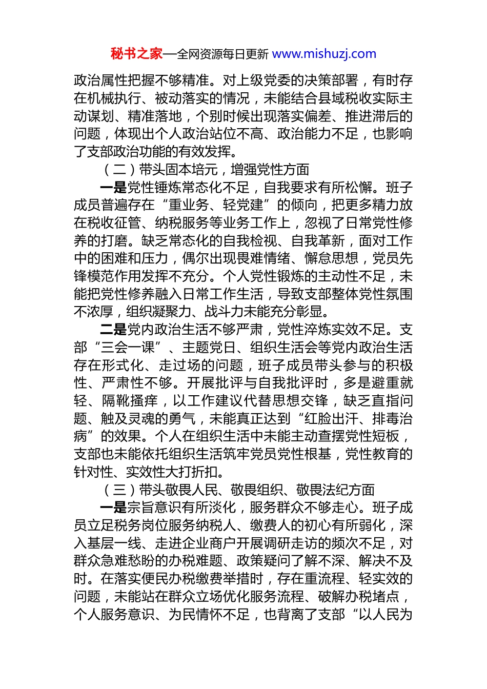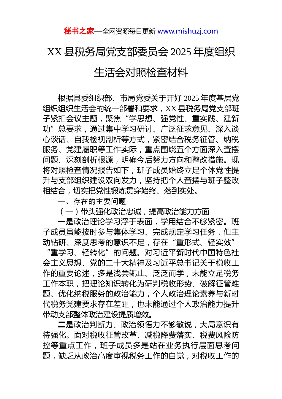 秘书之家—全网资源每日更新 www.mishuzj.comXX 县税务局党支部委员会 2025 年度组织生活会对照检查材料根据县委组织部、市局党委关于开好 2025 年度基层党组织组织生活会的统一部署和要求,XX 县税务局党支部班子紧扣会议主题,聚焦“学思想、强党性、重实践、建新功”总要求,通过集中学习研讨、广泛征求意见、深入谈心谈话、自我检视剖析等方式,紧密结合税务征管、纳税服务、党建履职等工作实际,重点围绕五个方面深入查摆问题、深刻剖析根源,明确今后努力方向和整改措施。现将对照检查情况报告如下,班子成员始终立足个体党性提升与支部组织建设双向发力,坚持把个人查摆与班子整改相结合,切实把党性锻炼贯穿始终、落到实处。一、存在的主要问题(一)带头强化政治忠诚,提高政治能力方面一是政治理论学习浮于表面,学用结合不够紧密。班子成员虽能按时参与集体学习、完成规定学习任务,但主动钻研、深度思考的意识不足,存在“重形式、轻实效”“重学习、轻转化”的问题。对习近平新时代中国特色社会主义思想、党的二十大精神及习近平总书记关于税收工作的重要论述,多是浅尝辄止、泛泛而学,未能立足税务工作本职,把理论知识转化为研判税收形势、破解征管难题、优化纳税服务的政治能力,个人政治理论素养与新时代税务党建要求存在差距,也未能通过个人政治能力提升带动支部整体政治建设提质增效。二是政治判断力、政治领悟力不够敏锐,大局意识有待强化。面对税收征管改革、减税降费落实、税费风险防控等重点工作,班子成员多是站在业务执行层面思考问题,缺乏从政治高度审视税务工作的自觉,对税收工作的秘书之家—全网资源每日更新 www.mishuzj.com政治属性把握不够精准。对上级党委的决策部署,有时存在机械执行、被动落实的情况,未能结合县域税收实际主动谋划、精准落地,个别时候出现落实偏差、推进滞后的问题,体现出个人政治站位不高、政治能力不足,也影响了支部政治功能的有效发挥。(二)带头固本培元,增强党性方面一是党性锤炼常态化不足,自我要求有所松懈。班子成员普遍存在“重业务、轻党建”的倾向,把更多精力放在税收征管、纳税服务等业务工作上,忽视了日常党性修养的打磨。缺乏常态化的自我检视、自我革新,面对工作中的困难和压力,偶尔出现畏难情绪、懈怠思想,党员先锋模范作用发挥不充分。个人党性锻炼的主动性不足,未能把党性修养融入日常工作生活,导致支部整体党性氛围不浓厚,组织凝聚力、战斗力未能充分彰显。二是党内政治生活不够严肃,党性淬炼实效不足。支部“三会一课”、主题党日、组织生活会等党内政治生活存在形式化、走过场的问题,班子成员带头参与的积极性、严肃性不够。开展批评与自我批评时,多是避重就轻、隔靴搔痒,以工作建议代替思想交锋,缺乏直指问题、触及灵魂的勇气,未能真正达到“红脸出汗、排毒治病”的效果。个人在组织生活中未能主动查摆党性短板,支部也未能依托组织生活筑牢党员党性根基,党性教育的针对性、实效性大打折扣。(三)带头敬畏人民、敬畏组织、敬畏法纪方面一是宗旨意识有所淡化,服务群众不够走心。班子成员立足税务岗位服务纳税人、缴费人的初心有所弱化,深入基层一线、走进企业商户开展调研走访的频次不足,对群众急难愁盼的办税难题、政策疑问了解不深、解决不及时。在落实便民办税缴费举措时,存在重流程、轻实效的问题,未能站在群众立场优化服务流程、破解办税堵点,个人服务意识、为民情怀不足,也背离了支部“以人民为秘书之家—全网资源每日更新 www.mishuzj.com中心”的服务宗旨,损害了税务部门的亲民形象。二是纪律规矩执行不够严格,敬畏之心有所弱化。班子成员对党章党规党纪、税务系统廉洁纪律要求的学习不够深入,执行纪律规矩存在“宽松软”的现象。个别成员对工作纪律、生活纪律的约束不够严格,存在迟到早退、工作期间精力不集中等细微问题,对身边党员的纪律提醒不够及时;在落实组织决策、服从组织安排上,偶尔存在讨价还价、消极应付的情况,个人敬畏组织、敬畏法纪的意识不强,也导致支部纪律作风建设不够扎实,未能筑牢廉洁从税的思想防线。(四)带头干事...