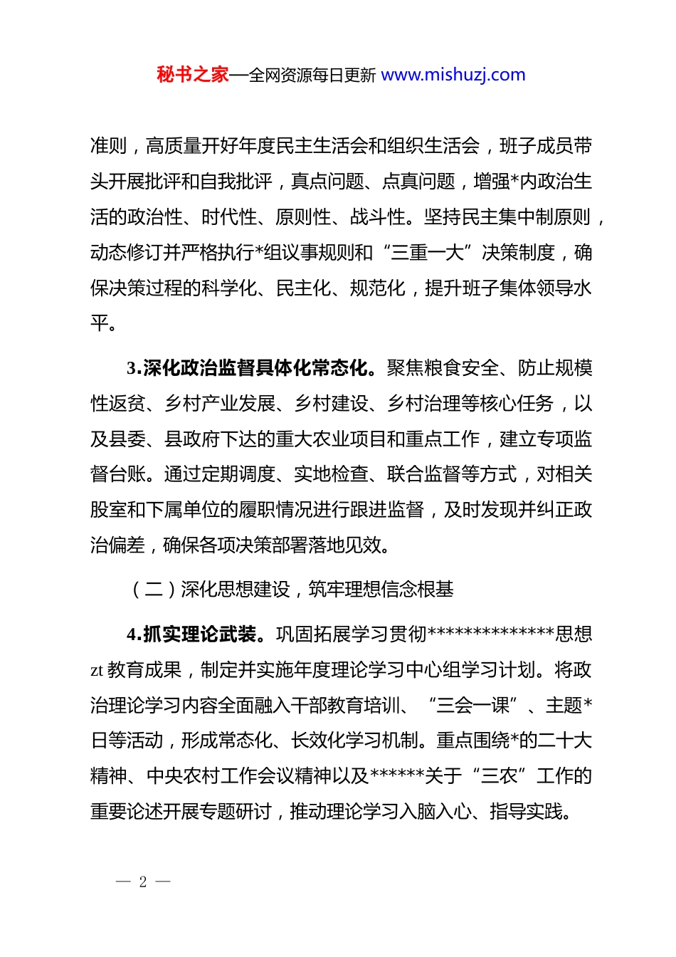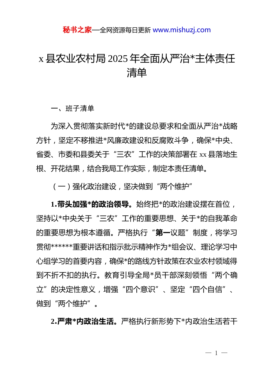 秘书之家—全网资源每日更新 www.mishuzj.comx 县农业农村局 2025 年全面从严治*主体责任清单一、班子清单为深入贯彻落实新时代*的建设总要求和全面从严治*战略方针,坚定不移推进*风廉政建设和反腐败斗争,确保*中央、省委、市委和县委关于“三农”工作的决策部署在 xx 县落地生根、开花结果,结合我局工作实际,制定本责任清单。(一)强化政治建设,坚决做到“两个维护”1.带头加强*的政治领导。始终把*的政治建设摆在首位,坚持以*中央关于“三农”工作的重要思想、关于*的自我革命的重要思想为根本遵循。严格执行“第一议题”制度,将学习贯彻******重要讲话和指示批示精神作为*组会议、理论学习中心组学习的首要内容,确保*的路线方针政策在农业农村领域得到不折不扣的执行。教育引导全局*员干部深刻领悟“两个确立”的决定性意义,增强“四个意识”、坚定“四个自信”、做到“两个维护”。2.严肃*内政治生活。严格执行新形势下*内政治生活若干— 1 —秘书之家—全网资源每日更新 www.mishuzj.com准则,高质量开好年度民主生活会和组织生活会,班子成员带头开展批评和自我批评,真点问题、点真问题,增强*内政治生活的政治性、时代性、原则性、战斗性。坚持民主集中制原则,动态修订并严格执行*组议事规则和“三重一大”决策制度,确保决策过程的科学化、民主化、规范化,提升班子集体领导水平。3.深化政治监督具体化常态化。聚焦粮食安全、防止规模性返贫、乡村产业发展、乡村建设、乡村治理等核心任务,以及县委、县政府下达的重大农业项目和重点工作,建立专项监督台账。通过定期调度、实地检查、联合监督等方式,对相关股室和下属单位的履职情况进行跟进监督,及时发现并纠正政治偏差,确保各项决策部署落地见效。(二)深化思想建设,筑牢理想信念根基4.抓实理论武装。巩固拓展学习贯彻**************思想zt 教育成果,制定并实施年度理论学习中心组学习计划。将政治理论学习内容全面融入干部教育培训、“三会一课”、主题*日等活动,形成常态化、长效化学习机制。重点围绕*的二十大精神、中央农村工作会议精神以及******关于“三农”工作的重要论述开展专题研讨,推动理论学习入脑入心、指导实践。— 2 —秘书之家—全网资源每日更新 www.mishuzj.com5.压实意识形态工作责任。严格落实意识形态工作责任制,*组每年至少两次专题研究意识形态工作,分析研判农业农村领域的意识形态风险点。加强对涉农舆情特别是有关粮食安全、农产品质量安全、惠农政策等敏感信息的监测、预警和处置。加强对局系统内网站、公众号等宣传阵地的管理,弘扬主旋律,传播正能量,讲好 xx“三农”故事。6.培育积极健康的*内政治文化。引导广大*员干部继承*的光荣传统和优良作风,牢记“三个务必”,践行“三严三实”。弘扬和践行忠诚老实、公道正派、实事求是、清正廉洁的价值观,营造风清气正的机关政治生态。(三)夯实组织建设,锻造坚强战斗堡垒7.加强领导班子自身建设。班子成员带头讲政治、顾大局、守纪律,以上率下,发挥“头雁效应”。严格执行重大事项请示报告制度,自觉接受组织和群众监督。加强班子成员之间的沟通协作,形成团结干事、合力攻坚的良好氛围。8.树立正确选人用人导向。坚持*管干部原则和新时代好干部标准,严格执行干部选拔任用工作条例。突出政治标准,注重在乡村振兴、产业发展、项目建设等一线考察识别干部,把— 3 —秘书之家—全网资源每日更新 www.mishuzj.com敢于负责、勇于担当、善于作为、实绩突出的干部选出来、用起来。加强对年轻干部的培养、教育和管理。9.提升基层*组织组织力。全面负责局系统*的建设工作,制定印发年度 dj 工作要点,年底开展*支部书记抓基层 dj 述职评议考核。指导各*支部严格执行“三会一课”、民主评议*员等制度,推动*支部标准化规范化建设。深化 dj 与业务融合,探索设立“*员先锋岗”“*员责任区”,引导*员在推动农业高质量发展中发挥先锋模范作用。(四)持之以恒正风肃纪,营造清朗干事环境10.锲而不舍落实中央八项规定精神。持续深化作风建设,对标对表中央八项规定及其实施细则精神,紧盯“四风”问...