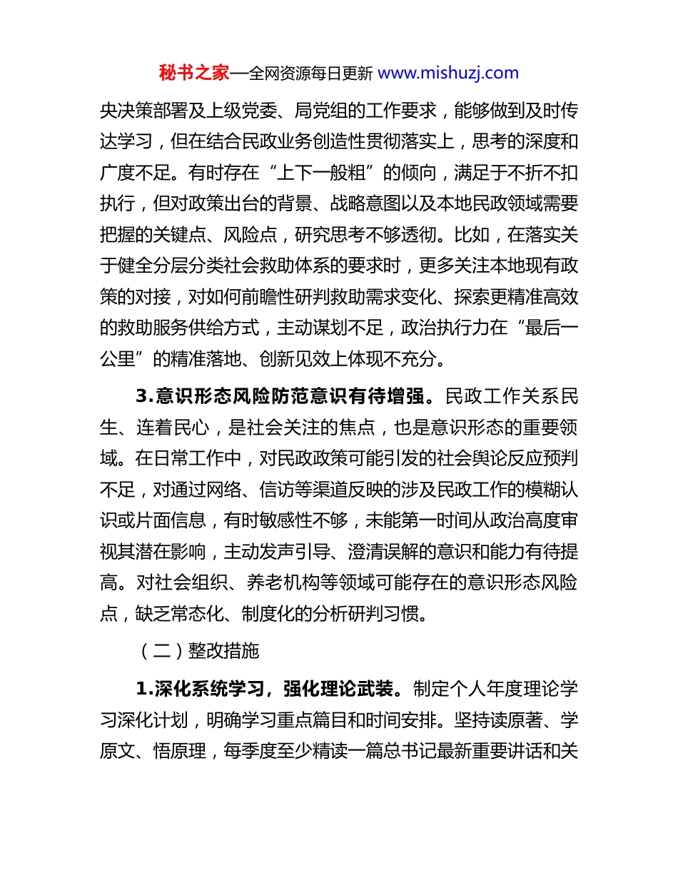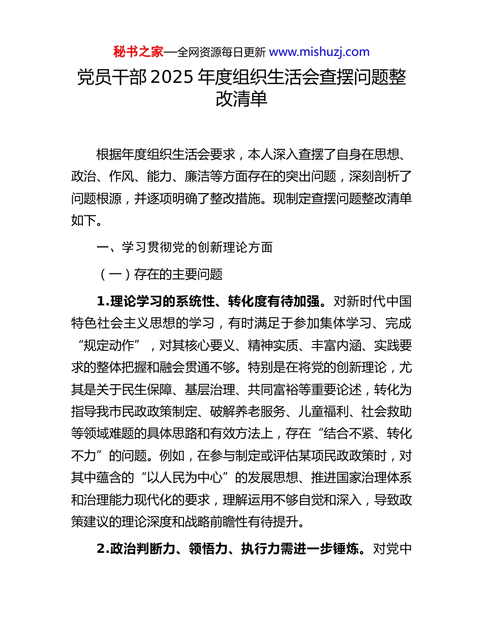 秘书之家—全网资源每日更新 www.mishuzj.com党员干部 2025 年度组织生活会查摆问题整改清单根据年度组织生活会要求,本人深入查摆了自身在思想、政治、作风、能力、廉洁等方面存在的突出问题,深刻剖析了问题根源,并逐项明确了整改措施。现制定查摆问题整改清单如下。一、学习贯彻党的创新理论方面(一)存在的主要问题1.理论学习的系统性、转化度有待加强。对新时代中国特色社会主义思想的学习,有时满足于参加集体学习、完成“规定动作”,对其核心要义、精神实质、丰富内涵、实践要求的整体把握和融会贯通不够。特别是在将党的创新理论,尤其是关于民生保障、基层治理、共同富裕等重要论述,转化为指导我市民政政策制定、破解养老服务、儿童福利、社会救助等领域难题的具体思路和有效方法上,存在“结合不紧、转化不力”的问题。例如,在参与制定或评估某项民政政策时,对其中蕴含的“以人民为中心”的发展思想、推进国家治理体系和治理能力现代化的要求,理解运用不够自觉和深入,导致政策建议的理论深度和战略前瞻性有待提升。2.政治判断力、领悟力、执行力需进一步锤炼。对党中秘书之家—全网资源每日更新 www.mishuzj.com央决策部署及上级党委、局党组的工作要求,能够做到及时传达学习,但在结合民政业务创造性贯彻落实上,思考的深度和广度不足。有时存在“上下一般粗”的倾向,满足于不折不扣执行,但对政策出台的背景、战略意图以及本地民政领域需要把握的关键点、风险点,研究思考不够透彻。比如,在落实关于健全分层分类社会救助体系的要求时,更多关注本地现有政策的对接,对如何前瞻性研判救助需求变化、探索更精准高效的救助服务供给方式,主动谋划不足,政治执行力在“最后一公里”的精准落地、创新见效上体现不充分。3.意识形态风险防范意识有待增强。民政工作关系民生、连着民心,是社会关注的焦点,也是意识形态的重要领域。在日常工作中,对民政政策可能引发的社会舆论反应预判不足,对通过网络、信访等渠道反映的涉及民政工作的模糊认识或片面信息,有时敏感性不够,未能第一时间从政治高度审视其潜在影响,主动发声引导、澄清误解的意识和能力有待提高。对社会组织、养老机构等领域可能存在的意识形态风险点,缺乏常态化、制度化的分析研判习惯。(二)整改措施1.深化系统学习,强化理论武装。制定个人年度理论学习深化计划,明确学习重点篇目和时间安排。坚持读原著、学原文、悟原理,每季度至少精读一篇总书记最新重要讲话和关秘书之家—全网资源每日更新 www.mishuzj.com于民政民生工作的重要指示批示精神,并结合分管或从事的业务工作,撰写 1-2 篇有深度、有见解的学习体会或理论文章,着力在“深化、内化、转化”上下功夫,切实将学习成果转化为谋划民政工作的思路、促进民政事业发展的举措。2.提升政治能力,狠抓落实见效。建立健全政策学习研究机制,在接到上级决策部署或局党组工作安排后,首先深入学习领会其政治意图和实践要求,主动研究民政领域落实的切入点、着力点。在起草文件、制定方案、推动工作时,自觉对标对表党的理论和路线方针政策,确保民政工作始终沿着正确政治方向前进。注重培养战略思维和底线思维,提高对民政领域复杂局面的政治研判能力。3.筑牢意识形态防线,压实政治责任。增强政治敏锐性和政治鉴别力,密切关注民政相关舆情动态,定期分析研判民政领域意识形态风险。在政策制定、宣传解读、信访接待等工作中,主动设置议题,弘扬主旋律,传播正能量。严格落实意识形态工作责任制相关要求,对职责范围内的意识形态阵地做到守土有责、守土负责、守土尽责。(三)整改时限持续推进,长期坚持。力争在 2026 年 6 月底前,理论学习转化应用能力、政治执行力有明显提升,并形成常态。二、加强党性锤炼方面秘书之家—全网资源每日更新 www.mishuzj.com(一)存在的主要问题1.党性修养的自觉性、常态化有差距。在民政业务工作繁忙时,有时不自觉地放松了党性锻炼的标准和要求,将组织生活视为“软任务”,参加“三会一课”、主题党日等活动有时存在“身在心不在”的情况。对党章党规党纪的学习,特别是新修订的《中国...