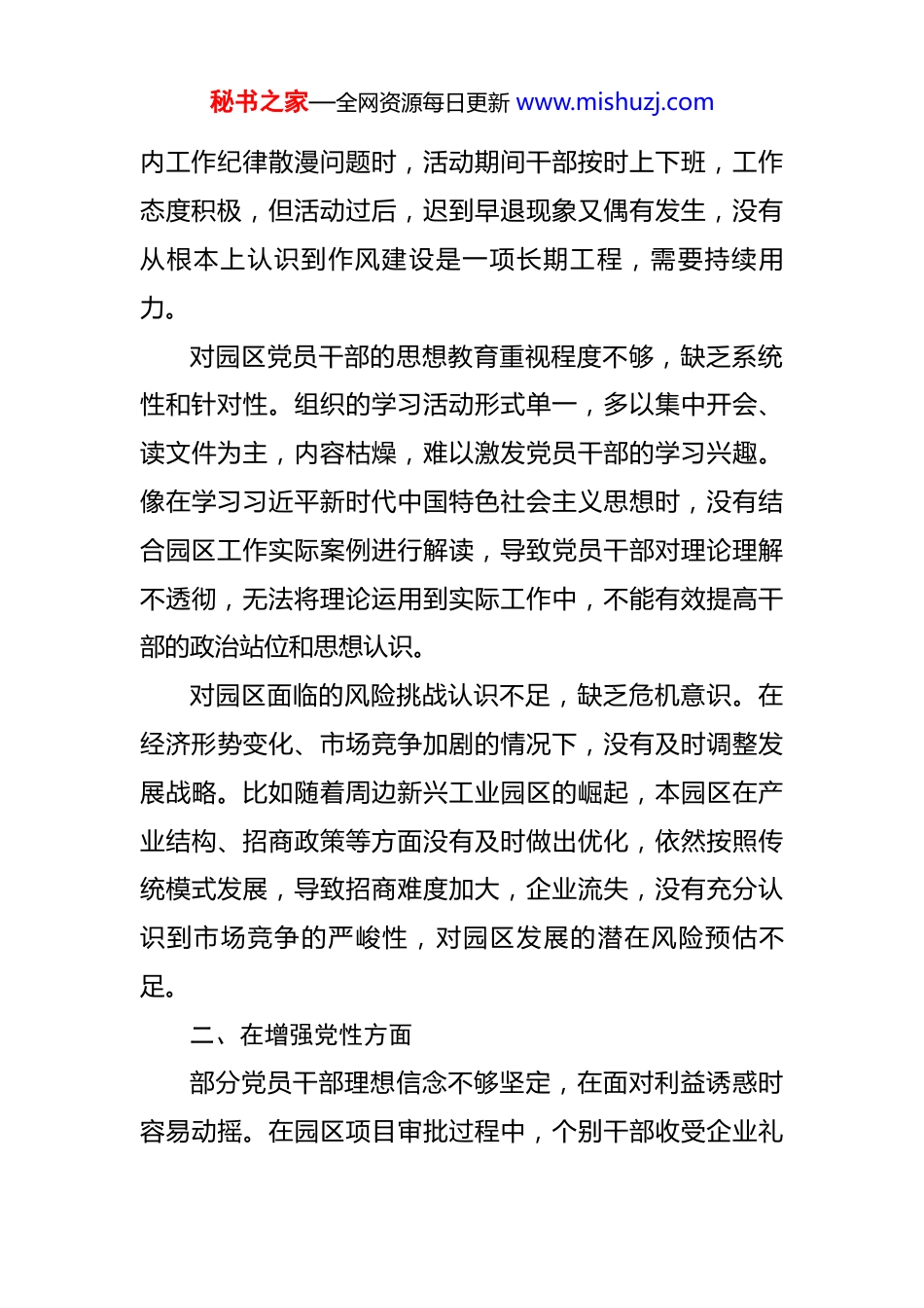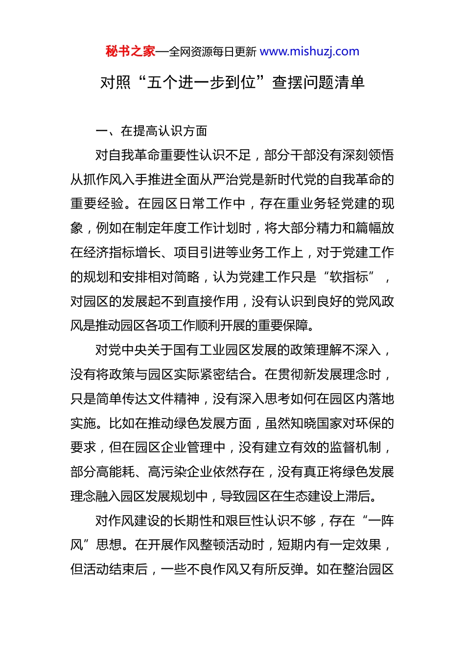 秘书之家—全网资源每日更新 www.mishuzj.com对照“五个进一步到位”查摆问题清单 一、在提高认识方面对自我革命重要性认识不足,部分干部没有深刻领悟从抓作风入手推进全面从严治党是新时代党的自我革命的重要经验。在园区日常工作中,存在重业务轻党建的现象,例如在制定年度工作计划时,将大部分精力和篇幅放在经济指标增长、项目引进等业务工作上,对于党建工作的规划和安排相对简略,认为党建工作只是“软指标”,对园区的发展起不到直接作用,没有认识到良好的党风政风是推动园区各项工作顺利开展的重要保障。对党中央关于国有工业园区发展的政策理解不深入,没有将政策与园区实际紧密结合。在贯彻新发展理念时,只是简单传达文件精神,没有深入思考如何在园区内落地实施。比如在推动绿色发展方面,虽然知晓国家对环保的要求,但在园区企业管理中,没有建立有效的监督机制,部分高能耗、高污染企业依然存在,没有真正将绿色发展理念融入园区发展规划中,导致园区在生态建设上滞后。对作风建设的长期性和艰巨性认识不够,存在“一阵风”思想。在开展作风整顿活动时,短期内有一定效果,但活动结束后,一些不良作风又有所反弹。如在整治园区秘书之家—全网资源每日更新 www.mishuzj.com内工作纪律散漫问题时,活动期间干部按时上下班,工作态度积极,但活动过后,迟到早退现象又偶有发生,没有从根本上认识到作风建设是一项长期工程,需要持续用力。对园区党员干部的思想教育重视程度不够,缺乏系统性和针对性。组织的学习活动形式单一,多以集中开会、读文件为主,内容枯燥,难以激发党员干部的学习兴趣。像在学习习近平新时代中国特色社会主义思想时,没有结合园区工作实际案例进行解读,导致党员干部对理论理解不透彻,无法将理论运用到实际工作中,不能有效提高干部的政治站位和思想认识。对园区面临的风险挑战认识不足,缺乏危机意识。在经济形势变化、市场竞争加剧的情况下,没有及时调整发展战略。比如随着周边新兴工业园区的崛起,本园区在产业结构、招商政策等方面没有及时做出优化,依然按照传统模式发展,导致招商难度加大,企业流失,没有充分认识到市场竞争的严峻性,对园区发展的潜在风险预估不足。二、在增强党性方面部分党员干部理想信念不够坚定,在面对利益诱惑时容易动摇。在园区项目审批过程中,个别干部收受企业礼秘书之家—全网资源每日更新 www.mishuzj.com品礼金,为不符合条件的企业开绿灯。例如某企业为了快速通过项目审批,向负责审批的干部送了高档烟酒和购物卡,该干部没有坚守原则,违规为其加快审批流程,损害了园区的公平公正和公共利益,这反映出其理想信念不坚定,党性修养缺失。对党忠诚意识有待加强,存在言行不一的情况。有些干部在公开场合表态坚决拥护党的领导,但在私下却发表不当言论,对党的政策指指点点。在园区落实某项政策时,个别干部表面上积极响应,实际工作中却消极怠工,敷衍了事,没有真正做到对党忠诚、为党分忧,破坏了党组织在群众中的形象。为人民服务的宗旨意识淡薄,在处理园区企业和群众问题时,存在推诿扯皮现象。当企业反映园区基础设施建设不完善,影响生产经营时,相关部门之间相互推诿责任,没有积极主动去解决问题。比如道路破损、水电供应不稳定等问题长期存在,企业多次反映无果,干部没有将企业和群众的利益放在首位,没有践行好为人民服务的宗旨。道德品质修养不够,在工作和生活中缺乏自律。部分干部在工作中作风粗暴,对待同事和企业工作人员态度恶劣,缺乏基本的礼貌和尊重。在生活中,存在铺张浪费、秘书之家—全网资源每日更新 www.mishuzj.com追求享乐的现象,如在公务接待中超标准用餐,违规使用公车办私事等,没有树立良好的道德风尚,影响了党员干部的整体形象。参加党内政治生活不积极,敷衍了事。在组织生活会和民主评议党员时,没有认真开展批评与自我批评,只是走过场。比如在组织生活会上,对自己的问题轻描淡写,对他人的批评也是避重就轻,没有真正达到红脸出汗、增进团结、促进工作的目的,没有充分利用党内政治生活来提升自己的党性修养。三、在规范权力运行方面园区权力运行制度...