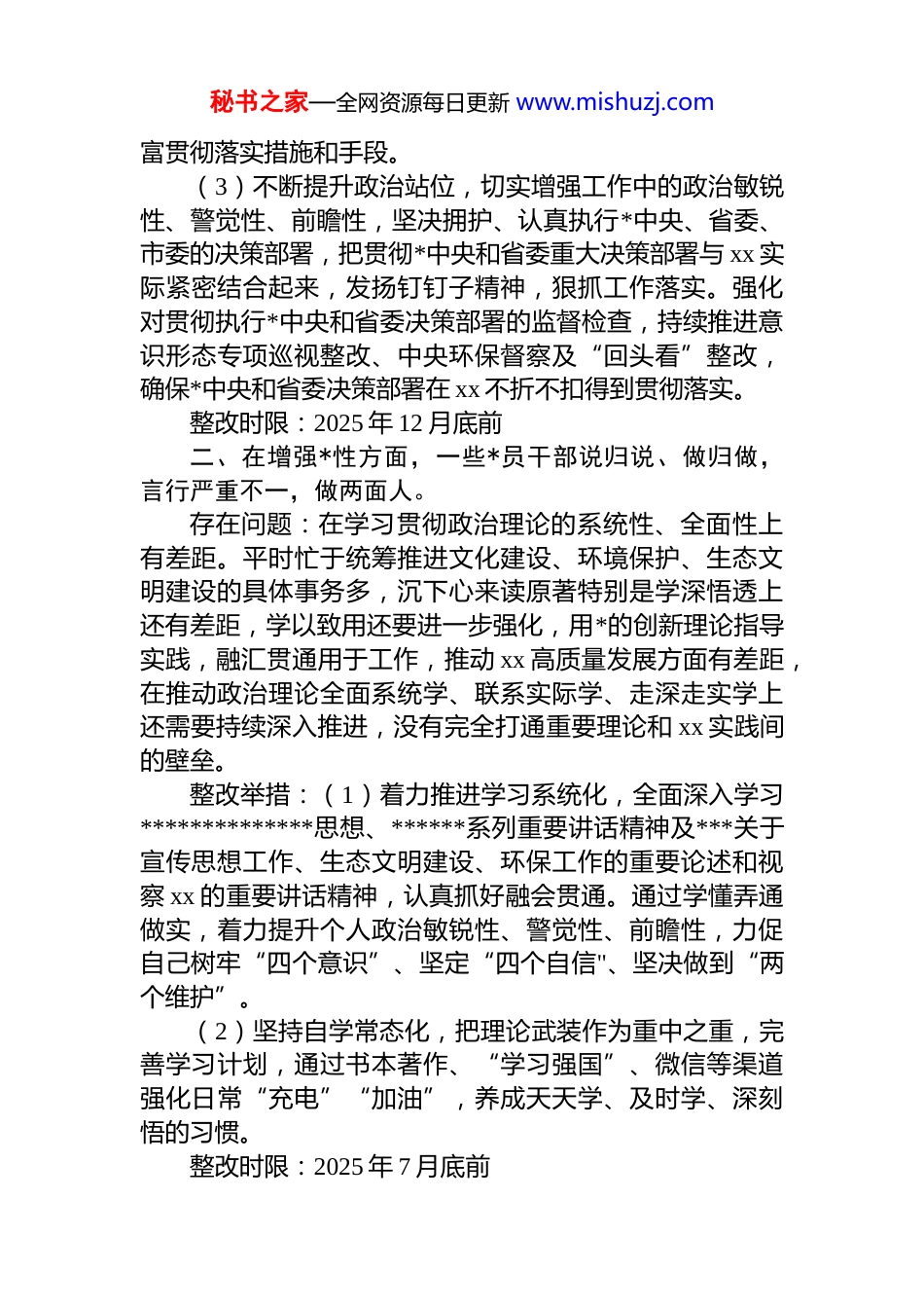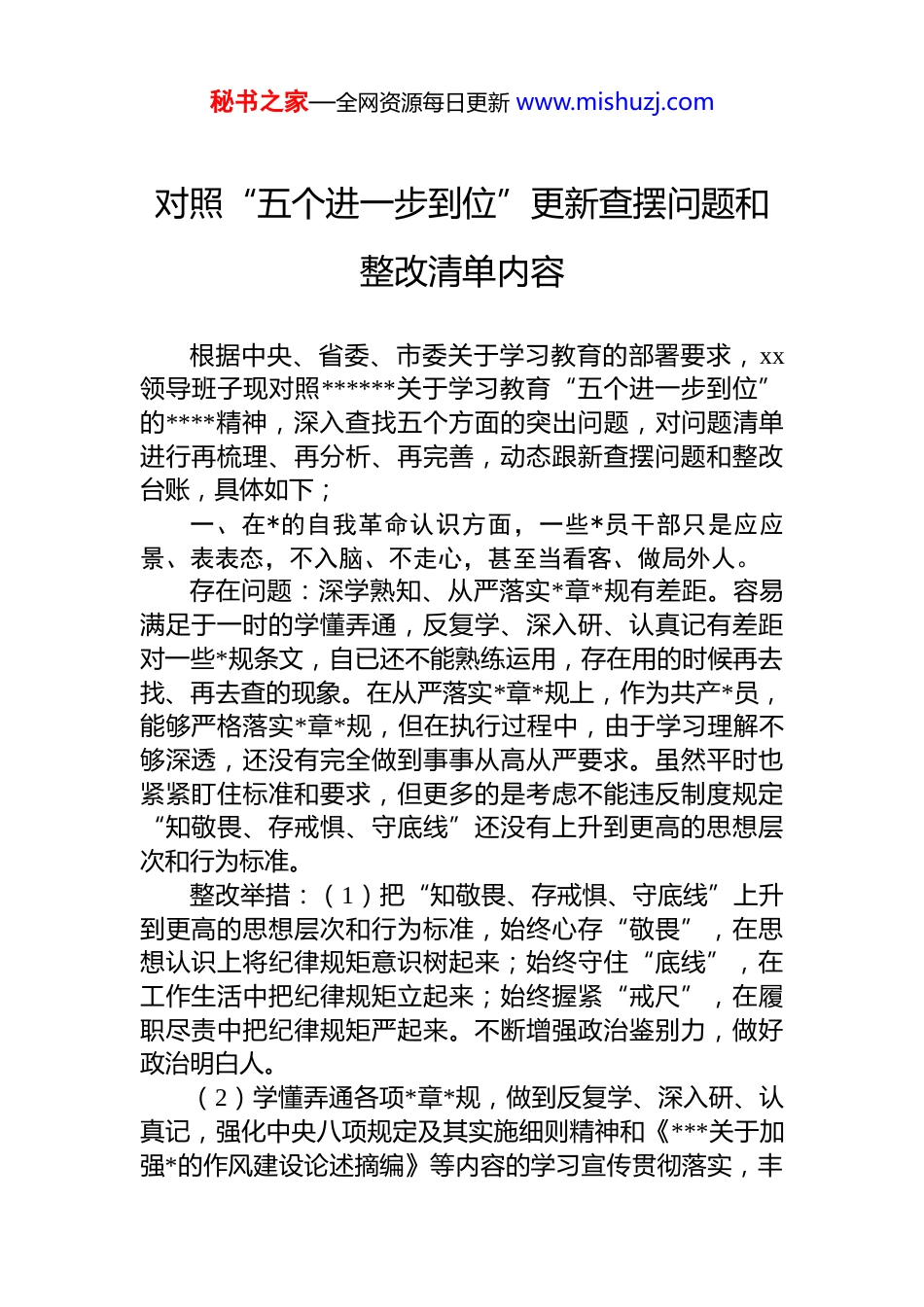 秘书之家—全网资源每日更新 www.mishuzj.com对照“五个进一步到位”更新查摆问题和整改清单内容根据中央、省委、市委关于学习教育的部署要求,xx领导班子现对照******关于学习教育“五个进一步到位”的****精神,深入查找五个方面的突出问题,对问题清单进行再梳理、再分析、再完善,动态跟新查摆问题和整改台账,具体如下;一、在*的自我革命认识方面,一些*员干部只是应应景、表表态,不入脑、不走心,甚至当看客、做局外人。存在问题:深学熟知、从严落实*章*规有差距。容易满足于一时的学懂弄通,反复学、深入研、认真记有差距对一些*规条文,自已还不能熟练运用,存在用的时候再去找、再去查的现象。在从严落实*章*规上,作为共产*员,能够严格落实*章*规,但在执行过程中,由于学习理解不够深透,还没有完全做到事事从高从严要求。虽然平时也紧紧盯住标准和要求,但更多的是考虑不能违反制度规定“知敬畏、存戒惧、守底线”还没有上升到更高的思想层次和行为标准。整改举措:(1)把“知敬畏、存戒惧、守底线”上升到更高的思想层次和行为标准,始终心存“敬畏”,在思想认识上将纪律规矩意识树起来;始终守住“底线”,在工作生活中把纪律规矩立起来;始终握紧“戒尺”,在履职尽责中把纪律规矩严起来。不断增强政治鉴别力,做好政治明白人。(2)学懂弄通各项*章*规,做到反复学、深入研、认真记,强化中央八项规定及其实施细则精神和《***关于加强*的作风建设论述摘编》等内容的学习宣传贯彻落实,丰秘书之家—全网资源每日更新 www.mishuzj.com富贯彻落实措施和手段。(3)不断提升政治站位,切实增强工作中的政治敏锐性、警觉性、前瞻性,坚决拥护、认真执行*中央、省委、市委的决策部署,把贯彻*中央和省委重大决策部署与 xx 实际紧密结合起来,发扬钉钉子精神,狠抓工作落实。强化对贯彻执行*中央和省委决策部署的监督检查,持续推进意识形态专项巡视整改、中央环保督察及“回头看”整改,确保*中央和省委决策部署在 xx 不折不扣得到贯彻落实。整改时限:2025 年 12 月底前二、在增强*性方面,一些*员干部说归说、做归做,言行严重不一,做两面人。存在问题:在学习贯彻政治理论的系统性、全面性上有差距。平时忙于统筹推进文化建设、环境保护、生态文明建设的具体事务多,沉下心来读原著特别是学深悟透上还有差距,学以致用还要进一步强化,用*的创新理论指导实践,融汇贯通用于工作,推动 xx 高质量发展方面有差距,在推动政治理论全面系统学、联系实际学、走深走实学上还需要持续深入推进,没有完全打通重要理论和 xx 实践间的壁垒。整改举措:(1)着力推进学习系统化,全面深入学习**************思想、******系列重要讲话精神及***关于宣传思想工作、生态文明建设、环保工作的重要论述和视察 xx 的重要讲话精神,认真抓好融会贯通。通过学懂弄通做实,着力提升个人政治敏锐性、警觉性、前瞻性,力促自己树牢“四个意识”、坚定“四个自信"、坚决做到“两个维护”。(2)坚持自学常态化,把理论武装作为重中之重,完善学习计划,通过书本著作、“学习强国”、微信等渠道强化日常“充电”“加油”,养成天天学、及时学、深刻悟的习惯。整改时限:2025 年 7 月底前秘书之家—全网资源每日更新 www.mishuzj.com三、在权力规范运行方面,一些领导干部把权力操弄成生意经,不仅肆无忌惮,而且绞尽脑汁、花样翻新。存在问题:严格教育监管还有弱项。工作中有时有老好人思想,对存在的苗头性、倾向性问题咬耳扯袖做得还不够。履行从严治*责任方面的督促检查、责任追究抓得还不够具体,对*的建设重视不够,宏观指导多,抓业务工作多,抓 dj 工作相对较少。严肃批评教育、执纪问责等方面做得还不够,督促提升管理水平和加强制度落实还有差距严格干部教育管理监督上还有弱项。具体工作中,对一些轻微违纪的人和事,还存在较真碰硬不够的现象。整改举措:(1)自觉遵守纪律,守住底线,坚持自省自警、公私分明、规范用权,强化监督管理,进一步提升分管领域*组织、派驻纪检机构监督管理能力,狠抓监督落实,把监督检查、目标考核、责任追究结合起来,...
