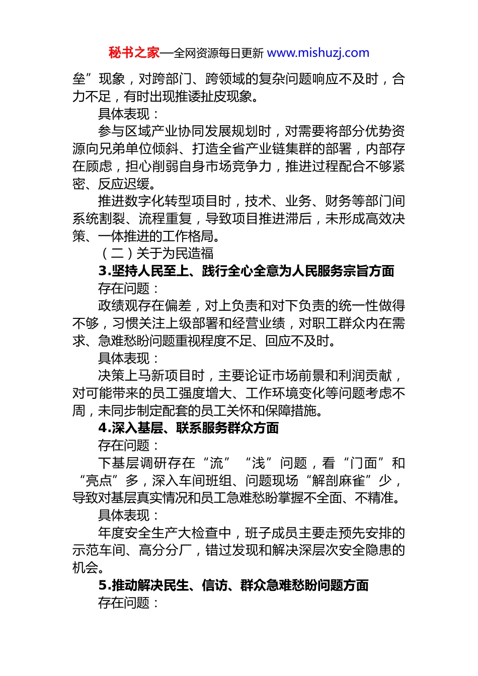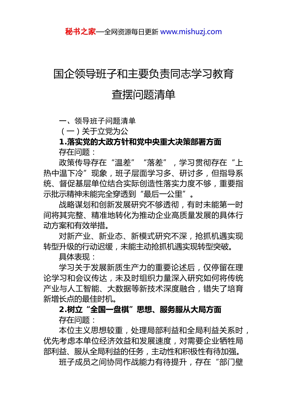 秘书之家—全网资源每日更新 www.mishuzj.com国企领导班子和主要负责同志学习教育查摆问题清单一、领导班子问题清单(一)关于立党为公1.落实党的大政方针和党中央重大决策部署方面存在问题:政策传导存在“温差”“落差”,学习贯彻存在“上热中温下冷”现象,班子层面学习多、研讨多,但指导系统、督促基层单位结合实际创造性落实力度不够,重要指示批示精神未能完全穿透到“最后一公里”。战略谋划和创新发展研究不够透彻,有时未能第一时间将其完整、精准地转化为推动企业高质量发展的具体行动方案和有效举措。对新产业、新业态、新模式研究不深,抢抓机遇实现转型升级的行动迟缓,未能主动抢抓机遇实现转型突破。具体表现:学习关于发展新质生产力的重要论述后,仅停留在理论学习和会议传达,未及时组织力量深入研究如何将传统产业与人工智能、大数据等新技术深度融合,错失了培育新增长点的最佳时机。2.树立“全国一盘棋”思想、服务服从大局方面存在问题:本位主义思想较重,处理局部利益和全局利益关系时,优先考虑本单位经济效益和发展速度,对需要企业牺牲局部利益、服从全局利益的任务,主动性和积极性有待加强。班子成员之间协同作战能力有待提升,存在“部门壁秘书之家—全网资源每日更新 www.mishuzj.com垒”现象,对跨部门、跨领域的复杂问题响应不及时,合力不足,有时出现推诿扯皮现象。具体表现:参与区域产业协同发展规划时,对需要将部分优势资源向兄弟单位倾斜、打造全省产业链集群的部署,内部存在顾虑,担心削弱自身市场竞争力,推进过程配合不够紧密、反应迟缓。推进数字化转型项目时,技术、业务、财务等部门间系统割裂、流程重复,导致项目推进滞后,未形成高效决策、一体推进的工作格局。(二)关于为民造福3.坚持人民至上、践行全心全意为人民服务宗旨方面存在问题:政绩观存在偏差,对上负责和对下负责的统一性做得不够,习惯关注上级部署和经营业绩,对职工群众内在需求、急难愁盼问题重视程度不足、回应不及时。具体表现:决策上马新项目时,主要论证市场前景和利润贡献,对可能带来的员工强度增大、工作环境变化等问题考虑不周,未同步制定配套的员工关怀和保障措施。4.深入基层、联系服务群众方面存在问题:下基层调研存在“流”“浅”问题,看“门面”和“亮点”多,深入车间班组、问题现场“解剖麻雀”少,导致对基层真实情况和员工急难愁盼掌握不全面、不精准。具体表现:年度安全生产大检查中,班子成员主要走预先安排的示范车间、高分分厂,错过发现和解决深层次安全隐患的机会。5.推动解决民生、信访、群众急难愁盼问题方面存在问题:秘书之家—全网资源每日更新 www.mishuzj.com对需要多部门协调的遗留问题,缺乏一抓到底的韧劲,部分职工反映多年的合理诉求未能得到根本性解决。具体表现:部分职工反映的生活区物业管理混乱、基础设施陈旧问题,虽多次开会研究形成方案,但因属地协调难、资金落实慢,迟迟没有实质性进展。(三)关于科学决策6.贯彻执行民主集中制方面存在问题:执行不够规范,会前酝酿和沟通不充分,部分成员对议题不甚了解,讨论质量不高;有时主要领导意见表达过早,存在“先定调、后讨论”现象,影响集体智慧充分发挥。具体表现:讨论子公司重组方案时,仅在会前简短通知,会上才看到具体内容,未能深入思考研究,最终讨论流于形式、仓促通过。7.政策规划“翻烧饼”问题存在问题:对市场变化反应过于敏感,部分营销策略、产业布局调整频繁,缺乏战略定力,给基层单位和职工带来困扰,影响政策执行的稳定性和连续性。具体表现:一年内将核心业务从“加油返利”调整为“免费洗车”,再变为“高速通行费折扣”,频繁变动让一线客户经理难以长期培育客户,也影响老用户黏性。8.违反群众意愿不切实际决策的问题存在问题:推出新产品/新功能时,过度依赖内部评估和数据分析,对目标客户真实使用习惯和接受度调研不够深入,导致产品/功能使用率低、不接地气。秘书之家—全网资源每日更新 www.mishuzj.com具体表现:在手机银行 APP 开发复杂线上财务规划工具,初衷是帮助客户资产配置,但上线后使用率极低,客户反馈功...