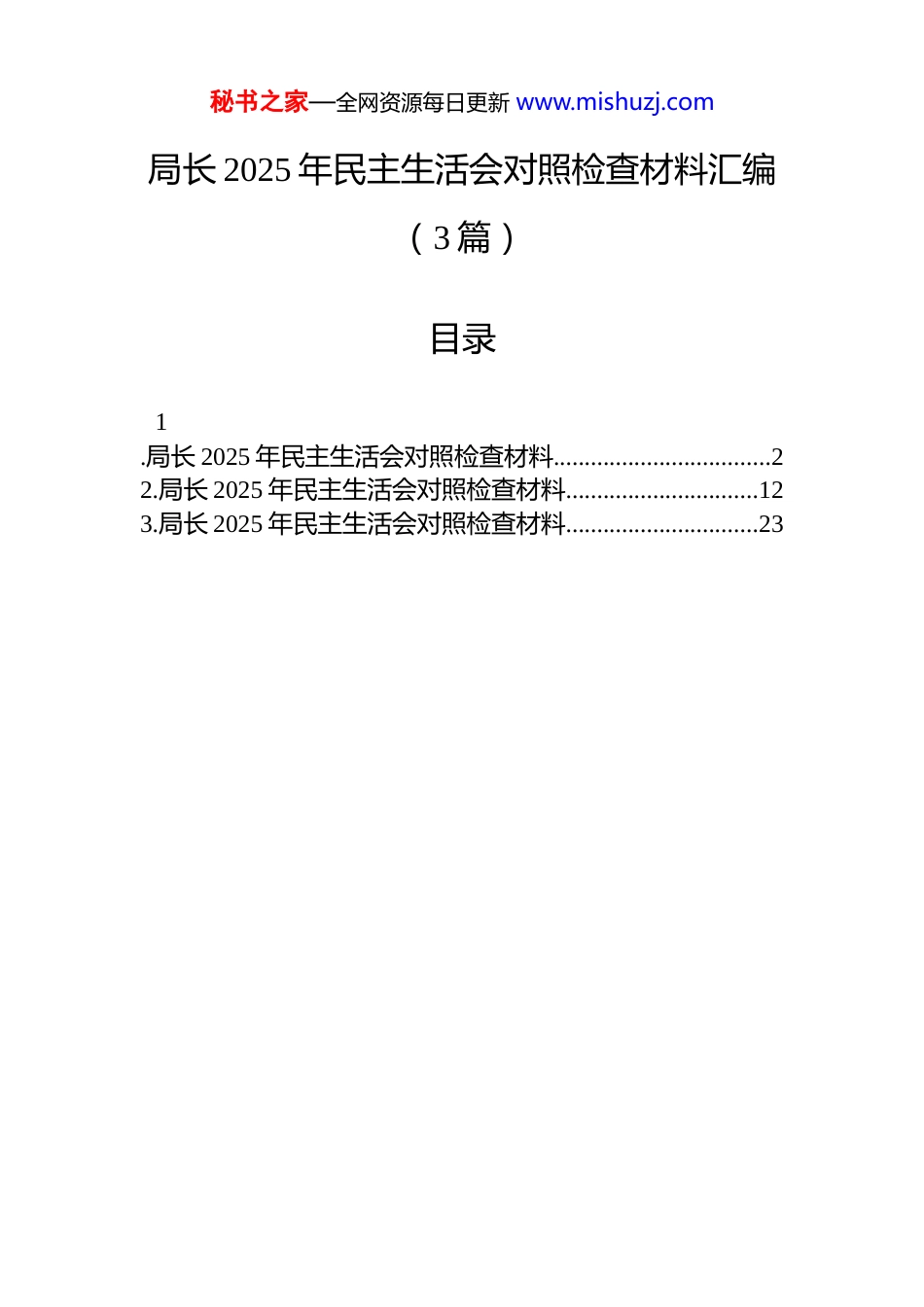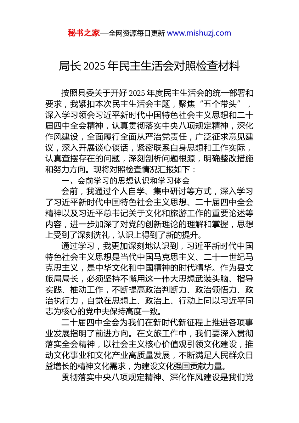 秘书之家—全网资源每日更新 www.mishuzj.com局长 2025 年民主生活会对照检查材料汇编(3 篇)目录1.局长 2025 年民主生活会对照检查材料...................................22.局长 2025 年民主生活会对照检查材料...............................123.局长 2025 年民主生活会对照检查材料...............................23秘书之家—全网资源每日更新 www.mishuzj.com局长 2025 年民主生活会对照检查材料按照县委关于开好 2025 年度民主生活会的统一部署和要求,我紧扣本次民主生活会主题,聚焦“五个带头”,深入学习领会习近平新时代中国特色社会主义思想和二十届四中全会精神,认真贯彻落实中央八项规定精神,深化作风建设,全面履行全面从严治党责任,广泛征求意见建议,深入开展谈心谈话,紧密联系自身思想和工作实际,认真查摆存在的问题,深刻剖析问题根源,明确整改措施和努力方向。现将对照检查情况汇报如下:一、会前学习的思想认识和学习体会会前,我通过个人自学、集中研讨等方式,深入学习了习近平新时代中国特色社会主义思想、二十届四中全会精神以及习近平总书记关于文化和旅游工作的重要论述等内容,进一步加深了对党的创新理论的理解和掌握,思想上受到了深刻洗礼,认识上得到了新的提升。通过学习,我更加深刻地认识到,习近平新时代中国特色社会主义思想是当代中国马克思主义、二十一世纪马克思主义,是中华文化和中国精神的时代精华。作为县文旅局局长,必须坚持不懈用这一伟大思想武装头脑、指导实践、推动工作,不断提高政治判断力、政治领悟力、政治执行力,自觉在思想上、政治上、行动上同以习近平同志为核心的党中央保持高度一致。二十届四中全会为我们在新时代新征程上推进各项事业发展指明了前进方向。在文旅工作中,我们要深入贯彻落实全会精神,以社会主义核心价值观引领文化建设,推动文化事业和文化产业高质量发展,不断满足人民群众日益增长的精神文化需求,为建设文化强国贡献力量。贯彻落实中央八项规定精神、深化作风建设是我们党秘书之家—全网资源每日更新 www.mishuzj.com保持先进性和纯洁性的重要举措。我们要始终保持清醒头脑,严格遵守党的纪律规矩,坚决反对形式主义、官僚主义,切实改进工作作风,树立良好的文旅系统形象。全面从严治党是我们党永葆生机活力、走好新的赶考之路的必由之路。作为文旅系统全面从严治党的第一责任人,我要切实扛起管党治党责任,坚持党对文旅工作的全面领导,加强干部队伍建设,营造风清气正的政治生态。二、存在问题(一)带头强化政治忠诚、提高政治能力方面一是理论学习的深度和系统性不足。虽然能够积极参加各类学习活动,但在学习过程中存在一知半解、浅尝辄止的情况,缺乏对习近平新时代中国特色社会主义思想和二十届四中全会精神的系统研究和深入思考。对一些重要理论和政策的理解还停留在表面,没有真正做到学深悟透、融会贯通,运用党的创新理论指导文旅工作实践的能力还有待提高。二是政治敏锐性和政治鉴别力有待增强。在面对一些复杂的社会舆情和文化现象时,有时不能从政治高度敏锐地洞察问题的本质和潜在影响,缺乏见微知著的能力。对一些错误思潮和不良文化倾向的斗争不够坚决,存在事不关己、高高挂起的思想,没有充分发挥党员领导干部的政治引领作用。三是贯彻落实上级决策部署的力度不够。在贯彻落实党中央和上级党委关于文旅工作的决策部署时,有时存在打折扣、搞变通的现象。对一些重点工作任务,缺乏钉钉子精神,抓落实的力度不够,导致部分工作推进缓慢,没有达到预期效果。(二)带头固本培元、增强党性方面一是党性修养不够自觉。在日常工作和生活中,有时放松了对自己的严格要求,缺乏自我反省和自我约束的意识。对一些小事小节不够重视,没有时刻以党员的高标准秘书之家—全网资源每日更新 www.mishuzj.com严格要求自己,在一定程度上影响了党员领导干部的形象。二是宗旨意识有所淡化。在工作中,有时过于注重业务工作,而忽视了人民群众的需求和感受。对群众反映的一些文旅方面的问题,没有及时给予回应和解决,存在推诿扯皮的现象,没有真正做到想群众之...