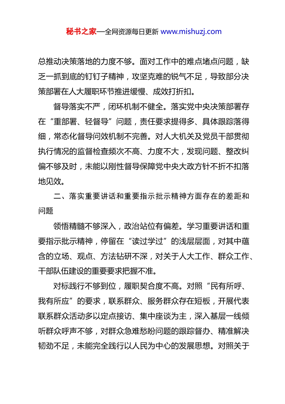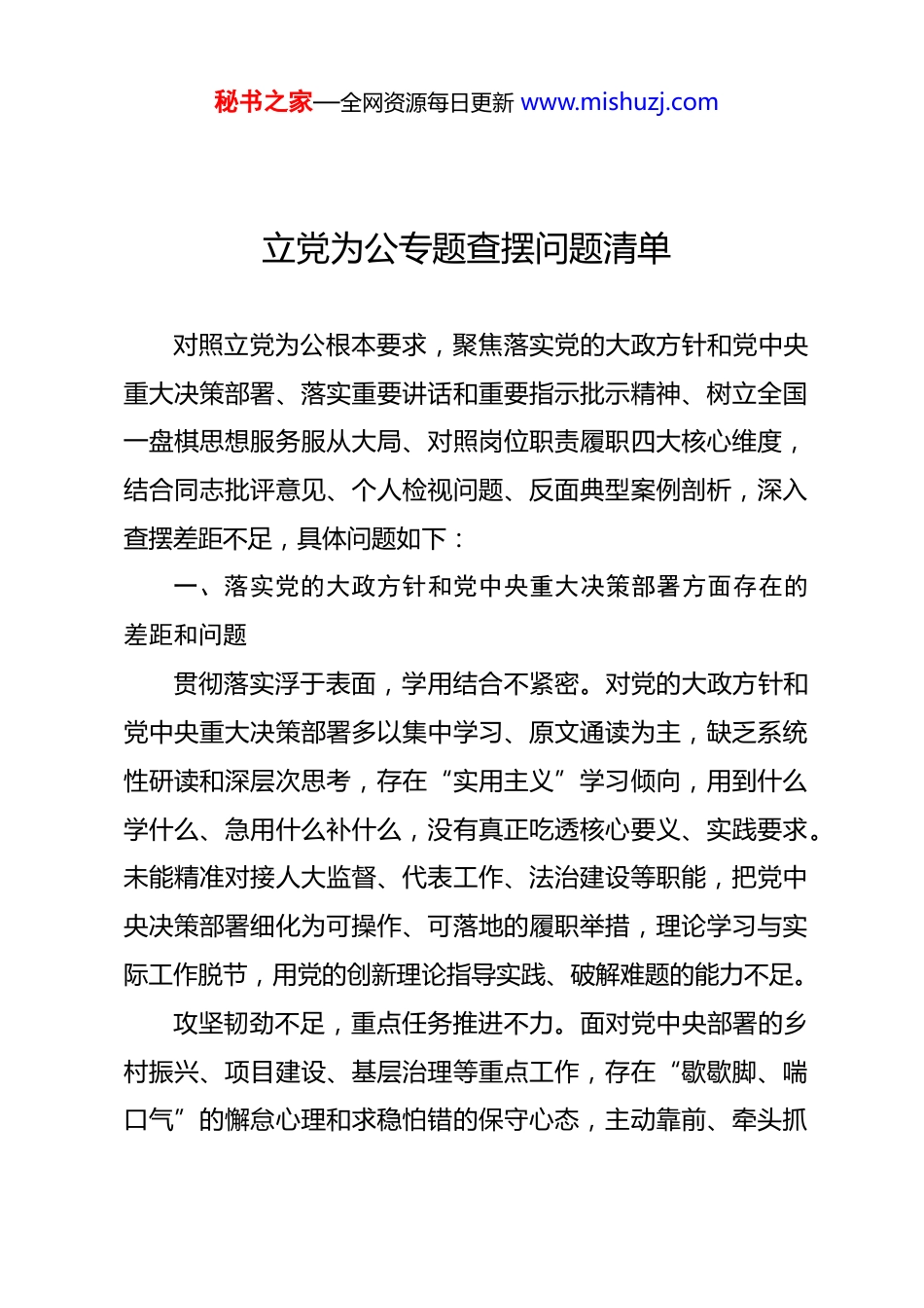 秘书之家—全网资源每日更新 www.mishuzj.com立党为公专题查摆问题清单对照立党为公根本要求,聚焦落实党的大政方针和党中央重大决策部署、落实重要讲话和重要指示批示精神、树立全国一盘棋思想服务服从大局、对照岗位职责履职四大核心维度,结合同志批评意见、个人检视问题、反面典型案例剖析,深入查摆差距不足,具体问题如下:一、落实党的大政方针和党中央重大决策部署方面存在的差距和问题贯彻落实浮于表面,学用结合不紧密。对党的大政方针和党中央重大决策部署多以集中学习、原文通读为主,缺乏系统性研读和深层次思考,存在“实用主义”学习倾向,用到什么学什么、急用什么补什么,没有真正吃透核心要义、实践要求。未能精准对接人大监督、代表工作、法治建设等职能,把党中央决策部署细化为可操作、可落地的履职举措,理论学习与实际工作脱节,用党的创新理论指导实践、破解难题的能力不足。攻坚韧劲不足,重点任务推进不力。面对党中央部署的乡村振兴、项目建设、基层治理等重点工作,存在“歇歇脚、喘口气”的懈怠心理和求稳怕错的保守心态,主动靠前、牵头抓秘书之家—全网资源每日更新 www.mishuzj.com总推动决策落地的力度不够。面对工作中的难点堵点问题,缺乏一抓到底的钉钉子精神,攻坚克难的锐气不足,导致部分决策部署在人大履职环节推进缓慢、成效打折扣。督导落实不严,闭环机制不健全。落实党中央决策部署存在“重部署、轻督导”问题,责任要求提得多、具体跟踪落得细,常态化督导问效机制不完善。对人大机关及党员干部贯彻执行情况的监督检查频次不高、力度不大,发现问题、整改纠偏不够及时,未能以刚性督导保障党中央大政方针不折不扣落地见效。二、落实重要讲话和重要指示批示精神方面存在的差距和问题领悟精髓不够深入,政治站位有偏差。学习重要讲话和重要指示批示精神,停留在“读过学过”的浅层层面,对其中蕴含的立场、观点、方法钻研不深,对关于人大工作、群众工作、干部队伍建设的重要要求把握不准。对标践行不够到位,履职契合度不高。对照“民有所呼、我有所应”的要求,联系群众、服务群众存在短板,开展代表联系群众活动多以定点接访、集中座谈为主,深入基层一线倾听群众呼声不够,对群众急难愁盼问题的跟踪督办、精准解决韧劲不足,未能完全践行以人民为中心的发展思想。对照关于秘书之家—全网资源每日更新 www.mishuzj.com干部担当作为、从严管理干部的要求,激励干部干事创业力度不够,干部管理宽松软,对干部思想动态、生活状况掌握不细致,提醒批评不到位。贯彻转化不够有力,创新举措不足。落实关于创新工作方法、提升履职效能的指示精神,存在按部就班、因循守旧的惯性思维,人大监督方式单一、载体不丰富,借助信息化手段提升监督和代表履职效率思考不多、实践不够。对关于党风廉政建设、作风建设的重要批示,反思不够深刻、执行不够严格,存在大节不逾矩、小节不较真的思想,作风建设抓细抓常的韧劲不足。三、树立全国一盘棋思想、服务服从大局方面存在的差距和问题大局观念淡薄,站位格局不够高。存在“重业务、轻全局”的倾向,日常工作聚焦人大本职业务多,对全局性、综合性工作以及与自身职责关联度不高的重点任务,关注较少、过问不多,没有把人大工作置于全国、全域发展大局中谋划推进。缺乏全国一盘棋的系统思维,谋划工作、推动落实局限于局部履职,忽视整体大局利益,统筹兼顾、协同发力不够。服务大局主动性不足,履职融入度不深。围绕中心、服务大局的意识不强,主动对接上级决策部署、地方发展重点、群秘书之家—全网资源每日更新 www.mishuzj.com众核心诉求不够,人大监督、代表履职、法治保障等工作与大局需求精准对接不够。参与人大各专工委专项监督调研、执法检查活动不够,未能充分发挥人大职能优势,助力破解大局工作中的难点问题,服务大局的作用发挥不充分。凝聚合力不够,协同推进有欠缺。对班子成员履职中的思想动态、大局意识关注不足,未能通过有效政治引领,团结带领班子成员心往一处想、劲往一处使,形成服务服从大局的强大合力。统筹协调人大与各部门、各层级的联动不够,人大履职与中心工作融合...