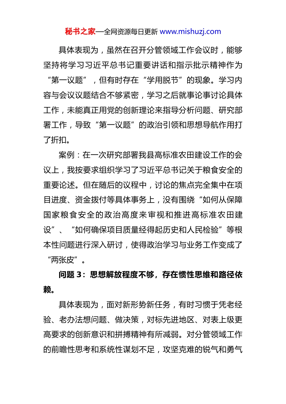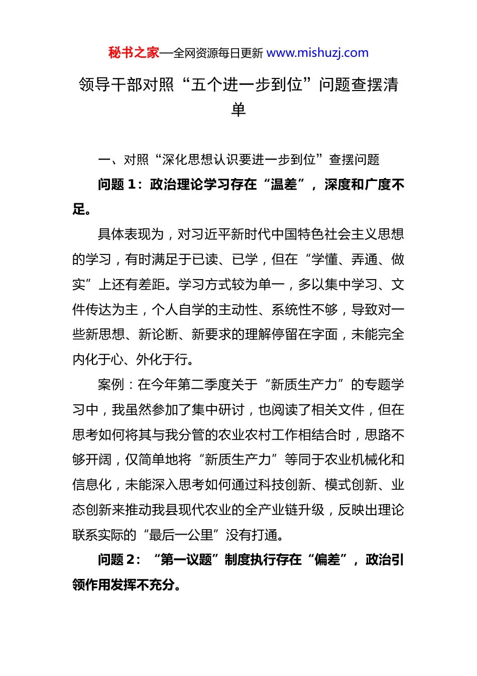 秘书之家—全网资源每日更新 www.mishuzj.com领导干部对照“五个进一步到位”问题查摆清单 一、对照“深化思想认识要进一步到位”查摆问题问题 1:政治理论学习存在“温差”,深度和广度不足。具体表现为,对习近平新时代中国特色社会主义思想的学习,有时满足于已读、已学,但在“学懂、弄通、做实”上还有差距。学习方式较为单一,多以集中学习、文件传达为主,个人自学的主动性、系统性不够,导致对一些新思想、新论断、新要求的理解停留在字面,未能完全内化于心、外化于行。案例:在今年第二季度关于“新质生产力”的专题学习中,我虽然参加了集中研讨,也阅读了相关文件,但在思考如何将其与我分管的农业农村工作相结合时,思路不够开阔,仅简单地将“新质生产力”等同于农业机械化和信息化,未能深入思考如何通过科技创新、模式创新、业态创新来推动我县现代农业的全产业链升级,反映出理论联系实际的“最后一公里”没有打通。问题 2:“第一议题”制度执行存在“偏差”,政治引领作用发挥不充分。秘书之家—全网资源每日更新 www.mishuzj.com具体表现为,虽然在召开分管领域工作会议时,能够坚持将学习习近平总书记重要讲话和指示批示精神作为“第一议题”,但有时存在“学用脱节”的现象。学习内容与会议议题结合不够紧密,学习之后就事论事讨论具体工作,未能真正用党的创新理论来指导分析问题、研究部署工作,导致“第一议题”的政治引领和思想导航作用打了折扣。案例:在一次研究部署我县高标准农田建设工作的会议上,我按要求组织学习了习近平总书记关于粮食安全的重要论述。但在随后的议程中,讨论的焦点完全集中在项目进度、资金拨付等具体事务上,没有围绕“如何从保障国家粮食安全的政治高度来审视和推进高标准农田建设”、“如何确保项目质量经得起历史和人民检验”等根本性问题进行深入研讨,使得政治学习与业务工作变成了“两张皮”。问题 3:思想解放程度不够,存在惯性思维和路径依赖。具体表现为,面对新形势新任务,有时习惯于凭老经验、老办法想问题、做决策,对标先进地区、对表上级更高要求的创新意识和拼搏精神有所减弱。对分管领域工作的前瞻性思考和系统性谋划不足,攻坚克难的锐气和勇气秘书之家—全网资源每日更新 www.mishuzj.com有待加强,未能完全跳出传统思维定势,大胆探索解决问题的新路径、新方法。案例:在我县推进农村人居环境整治提升工作中,对于农村生活垃圾分类处理这一难题,我主要沿用了过去“加大宣传、增配垃圾桶、增加清运次数”的传统模式。对于一些先进地区正在探索的“积分兑换”、“市场化运作”、“智能化监管”等新模式,虽然有所耳闻,但总觉得在我县基础薄弱、条件不成熟,没有下大力气去考察研究和试点推广,反映出思想上存在求稳怕乱、不敢闯不敢试的心态。二、对照“加强党性修养要进一步到位”查摆问题问题 1:宗旨意识有所淡化,服务群众不够主动靠前。具体表现为,随着工作头绪增多,坐办公室听汇报、看材料的时间多了,深入基层一线、田间地头直面群众的时间少了。对群众的所思所想所盼,有时通过间接渠道了解多,直接倾听少,对一些群众反映强烈的“急难愁盼”问题,虽然也进行了安排部署,但亲自跟踪督办、一抓到底的韧劲不足,导致一些问题解决不够及时、不够彻底。案例:去年,*乡部分村民多次反映,村里的灌溉主渠道因年久失修,淤积严重,影响春耕生产。我当时批示分管的业务部门牵头处理,也听取了口头汇报。但由于没有秘书之家—全网资源每日更新 www.mishuzj.com亲自到现场查看,没有直接听取村民的意见,对问题的严重性和紧迫性认识不足,导致修复工作进度缓慢,错过了最佳施工期,最终影响了部分农田的灌溉,引起了群众的不满。这深刻反映出我深入一线、现场办公的自觉性不够。问题 2:斗争精神有所弱化,面对矛盾不敢较真碰硬。具体表现为,在工作中存在一定的“老好人”思想,对于一些不属于自己直接责任范围但又与分管工作相关的矛盾和问题,有时抱着“多一事不如少一事”的心态,协调推动力度不够。在批评和自我批评中,对同志只讲团结不讲原则,对自己只谈现象不谈根源,缺乏“红脸出...
