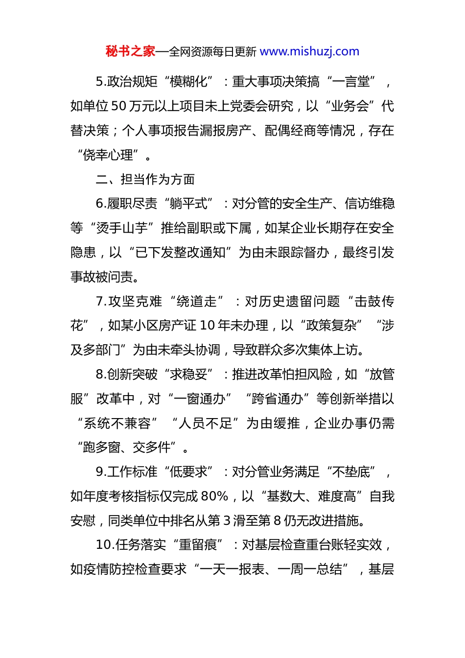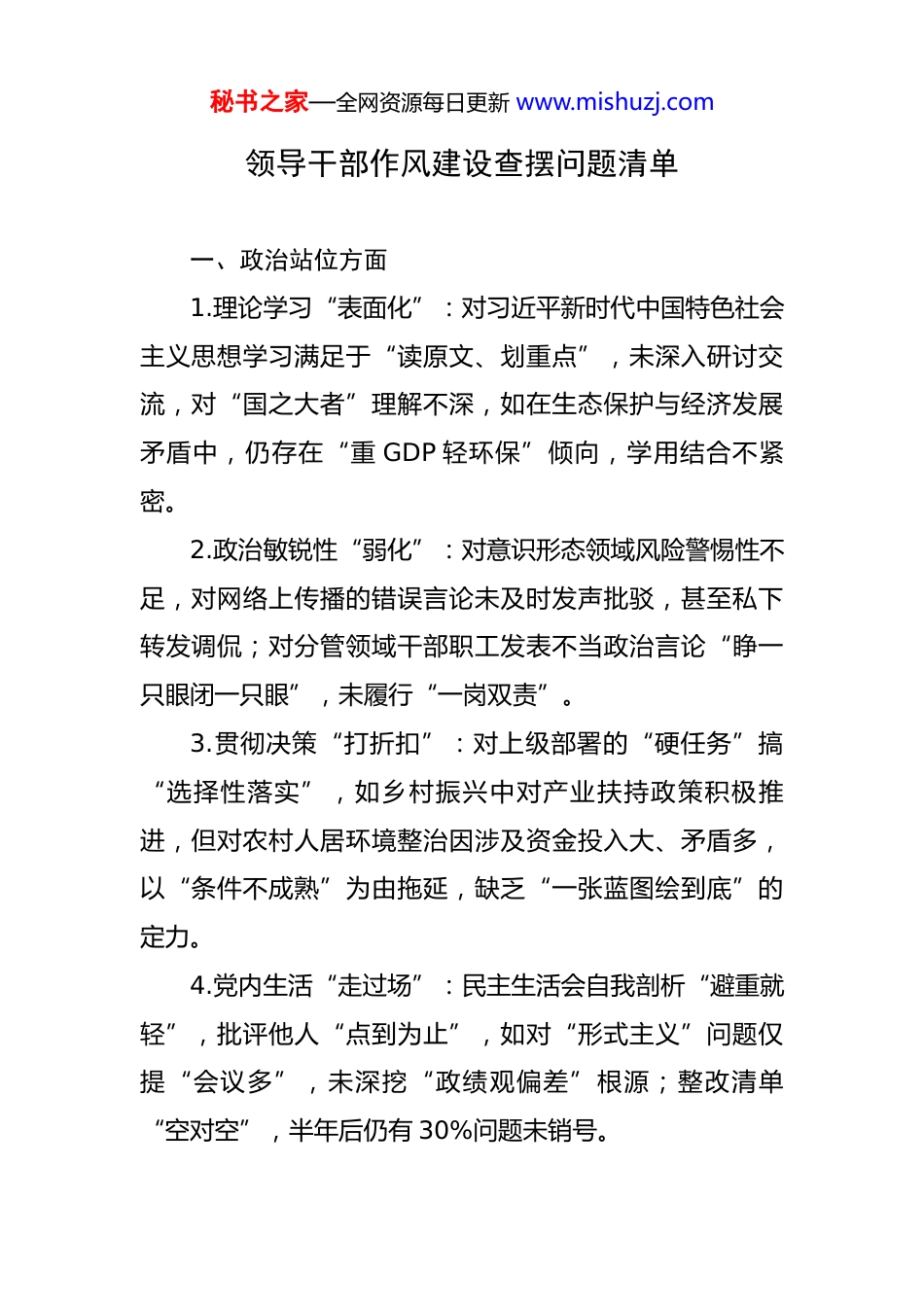 秘书之家—全网资源每日更新 www.mishuzj.com领导干部作风建设查摆问题清单 一、政治站位方面1.理论学习“表面化”:对习近平新时代中国特色社会主义思想学习满足于“读原文、划重点”,未深入研讨交流,对“国之大者”理解不深,如在生态保护与经济发展矛盾中,仍存在“重 GDP 轻环保”倾向,学用结合不紧密。2.政治敏锐性“弱化”:对意识形态领域风险警惕性不足,对网络上传播的错误言论未及时发声批驳,甚至私下转发调侃;对分管领域干部职工发表不当政治言论“睁一只眼闭一只眼”,未履行“一岗双责”。3.贯彻决策“打折扣”:对上级部署的“硬任务”搞“选择性落实”,如乡村振兴中对产业扶持政策积极推进,但对农村人居环境整治因涉及资金投入大、矛盾多,以“条件不成熟”为由拖延,缺乏“一张蓝图绘到底”的定力。4.党内生活“走过场”:民主生活会自我剖析“避重就轻”,批评他人“点到为止”,如对“形式主义”问题仅提“会议多”,未深挖“政绩观偏差”根源;整改清单“空对空”,半年后仍有 30%问题未销号。秘书之家—全网资源每日更新 www.mishuzj.com5.政治规矩“模糊化”:重大事项决策搞“一言堂”,如单位 50 万元以上项目未上党委会研究,以“业务会”代替决策;个人事项报告漏报房产、配偶经商等情况,存在“侥幸心理”。二、担当作为方面6.履职尽责“躺平式”:对分管的安全生产、信访维稳等“烫手山芋”推给副职或下属,如某企业长期存在安全隐患,以“已下发整改通知”为由未跟踪督办,最终引发事故被问责。7.攻坚克难“绕道走”:对历史遗留问题“击鼓传花”,如某小区房产证 10 年未办理,以“政策复杂”“涉及多部门”为由未牵头协调,导致群众多次集体上访。8.创新突破“求稳妥”:推进改革怕担风险,如“放管服”改革中,对“一窗通办”“跨省通办”等创新举措以“系统不兼容”“人员不足”为由缓推,企业办事仍需“跑多窗、交多件”。9.工作标准“低要求”:对分管业务满足“不垫底”,如年度考核指标仅完成 80%,以“基数大、难度高”自我安慰,同类单位中排名从第 3 滑至第 8 仍无改进措施。10.任务落实“重留痕”:对基层检查重台账轻实效,如疫情防控检查要求“一天一报表、一周一总结”,基层秘书之家—全网资源每日更新 www.mishuzj.com干部 80%时间填表格,实际防控措施落实不到位。三、服务群众方面11.调研走访“作秀式”:下基层“前呼后拥”,到村仅看“示范户”“亮点点”,如调研乡村振兴时,在 A 村停留 2 小时参观产业基地,对相邻 B 村群众反映的灌溉渠堵塞问题未实地查看,导致问题拖延半年未解决。12.群众诉求“推脱式”:对群众来电来访“打太极”,如某村民反映耕地被占,答复“已转交自然资源局”,未跟踪进展;群众二次询问时,以“正在办理”敷衍,实际未督促落实。13.民生项目“官本位”:推进“民心工程”不接地气,如为“打造示范街”强制商户统一招牌,未征求商户意见,导致部分商户因招牌费用高停业,引发舆论负面评价。14.政策落实“中梗阻”:惠民资金“跑冒滴漏”,如农村危房改造补贴存在优亲厚友现象,某干部亲属不符合条件却领取 2 万元补贴,群众举报后仍未及时核查。15.服务效率“慢半拍”:对群众“急难愁盼”响应迟缓,如某社区老人反映电梯故障,物业上报后,分管领导以“需走招标程序”为由拖延 1 个月维修,期间老人爬楼梯摔倒住院。秘书之家—全网资源每日更新 www.mishuzj.com四、廉洁自律方面16.交往边界“不清晰”:与管理服务对象“亲清不分”,如接受企业主安排的“私人宴请”“旅游度假”,虽未直接谋利,但在项目审批中“开口子”,导致公平竞争受损。17.家风建设“宽松软”:对配偶子女管教不严,如妻子通过“打招呼”为亲属承揽工程,本人知情未制止;子女升学、婚丧事宜大操大办,收受管理服务对象礼金 10 万元。18.公务消费“超标准”:以“工作需要”为由违规报销,如出差住五星级酒店、乘坐头等舱,虚列“接待费”“调研费”掩盖高消费,年度“三公经费”超预算 30%。19.资产监管“失严谨”:对单位国有资产“重购置轻管理”,如采购的办公设备未登记入账,部...