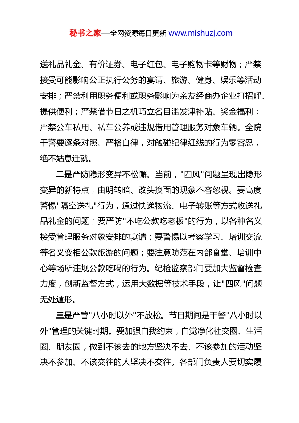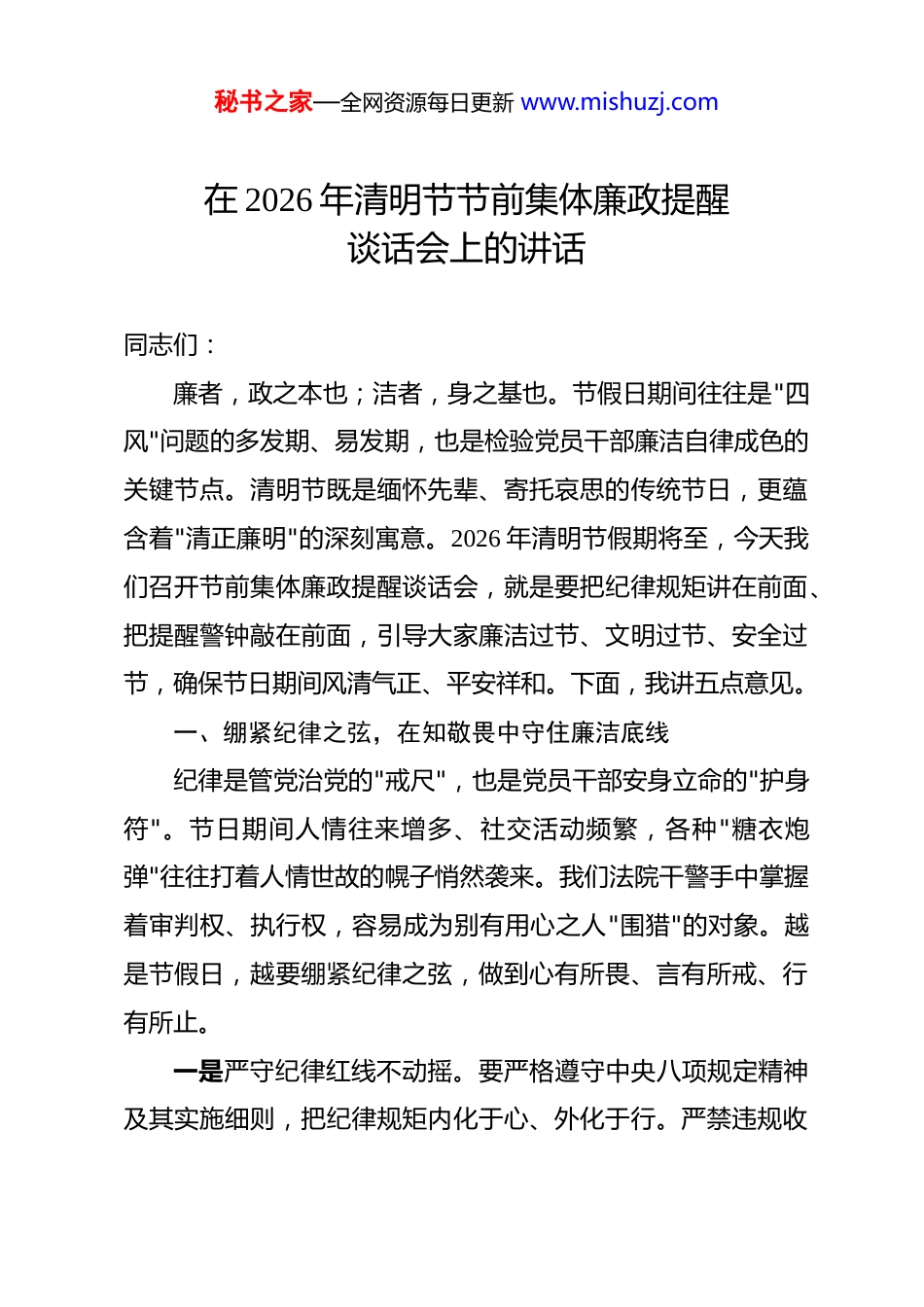 秘书之家—全网资源每日更新 www.mishuzj.com在 2026 年清明节节前集体廉政提醒谈话会上的讲话 同志们:廉者,政之本也;洁者,身之基也。节假日期间往往是"四风"问题的多发期、易发期,也是检验党员干部廉洁自律成色的关键节点。清明节既是缅怀先辈、寄托哀思的传统节日,更蕴含着"清正廉明"的深刻寓意。2026 年清明节假期将至,今天我们召开节前集体廉政提醒谈话会,就是要把纪律规矩讲在前面、把提醒警钟敲在前面,引导大家廉洁过节、文明过节、安全过节,确保节日期间风清气正、平安祥和。下面,我讲五点意见。一、绷紧纪律之弦,在知敬畏中守住廉洁底线纪律是管党治党的"戒尺",也是党员干部安身立命的"护身符"。节日期间人情往来增多、社交活动频繁,各种"糖衣炮弹"往往打着人情世故的幌子悄然袭来。我们法院干警手中掌握着审判权、执行权,容易成为别有用心之人"围猎"的对象。越是节假日,越要绷紧纪律之弦,做到心有所畏、言有所戒、行有所止。一是严守纪律红线不动摇。要严格遵守中央八项规定精神及其实施细则,把纪律规矩内化于心、外化于行。严禁违规收秘书之家—全网资源每日更新 www.mishuzj.com送礼品礼金、有价证券、电子红包、电子购物卡等财物;严禁接受可能影响公正执行公务的宴请、旅游、健身、娱乐等活动安排;严禁利用职务便利或职务影响为亲友经商办企业打招呼、提供便利;严禁借节日之机巧立名目滥发津补贴、奖金福利;严禁公车私用、私车公养或违规借用管理服务对象车辆。全院干警要逐条对照、严格自律,对触碰纪律红线的行为零容忍,绝不姑息迁就。二是严防隐形变异不松懈。当前,"四风"问题呈现出隐形变异的新特点,由明转暗、改头换面的现象不容忽视。要高度警惕"隔空送礼"行为,通过快递物流、电子转账等方式收送礼品礼金的问题;要严防"不吃公款吃老板"的行为,以各种名义接受管理服务对象安排的宴请;要警惕以考察学习、培训交流等名义变相公款旅游的问题;要注意防范在内部食堂、培训中心等场所违规公款吃喝的行为。纪检监察部门要加大监督检查力度,创新监督方式,运用大数据等技术手段,让"四风"问题无处遁形。三是严管"八小时以外"不放松。节日期间是干警"八小时以外"管理的关键时期。要加强自我约束,自觉净化社交圈、生活圈、朋友圈,做到不该去的地方坚决不去、不该参加的活动坚决不参加、不该交往的人坚决不交往。各部门负责人要切实履秘书之家—全网资源每日更新 www.mishuzj.com行"一岗双责",加强对本部门干警节日期间行为的提醒和监督,发现苗头性、倾向性问题及时提醒纠正。要教育引导干警算好政治账、经济账、名誉账、家庭账、亲情账、自由账、健康账"七笔账",始终保持清醒头脑,不为蝇头小利所惑、不为灯红酒绿所迷。二、筑牢安全之堤,在防患未然中确保平安过节安全无小事,责任重于山。节日期间安全风险点增多,各类事故隐患不容忽视。全院上下要牢固树立安全发展理念,以"时时放心不下"的责任感抓好各项安全工作,坚决防范和遏制各类安全事故发生,确保全院干警及家属平安祥和度过节日。一是抓好机关安全保障不遗漏。节前要组织开展一次全面的安全大检查,对办公楼、审判庭、档案室、机房、食堂、车库等重点区域进行拉网式排查,重点检查消防设施是否完好有效、电气线路是否老化、安全通道是否畅通、监控设备是否正常运行、涉密文件和档案是否妥善保管。对检查发现的安全隐患,能立即整改的要立即整改,不能立即整改的要明确责任人、整改期限和防范措施,确保隐患"清零"。要严格落实节假日值班制度,安排专人 24 小时值班,确保值班人员在岗在位、通信畅通,遇到突发情况能够第一时间响应、第一时间处置。要加强对办公楼的出入管理,严格落实来访登记制度,防止无关人秘书之家—全网资源每日更新 www.mishuzj.com员进入办公区域。二是抓好出行安全防范不懈怠。节日期间出行人数增多,交通安全风险增大。全院干警要自觉遵守交通法规,坚决杜绝酒驾醉驾、疲劳驾驶、超速超载等违法行为。要增强文明驾驶意识,礼让行人、文明出行,展现法院干警良好形象。要合理规划出行路线和时间,尽量避开高峰时段和拥堵路段,注意关注...