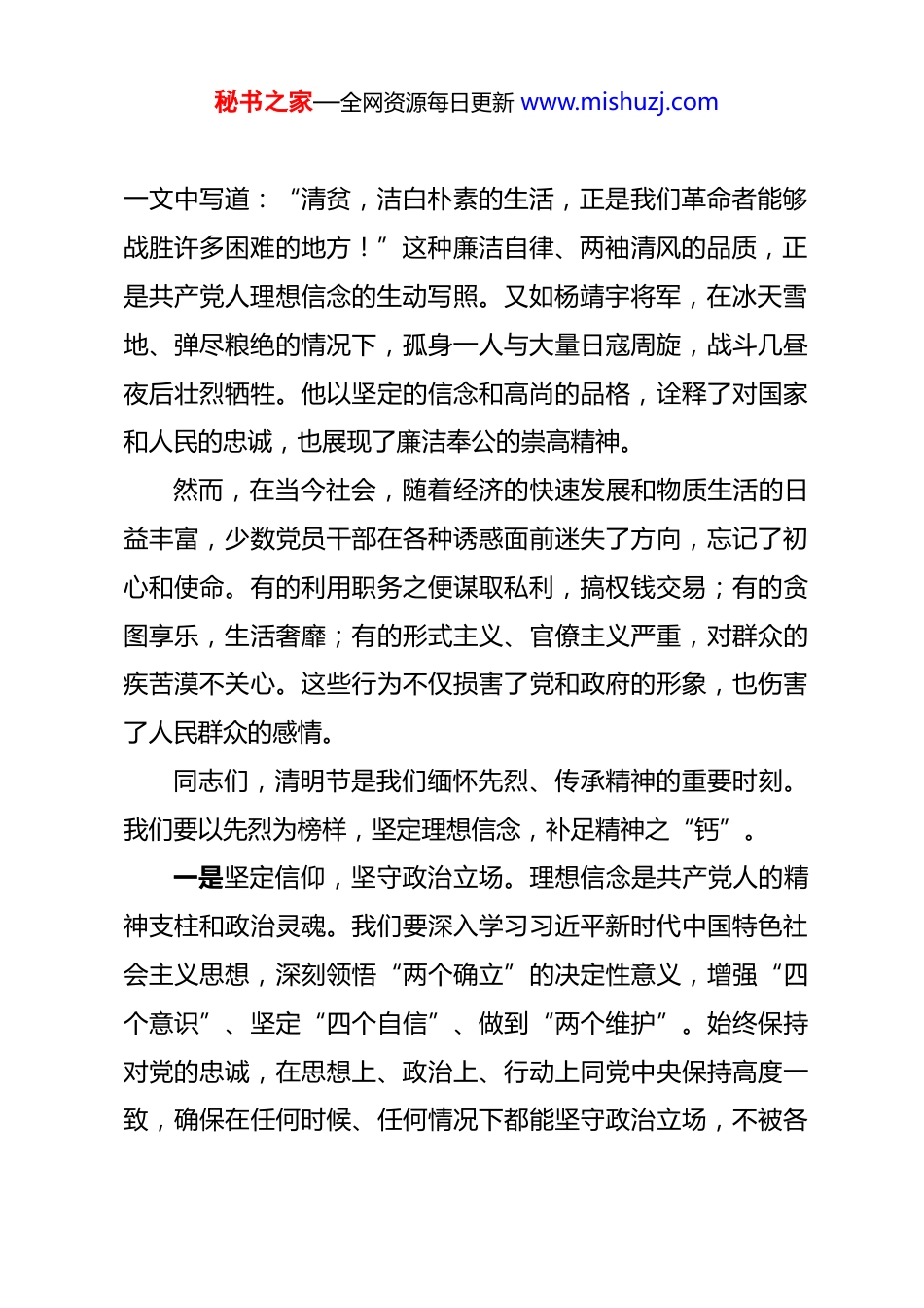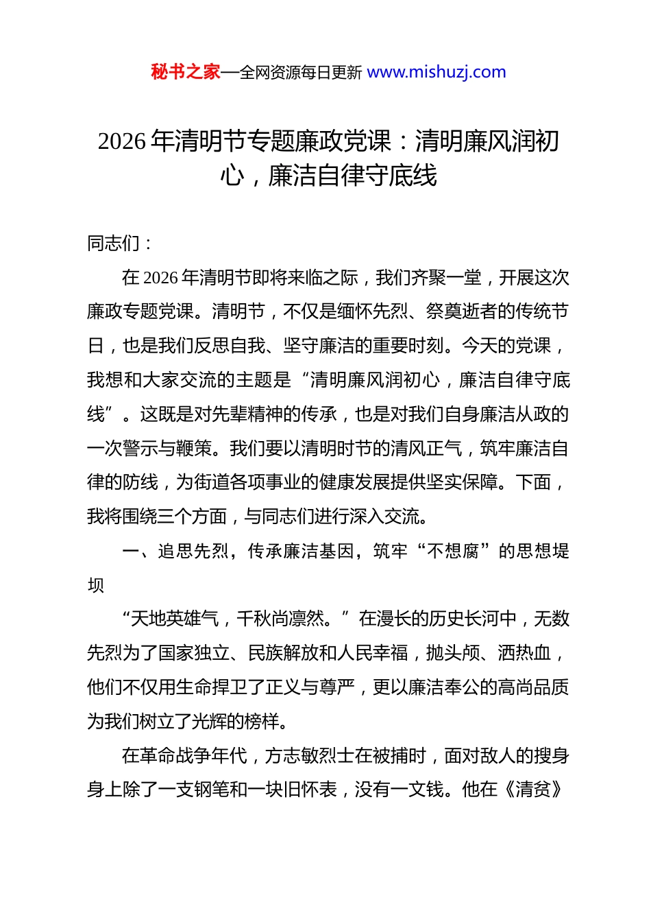 秘书之家—全网资源每日更新 www.mishuzj.com2026 年清明节专题廉政党课:清明廉风润初心,廉洁自律守底线 同志们:在 2026 年清明节即将来临之际,我们齐聚一堂,开展这次廉政专题党课。清明节,不仅是缅怀先烈、祭奠逝者的传统节日,也是我们反思自我、坚守廉洁的重要时刻。今天的党课,我想和大家交流的主题是“清明廉风润初心,廉洁自律守底线”。这既是对先辈精神的传承,也是对我们自身廉洁从政的一次警示与鞭策。我们要以清明时节的清风正气,筑牢廉洁自律的防线,为街道各项事业的健康发展提供坚实保障。下面,我将围绕三个方面,与同志们进行深入交流。一、追思先烈,传承廉洁基因,筑牢“不想腐”的思想堤坝“天地英雄气,千秋尚凛然。”在漫长的历史长河中,无数先烈为了国家独立、民族解放和人民幸福,抛头颅、洒热血,他们不仅用生命捍卫了正义与尊严,更以廉洁奉公的高尚品质为我们树立了光辉的榜样。在革命战争年代,方志敏烈士在被捕时,面对敌人的搜身身上除了一支钢笔和一块旧怀表,没有一文钱。他在《清贫》秘书之家—全网资源每日更新 www.mishuzj.com一文中写道:“清贫,洁白朴素的生活,正是我们革命者能够战胜许多困难的地方!”这种廉洁自律、两袖清风的品质,正是共产党人理想信念的生动写照。又如杨靖宇将军,在冰天雪地、弹尽粮绝的情况下,孤身一人与大量日寇周旋,战斗几昼夜后壮烈牺牲。他以坚定的信念和高尚的品格,诠释了对国家和人民的忠诚,也展现了廉洁奉公的崇高精神。然而,在当今社会,随着经济的快速发展和物质生活的日益丰富,少数党员干部在各种诱惑面前迷失了方向,忘记了初心和使命。有的利用职务之便谋取私利,搞权钱交易;有的贪图享乐,生活奢靡;有的形式主义、官僚主义严重,对群众的疾苦漠不关心。这些行为不仅损害了党和政府的形象,也伤害了人民群众的感情。同志们,清明节是我们缅怀先烈、传承精神的重要时刻。我们要以先烈为榜样,坚定理想信念,补足精神之“钙”。一是坚定信仰,坚守政治立场。理想信念是共产党人的精神支柱和政治灵魂。我们要深入学习习近平新时代中国特色社会主义思想,深刻领悟“两个确立”的决定性意义,增强“四个意识”、坚定“四个自信”、做到“两个维护”。始终保持对党的忠诚,在思想上、政治上、行动上同党中央保持高度一致,确保在任何时候、任何情况下都能坚守政治立场,不被各秘书之家—全网资源每日更新 www.mishuzj.com种错误思潮所左右。二是牢记初心,践行宗旨意识。我们党的初心和使命是为中国人民谋幸福,为中华民族谋复兴。作为基层干部,我们要时刻牢记自己的身份和职责,把人民群众的利益放在首位,全心全意为人民服务。要深入基层、深入群众,了解群众的需求和疾苦,切实解决群众的实际问题,让人民群众感受到党和政府的关怀与温暖。三是弘扬正气,保持廉洁本色。廉洁自律是党员干部的基本准则。我们要自觉遵守党纪国法,严格要求自己,做到廉洁从政、廉洁用权、廉洁修身、廉洁齐家。要坚决抵制各种腐朽思想的侵蚀,保持清醒的头脑,做到不为名利所动,不为金钱所惑,始终保持共产党人的浩然正气。二、正风肃纪,严守纪律规矩,扎紧“不能腐”的制度笼子“欲知平直,则必准绳;欲知方圆,则必规矩。”纪律规矩是我们党的生命线,是党员干部必须遵守的行为准则。在清明节这个特殊的节点,我们更要严格遵守纪律规矩,确保各项工作风清气正。近年来,我们街道在党风廉政建设方面取得了一定的成绩但也存在一些不容忽视的问题。个别干部纪律意识淡薄,对规秘书之家—全网资源每日更新 www.mishuzj.com章制度置若罔闻;有的在工作中敷衍塞责,不作为、慢作为;还有的在清明祭祀等活动中,存在铺张浪费、违规违纪等现象。这些问题不仅影响了街道的形象和工作效率,也损害了党和政府的公信力。为了进一步加强纪律建设,扎紧“不能腐”的制度笼子,我们要做好以下几点:一是加强纪律教育,增强规矩意识。要通过开展廉政教育活动、专题培训等方式,组织党员干部深入学习党纪国法和各项规章制度,让大家明白哪些事能做、哪些事不能做,自觉遵守纪律规矩。要结合清明节的特点,开展廉...
