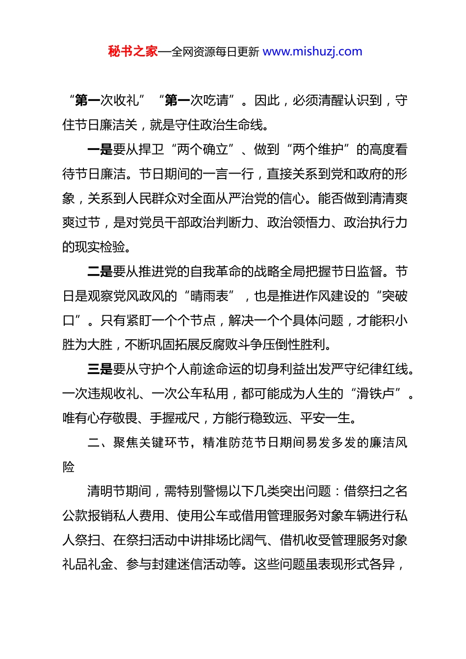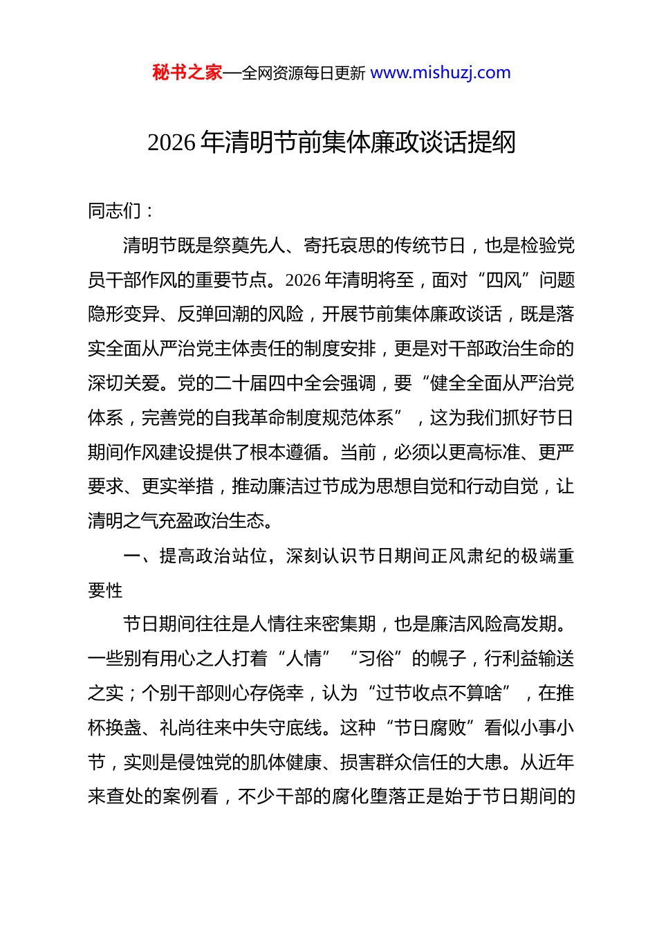 秘书之家—全网资源每日更新 www.mishuzj.com2026 年清明节前集体廉政谈话提纲 同志们:清明节既是祭奠先人、寄托哀思的传统节日,也是检验党员干部作风的重要节点。2026 年清明将至,面对“四风”问题隐形变异、反弹回潮的风险,开展节前集体廉政谈话,既是落实全面从严治党主体责任的制度安排,更是对干部政治生命的深切关爱。党的二十届四中全会强调,要“健全全面从严治党体系,完善党的自我革命制度规范体系”,这为我们抓好节日期间作风建设提供了根本遵循。当前,必须以更高标准、更严要求、更实举措,推动廉洁过节成为思想自觉和行动自觉,让清明之气充盈政治生态。一、提高政治站位,深刻认识节日期间正风肃纪的极端重要性节日期间往往是人情往来密集期,也是廉洁风险高发期。一些别有用心之人打着“人情”“习俗”的幌子,行利益输送之实;个别干部则心存侥幸,认为“过节收点不算啥”,在推杯换盏、礼尚往来中失守底线。这种“节日腐败”看似小事小节,实则是侵蚀党的肌体健康、损害群众信任的大患。从近年来查处的案例看,不少干部的腐化堕落正是始于节日期间的秘书之家—全网资源每日更新 www.mishuzj.com“第一次收礼”“第一次吃请”。因此,必须清醒认识到,守住节日廉洁关,就是守住政治生命线。一是要从捍卫“两个确立”、做到“两个维护”的高度看待节日廉洁。节日期间的一言一行,直接关系到党和政府的形象,关系到人民群众对全面从严治党的信心。能否做到清清爽爽过节,是对党员干部政治判断力、政治领悟力、政治执行力的现实检验。二是要从推进党的自我革命的战略全局把握节日监督。节日是观察党风政风的“晴雨表”,也是推进作风建设的“突破口”。只有紧盯一个个节点,解决一个个具体问题,才能积小胜为大胜,不断巩固拓展反腐败斗争压倒性胜利。三是要从守护个人前途命运的切身利益出发严守纪律红线。一次违规收礼、一次公车私用,都可能成为人生的“滑铁卢”。唯有心存敬畏、手握戒尺,方能行稳致远、平安一生。二、聚焦关键环节,精准防范节日期间易发多发的廉洁风险清明节期间,需特别警惕以下几类突出问题:借祭扫之名公款报销私人费用、使用公车或借用管理服务对象车辆进行私人祭扫、在祭扫活动中讲排场比阔气、借机收受管理服务对象礼品礼金、参与封建迷信活动等。这些问题虽表现形式各异,秘书之家—全网资源每日更新 www.mishuzj.com但本质都是特权思想作祟、纪律意识淡薄。一是严管“车轮上的腐败”。公车姓“公”不姓“私”,节日期间必须严格执行公务用车封存停驶制度,确因工作需要使用的,必须严格履行审批程序,并全程留痕可查。严禁任何形式的公车私用、私车公养。二是严防“舌尖上的歪风”。祭扫期间的聚餐活动,必须坚持勤俭节约原则,严禁用公款大吃大喝,严禁出入私人会所或高档消费场所,严禁接受可能影响公正执行公务的宴请。三是严控“人情往来的陷阱”。要分清正常人情往来与违规收送礼品礼金的界限,对管理服务对象、私营企业主等赠送的礼品、礼金、消费卡等,必须坚决拒收。一时无法拒收的,应按规定及时上交组织。四是严守“生活作风的底线”。党员干部要带头移风易俗,文明祭扫,自觉抵制焚烧纸钱、燃放鞭炮等陈规陋习,更不得参与任何形式的封建迷信活动,始终保持共产党人的先进性和纯洁性。三、压实主体责任,构建齐抓共管的节日廉洁保障体系廉洁过节不是一句空话,需要各级党组织和全体党员干部同向发力、同题共答。各级“一把手”要切实履行好第一责任人职责,既要以身作则、率先垂范,又要敢抓敢管、严抓严管。秘书之家—全网资源每日更新 www.mishuzj.com对苗头性、倾向性问题要及时咬耳扯袖、红脸出汗,防止小错酿成大祸。一是强化教育引导,筑牢思想堤坝。要通过廉政谈话、警示教育、发送廉洁提醒短信等多种形式,早打招呼、早作提醒,把纪律和规矩挺在前面,让党员干部知敬畏、存戒惧、守底线。二是强化监督检查,形成有力震慑。纪检监察机关要加大节日期间的明察暗访力度,畅通群众监督渠道,对顶风违纪行为发现一起、查处一起、通报一起,持续释放越往后执纪越严的强烈信号。三是强化家风建设,共筑廉洁防...