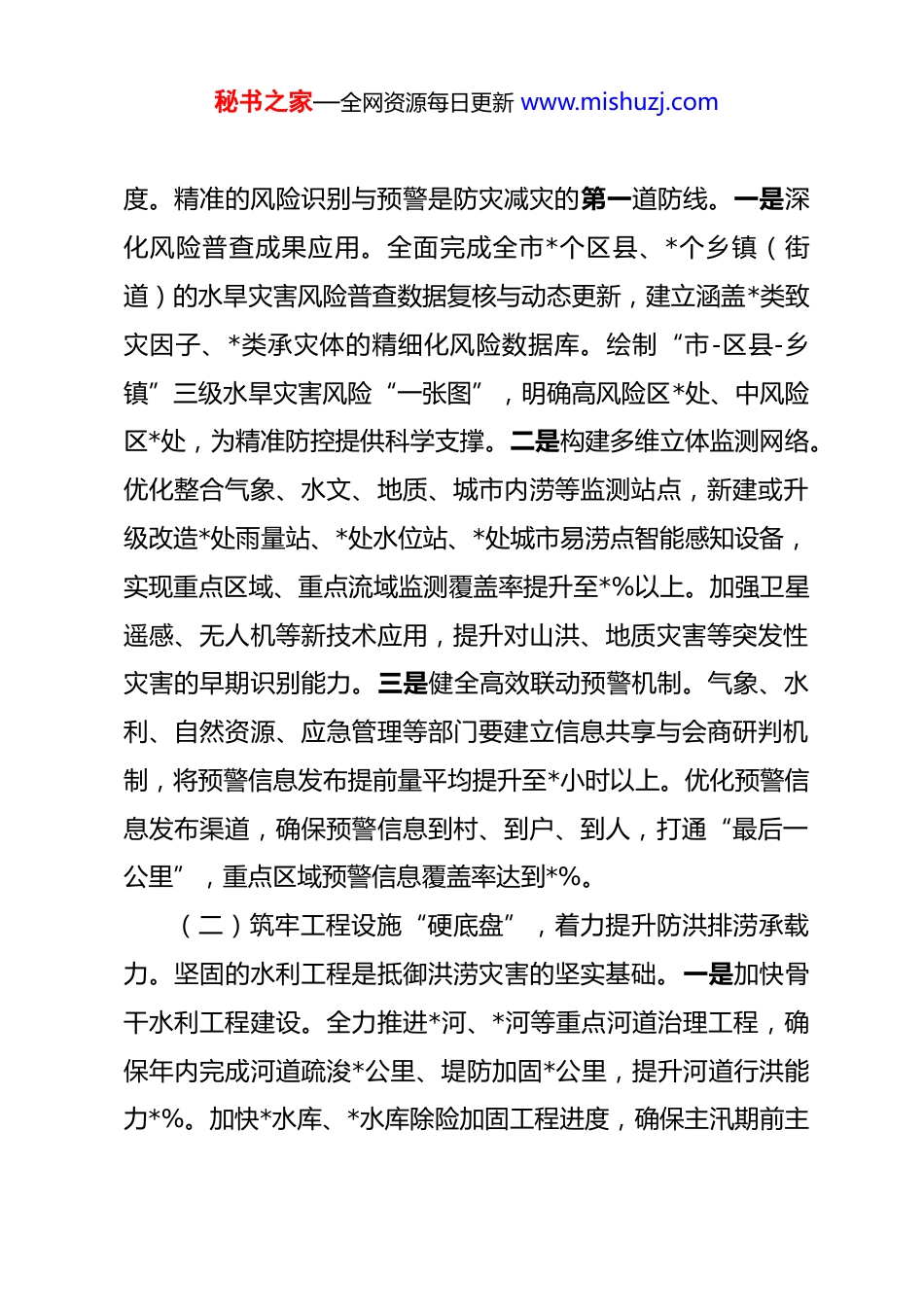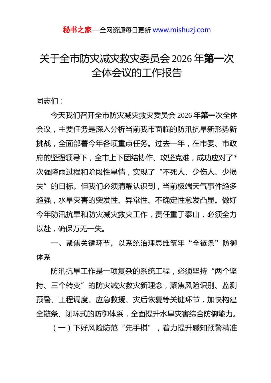 秘书之家—全网资源每日更新 www.mishuzj.com关于全市防灾减灾救灾委员会 2026 年第一次全体会议的工作报告 同志们:今天我们召开全市防灾减灾救灾委员会 2026 年第一次全体会议,主要任务是深入分析当前我市面临的防汛抗旱新形势新挑战,全面部署今年各项重点任务。过去一年,在市委、市政府的坚强领导下,全市上下团结协作、攻坚克难,成功应对了*次强降雨过程和阶段性旱情,实现了“不死人、少伤人、少损失”的目标。但我们必须清醒认识到,当前极端天气事件趋多趋强,水旱灾害的突发性、异常性、不确定性愈发凸显。做好今年防汛抗旱和防灾减灾救灾工作,责任重于泰山,必须全力以赴,确保万无一失。一、聚焦关键环节,以系统治理思维筑牢“全链条”防御体系防汛抗旱工作是一项复杂的系统工程,必须坚持“两个坚持、三个转变”的防灾减灾救灾新理念,聚焦风险识别、监测预警、工程调度、应急救援、灾后恢复等关键环节,加快构建全链条、闭环式的防御体系,全面提升水旱灾害综合防御能力。(一)下好风险防范“先手棋”,着力提升感知预警精准秘书之家—全网资源每日更新 www.mishuzj.com度。精准的风险识别与预警是防灾减灾的第一道防线。一是深化风险普查成果应用。全面完成全市*个区县、*个乡镇(街道)的水旱灾害风险普查数据复核与动态更新,建立涵盖*类致灾因子、*类承灾体的精细化风险数据库。绘制“市-区县-乡镇”三级水旱灾害风险“一张图”,明确高风险区*处、中风险区*处,为精准防控提供科学支撑。二是构建多维立体监测网络。优化整合气象、水文、地质、城市内涝等监测站点,新建或升级改造*处雨量站、*处水位站、*处城市易涝点智能感知设备,实现重点区域、重点流域监测覆盖率提升至*%以上。加强卫星遥感、无人机等新技术应用,提升对山洪、地质灾害等突发性灾害的早期识别能力。三是健全高效联动预警机制。气象、水利、自然资源、应急管理等部门要建立信息共享与会商研判机制,将预警信息发布提前量平均提升至*小时以上。优化预警信息发布渠道,确保预警信息到村、到户、到人,打通“最后一公里”,重点区域预警信息覆盖率达到*%。(二)筑牢工程设施“硬底盘”,着力提升防洪排涝承载力。坚固的水利工程是抵御洪涝灾害的坚实基础。一是加快骨干水利工程建设。全力推进*河、*河等重点河道治理工程,确保年内完成河道疏浚*公里、堤防加固*公里,提升河道行洪能力*%。加快*水库、*水库除险加固工程进度,确保主汛期前主秘书之家—全网资源每日更新 www.mishuzj.com体工程完工,恢复防洪库容*万立方米。二是提升城市排水防涝能力。结合城市更新行动,系统化推进海绵城市建设,完成*个易涝积水点整治。新建和改造排水管网*公里,新增雨水泵站提升能力*立方米/秒。加强地铁、下穿隧道、地下商场等地下空间防洪排涝设施建设与管理,落实挡水、排水、封堵等应急措施。三是强化农村水利设施管护。完成*座小型水库、*座水闸的安全鉴定与隐患整治。对*公里重要堤防、*处重点险工险段进行加固。建立健全农村饮水安全工程长效管护机制,确保*处农村供水工程汛期安全运行,保障*万农村人口饮水安全。(三)用好数字赋能“新引擎”,着力提升指挥调度智能化水平。数字化、智能化是提升防汛抗旱指挥调度效能的关键。一是建强“智慧防汛”指挥平台。整合汇聚全市水利、气象、自然资源、城市管理等部门数据,构建覆盖“空天地”一体化的防汛抗旱数据资源池。升级市防汛抗旱指挥系统,实现汛情、险情、灾情、资源调度等信息的“一屏统览、一键直达、一网统管”,指挥调度效率提升*%以上。二是推广数字孪生流域建设。选取*河、*湖等*个重点流域,开展数字孪生试点,构建与物理流域同步仿真、同步运行的数字映射平台。实现流域降雨-产流-汇流-演进过程的精准模拟,为水库联合调度、蓄滞洪区运用提供科学决策支持,力争洪水预报精度提升*%。三是开发秘书之家—全网资源每日更新 www.mishuzj.com智能化辅助决策工具。研发基于大数据的洪涝灾害风险分析模型、人员转移避险模拟模型和应急资源优化调度模型,自动生成*类灾害情景下的最优应对方案。利用 AI 视频识别技术,实现对...