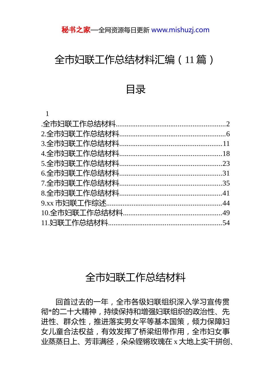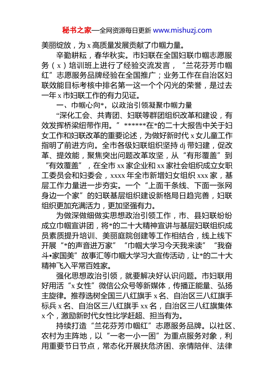 秘书之家—全网资源每日更新 www.mishuzj.com全市妇联工作总结材料汇编(11 篇)目录1.全市妇联工作总结材料............................................................22.全市妇联工作总结材料..........................................................63.全市妇联工作总结材料........................................................114.全市妇联工作总结材料........................................................185.全市妇联工作总结材料........................................................236.全市妇联工作总结材料........................................................317.全市妇联工作总结材料........................................................358.全市妇联工作总结材料........................................................419.xx 市妇联工作综述...............................................................4410.全市妇联工作总结材料......................................................4911.妇联工作总结材料..............................................................54全市妇联工作总结材料回首过去的一年,全市各级妇联组织深入学习宣传贯彻*的二十大精神,持续保持和增强妇联组织的政治性、先进性、群众性,推进落实男女平等基本国策,倾力保障妇女儿童合法权益,有效发挥了桥梁纽带作用,全市妇女事业蒸蒸日上、芳菲满径,朵朵铿锵玫瑰在 x 大地上实干拼创、秘书之家—全网资源每日更新 www.mishuzj.com美丽绽放,为 x 高质量发展贡献了巾帼力量。辛勤耕耘,春华秋实。市妇联在全国妇联巾帼志愿服务(x)培训班上进行了经验交流发言,“兰花芬芳巾帼红”志愿服务品牌经验在全国推广;业务工作在自治区妇联效能目标考核中排名第一这一个个闪光的荣誉,是过去一年 x 市妇联工作的有力见证。一、巾帼心向*,以政治引领凝聚巾帼力量“深化工会、共青团、妇联等群团组织改革和建设,有效发挥桥梁纽带作用。”******在*的二十大报告中关于妇女工作和妇联改革的重要论述,为做好新时代 x 女儿童工作指明了前进方向。全市各级妇联组织坚持 dj 带妇建,促改革、提效能,聚焦突出问题改革攻坚,从“有形覆盖”到“有效覆盖”,在全市 xx 家企业和 xx 家社会组织成立女职工委员会和妇委会,xxxx 年全市新增妇女组织 xxx 家,基层工作力量进一步夯实。一个“上面千条线、下面一张网身边一个家”的妇联基层组织建设新格局日趋完善,妇联组织更加充满活力,更加坚强有力。为做深做细做实思想政治引领工作,市、县妇联纷纷成立巾帼宣讲团,将*的二十大精神宣讲与基层妇联组织成员素质提升培训、美丽庭院创建等工作相结合,线上线下开展“*的声音进万家”“巾帼大学习今天我来读”“我奋斗•家国美”故事汇等巾帼大学习大宣传活动,让*的二十大精神飞入平常百姓家。强化思想政治引领,就要解决好认识问题。市妇联用好用活“x 女性”微信公众号等新媒体,传播正能量、弘扬主旋律。推荐选树全国三八红旗手 x 名、自治区三八红旗手标兵 x 名、自治区三八红旗手 xx 名,自治区三八红旗集体x 个,激励新时代女性比学赶超、担当有为。持续打造“兰花芬芳巾帼红”志愿服务品牌。以社区、农村为主阵地,以“一老一小一困”为重点服务对象,利用重要节日节点,常态化开展扶危济困、亲情陪伴、法律秘书之家—全网资源每日更新 www.mishuzj.com维权、创城等志愿服务,实现“兰花芬芳巾帼红”志愿品牌提质增效。为助力疫情防控,组织志愿者开展争当“爱心妈妈”和“巾帼红管家”活动,xxxx 名留守儿童、空巢老人得到暖心服务。二、巾帼建新功,发挥“她力量”助力乡村振兴心有多大,舞台就有多大,而妇联“娘家人”的帮助则为舞台筑起了基石。大众创业,万众创新。我市各级妇联为农村妇女提供精准“靶向”服务,发放农村妇女创业担保贷款 xxxxx.x 万元,支持 xxxx名妇女发展产业;成功创建“全国巾帼现代农业科技示范基地”;积极培树“好 x 嫂”家政服务品牌,实施巾帼家政志愿服务项目,为 xx...