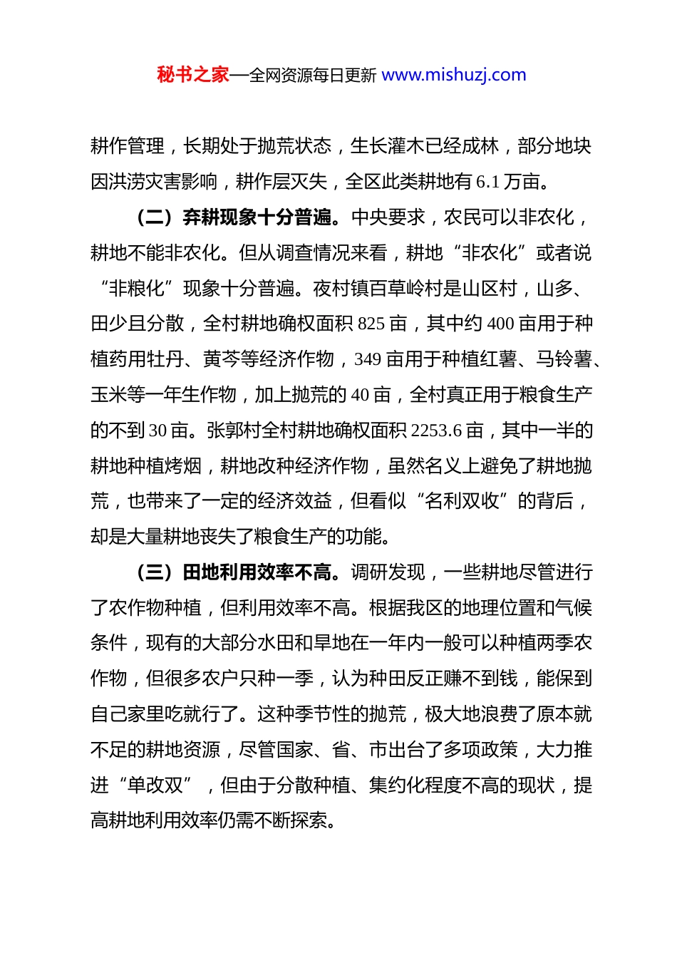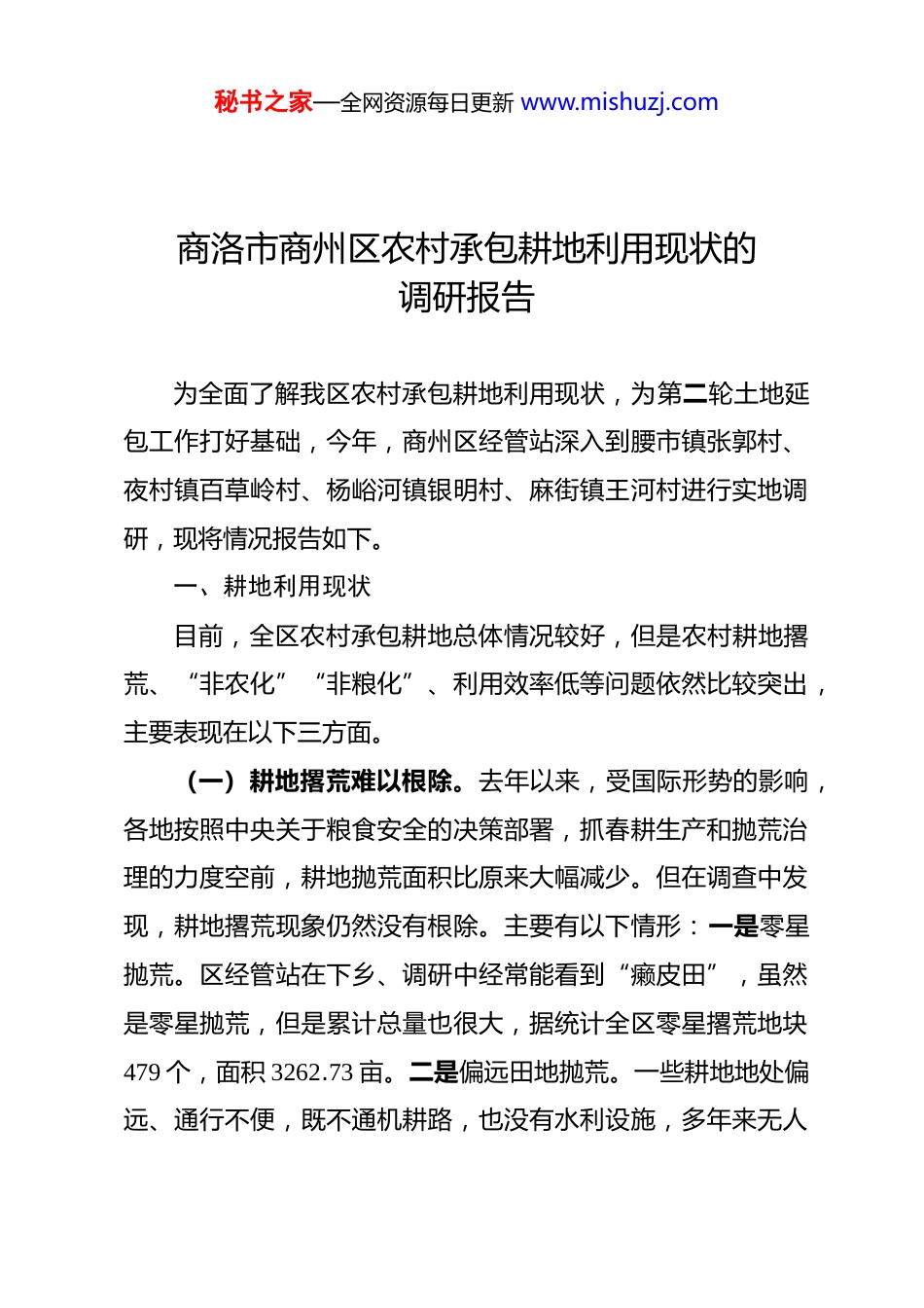 秘书之家—全网资源每日更新 www.mishuzj.com商洛市商州区农村承包耕地利用现状的调研报告为全面了解我区农村承包耕地利用现状,为第二轮土地延包工作打好基础,今年,商州区经管站深入到腰市镇张郭村、夜村镇百草岭村、杨峪河镇银明村、麻街镇王河村进行实地调研,现将情况报告如下。一、耕地利用现状目前,全区农村承包耕地总体情况较好,但是农村耕地撂荒、“非农化”“非粮化”、利用效率低等问题依然比较突出,主要表现在以下三方面。(一)耕地撂荒难以根除。去年以来,受国际形势的影响,各地按照中央关于粮食安全的决策部署,抓春耕生产和抛荒治理的力度空前,耕地抛荒面积比原来大幅减少。但在调查中发现,耕地撂荒现象仍然没有根除。主要有以下情形:一是零星抛荒。区经管站在下乡、调研中经常能看到“癞皮田”,虽然是零星抛荒,但是累计总量也很大,据统计全区零星撂荒地块479 个,面积 3262.73 亩。二是偏远田地抛荒。一些耕地地处偏远、通行不便,既不通机耕路,也没有水利设施,多年来无人秘书之家—全网资源每日更新 www.mishuzj.com耕作管理,长期处于抛荒状态,生长灌木已经成林,部分地块因洪涝灾害影响,耕作层灭失,全区此类耕地有 6.1 万亩。(二)弃耕现象十分普遍。中央要求,农民可以非农化,耕地不能非农化。但从调查情况来看,耕地“非农化”或者说“非粮化”现象十分普遍。夜村镇百草岭村是山区村,山多、田少且分散,全村耕地确权面积 825 亩,其中约 400 亩用于种植药用牡丹、黄芩等经济作物,349 亩用于种植红薯、马铃薯、玉米等一年生作物,加上抛荒的 40 亩,全村真正用于粮食生产的不到 30 亩。张郭村全村耕地确权面积 2253.6 亩,其中一半的耕地种植烤烟,耕地改种经济作物,虽然名义上避免了耕地抛荒,也带来了一定的经济效益,但看似“名利双收”的背后,却是大量耕地丧失了粮食生产的功能。(三)田地利用效率不高。调研发现,一些耕地尽管进行了农作物种植,但利用效率不高。根据我区的地理位置和气候条件,现有的大部分水田和旱地在一年内一般可以种植两季农作物,但很多农户只种一季,认为种田反正赚不到钱,能保到自己家里吃就行了。这种季节性的抛荒,极大地浪费了原本就不足的耕地资源,尽管国家、省、市出台了多项政策,大力推进“单改双”,但由于分散种植、集约化程度不高的现状,提高耕地利用效率仍需不断探索。秘书之家—全网资源每日更新 www.mishuzj.com二、原因分析(一)劳动力大量转移,“无人去种”。商州区农村地区农村居民收入主要来源依靠外出务工,外出务工的多为青壮年劳动力,留在村里多为老弱病残和一些学龄儿童。以王河村为例,全村现有人口 1179 人,60 岁以下的劳动力 580 多人,而常年外出务工经商的有 300 人,半工半农的 280 人,两者相加基本等于劳动力总量了。换句话说,即使在家务农的青壮年也是忙于打零工或从事其他营生,专门种田的几乎没有。没有“劳动力”这个前提,想要农户不荒田、种好田显得力不从心。(二)成本高效益低,“无利去种”。虽然今年国家继续加大了对“三农”的投入,但随着物价水平上涨,农资、土地租金和人工费也在上涨,农民种粮成本不断提高。“打一天工,买一月粮”,种粮经济收益之低可见一斑。(三)基础设施薄弱,“无法去种”。很大一部分农田的水利基础设施薄弱,尤其是山塘、水库灌溉渠和水渠等水利设施,大都是在上个世纪五、六十年代所建,年久失修,崩塌、渗漏、堵塞非常严重,难以发挥作用抵御自然灾害。从走访的情况来看,村里如有连片的抛荒田,多因偏远、缺水、受灾等原因,不适宜粮食种植。(四)法律政策不够完善,“无地去种”。“土地就是命秘书之家—全网资源每日更新 www.mishuzj.com根子”,受到传统观念的影响,当前很多农户不愿意将耕地流转。现在农民拥有长期稳定的土地承包经营权,在稳定经营权中不但没有成本,每年反而还有一定的收益(国家对农户实行种粮补贴,种与不种同样额度补贴)。而国家相关法律法规对耕(土)地方面的保护条款较多,但对利用,特别是对农村土地抛荒行为约束和制止的条款较少,一些地方政府虽然...