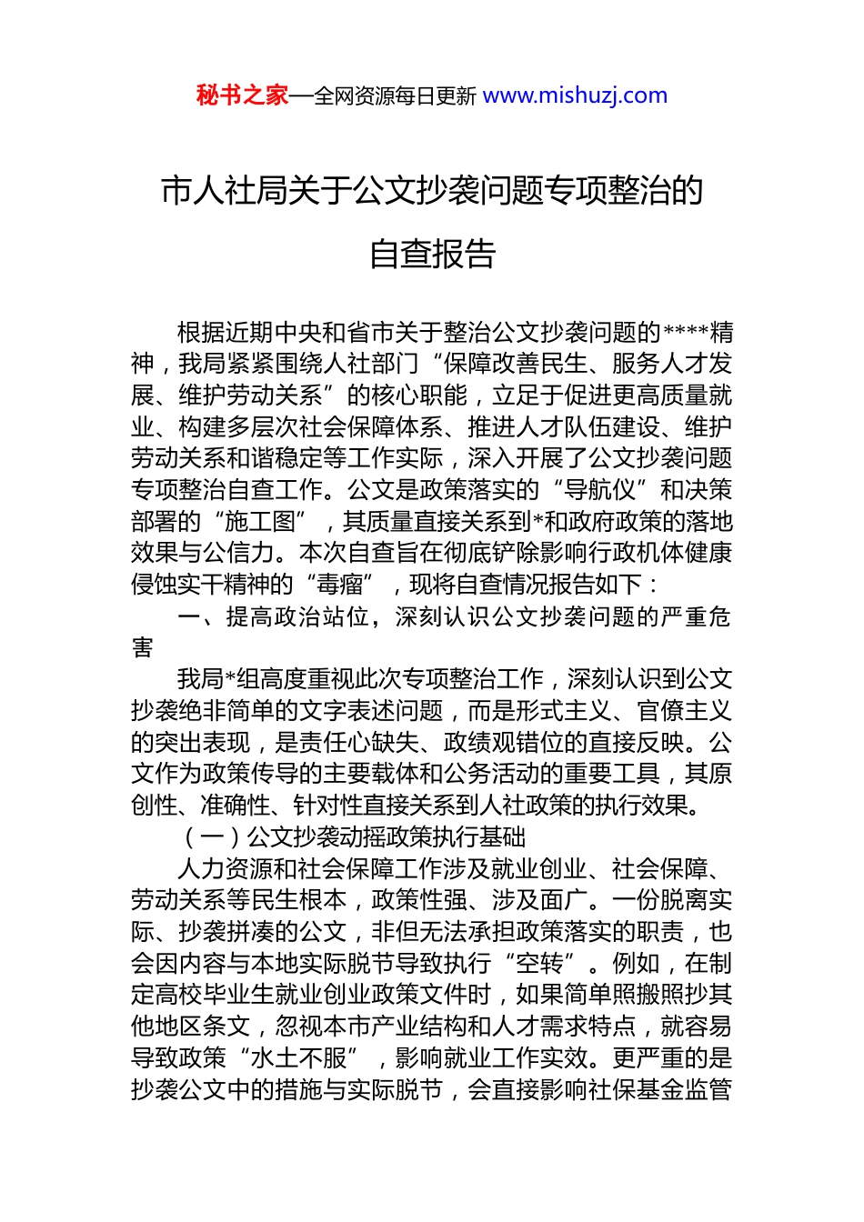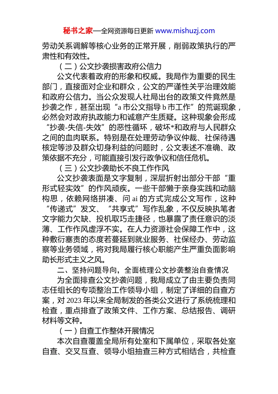 秘书之家—全网资源每日更新 www.mishuzj.com市人社局关于公文抄袭问题专项整治的自查报告根据近期中央和省市关于整治公文抄袭问题的****精神,我局紧紧围绕人社部门“保障改善民生、服务人才发展、维护劳动关系”的核心职能,立足于促进更高质量就业、构建多层次社会保障体系、推进人才队伍建设、维护劳动关系和谐稳定等工作实际,深入开展了公文抄袭问题专项整治自查工作。公文是政策落实的“导航仪”和决策部署的“施工图”,其质量直接关系到*和政府政策的落地效果与公信力。本次自查旨在彻底铲除影响行政机体健康侵蚀实干精神的“毒瘤”,现将自查情况报告如下:一、提高政治站位,深刻认识公文抄袭问题的严重危害我局*组高度重视此次专项整治工作,深刻认识到公文抄袭绝非简单的文字表述问题,而是形式主义、官僚主义的突出表现,是责任心缺失、政绩观错位的直接反映。公文作为政策传导的主要载体和公务活动的重要工具,其原创性、准确性、针对性直接关系到人社政策的执行效果。(一)公文抄袭动摇政策执行基础人力资源和社会保障工作涉及就业创业、社会保障、劳动关系等民生根本,政策性强、涉及面广。一份脱离实际、抄袭拼凑的公文,非但无法承担政策落实的职责,也会因内容与本地实际脱节导致执行“空转”。例如,在制定高校毕业生就业创业政策文件时,如果简单照搬照抄其他地区条文,忽视本市产业结构和人才需求特点,就容易导致政策“水土不服”,影响就业工作实效。更严重的是抄袭公文中的措施与实际脱节,会直接影响社保基金监管秘书之家—全网资源每日更新 www.mishuzj.com劳动关系调解等核心业务的正常开展,削弱政策执行的严肃性和有效性。(二)公文抄袭损害政府公信力公文代表着政府的形象和权威。我局作为重要的民生部门,直接面对企业和群众,公文的严谨性关乎治理效能和政府公信力。当公众发现人社局出台的政策文件竟然是抄袭之作,甚至出现“a 市公文指导 b 市工作”的荒诞现象,必然会对政府执政能力和诚意产生质疑。这种现象会形成“抄袭-失信-失效”的恶性循环,破坏*和政府与人民群众之间的血肉联系。特别是在处理劳动争议仲裁、社保待遇核定等涉及群众切身利益的问题时,公文表述不准确、政策依据不充分,可能直接引发行政争议和信任危机。(三)公文抄袭助长不良工作作风公文抄袭表面是文字复制,深层折射出部分干部“重形式轻实效”的作风顽疾。一些干部懒于亲身实践和动脑构思,依赖网络拼凑、问 ai 的方式完成公文写作,这种“传递式”发文、“共享式”写作乱象,不仅反映执笔者文字能力欠缺、投机取巧走捷径,也暴露了责任意识的淡薄、工作作风虚浮不实。在人力资源社会保障工作中,这种敷衍塞责的态度若蔓延到就业服务、社保经办、劳动监察等业务领域,将对我局履行核心职能产生严重负面影响助长形式主义之风。二、坚持问题导向,全面梳理公文抄袭整治自查情况为全面排查公文抄袭问题,我局成立了由主要负责同志任组长的专项整治工作领导小组,制定了详细的自查方案,对 2023 年以来全局制发的各类公文进行了系统梳理和检查,重点排查了政策文件、工作方案、总结报告、调研材料等文种。(一)自查工作整体开展情况本次自查覆盖全局所有处室和下属单位,采取各处室自查、交叉互查、领导小组抽查三种方式相结合,共检查秘书之家—全网资源每日更新 www.mishuzj.com文件 558 份,发现问题文件 23 份,问题发现率为 4.12%。自查内容包括文件的原创性、内容的针对性、数据的准确性、措施的可行性等方面。为增强自查效果,我局还组织学习了《*政机关公文处理工作条例》和《*政机关公文格式》国家标准,确保自查工作规范有序。(二)抄袭问题主要表现形式通过自查,我们发现公文抄袭问题主要表现为以下几种形式:1.机械照搬,简单复制。部分干部在起草公文时,习惯从网上搜索类似文档,直接复制其他地区或部门的工作举措和政策表述,仅修改单位名称和少量数据,缺乏结合本市实际的深入思考。例如,在制定人才引进政策时,个别处室直接套用发达地区标准,未充分考虑我市经济发展水平和人才需求结构,导致政策与实际脱节。2.东拼西凑,移花...
