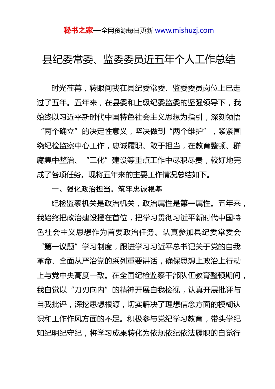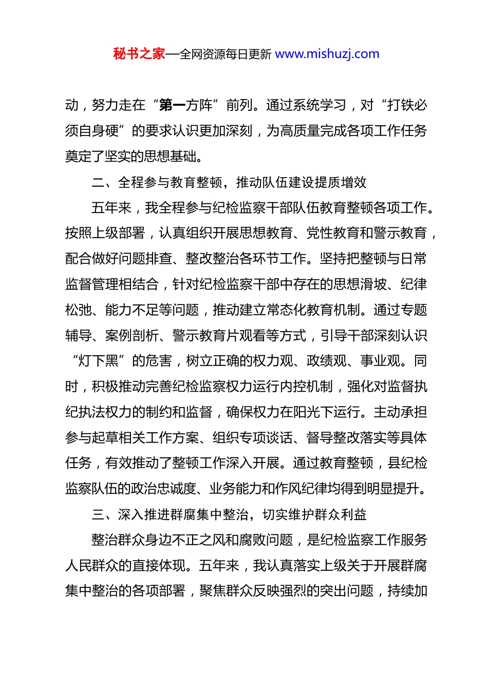 秘书之家—全网资源每日更新 www.mishuzj.com县纪委常委、监委委员近五年个人工作总结 时光荏苒,转眼间我在县纪委常委、监委委员岗位上已走过了五年。五年来,在县委和上级纪委监委的坚强领导下,我始终以习近平新时代中国特色社会主义思想为指引,深刻领悟“两个确立”的决定性意义,坚决做到“两个维护”,紧紧围绕纪检监察中心工作,忠诚履职、敢于担当,在教育整顿、群腐集中整治、“三化”建设等重点工作中尽职尽责,较好地完成了各项任务。现将五年来的主要工作情况总结如下。一、强化政治担当,筑牢忠诚根基纪检监察机关是政治机关,政治属性是第一属性。五年来,我始终把政治建设摆在首位,把学习贯彻习近平新时代中国特色社会主义思想作为首要政治任务。认真参加县纪委常委会“第一议题”学习制度,跟进学习习近平总书记关于党的自我革命、全面从严治党的系列重要讲话,确保思想上政治上行动上与党中央高度一致。在全国纪检监察干部队伍教育整顿期间,我自觉以“刀刃向内”的精神开展自我检视,认真开展批评与自我批评,深挖思想根源,切实解决了理想信念方面的模糊认识和工作作风方面的不足。积极参与党纪学习教育,带头学纪知纪明纪守纪,将学习成果转化为依规依纪依法履职的自觉行秘书之家—全网资源每日更新 www.mishuzj.com动,努力走在“第一方阵”前列。通过系统学习,对“打铁必须自身硬”的要求认识更加深刻,为高质量完成各项工作任务奠定了坚实的思想基础。二、全程参与教育整顿,推动队伍建设提质增效五年来,我全程参与纪检监察干部队伍教育整顿各项工作。按照上级部署,认真组织开展思想教育、党性教育和警示教育,配合做好问题排查、整改整治各环节工作。坚持把整顿与日常监督管理相结合,针对纪检监察干部中存在的思想滑坡、纪律松弛、能力不足等问题,推动建立常态化教育机制。通过专题辅导、案例剖析、警示教育片观看等方式,引导干部深刻认识“灯下黑”的危害,树立正确的权力观、政绩观、事业观。同时,积极推动完善纪检监察权力运行内控机制,强化对监督执纪执法权力的制约和监督,确保权力在阳光下运行。主动承担参与起草相关工作方案、组织专项谈话、督导整改落实等具体任务,有效推动了整顿工作深入开展。通过教育整顿,县纪检监察队伍的政治忠诚度、业务能力和作风纪律均得到明显提升。三、深入推进群腐集中整治,切实维护群众利益整治群众身边不正之风和腐败问题,是纪检监察工作服务人民群众的直接体现。五年来,我认真落实上级关于开展群腐集中整治的各项部署,聚焦群众反映强烈的突出问题,持续加秘书之家—全网资源每日更新 www.mishuzj.com大整治力度。重点围绕农村集体“三资”管理、乡村振兴资金使用监管、医保基金管理、教育医疗、养老社保等民生领域,紧盯重点人、重点事、关键环节,深挖问题线索,严肃查处“蝇贪蚁腐”。在参与审查调查工作中,坚持依规依纪依法办案,做到事实清楚、证据确凿、定性准确、处理恰当。同时,积极推动以案促改、以案促治,督促案发单位认真开展整改,建立健全相关制度,堵塞权力运行漏洞,推动形成“案件查办—整改纠治—专项治理”的工作闭环。通过持续深化群腐集中整治,有效遏制了基层腐败问题的滋生蔓延,群众获得感和满意度明显提升。四、扎实推进“三化”建设,提升工作规范化水平二十届中央纪委四次全会明确提出开展“纪检监察工作规范化法治化正规化建设年”行动。五年来,我将“三化”建设贯穿纪检监察工作全过程各方面,努力提高依规依纪依法履职水平。在规范化建设方面,积极参与完善监督检查、审查调查、问题线索处置等各环节工作制度,推动建立标准统一的工作制度体系,确保监督执纪执法全链条有规可依、有章可循,有效提升了整体工作规范化水平。在法治化建设方面,始终坚持将法治思维和法治方式贯穿正风肃纪反腐全过程,牢固树立法治意识、程序意识、证据意识,严格按照权限、规则、程序开展秘书之家—全网资源每日更新 www.mishuzj.com工作,认真学习贯彻修改后的《监察法》及其实施条例,确保监察执法权在法治轨道上规范行使。在正规化建设方面,注重加强自身能力建设,积极参加...