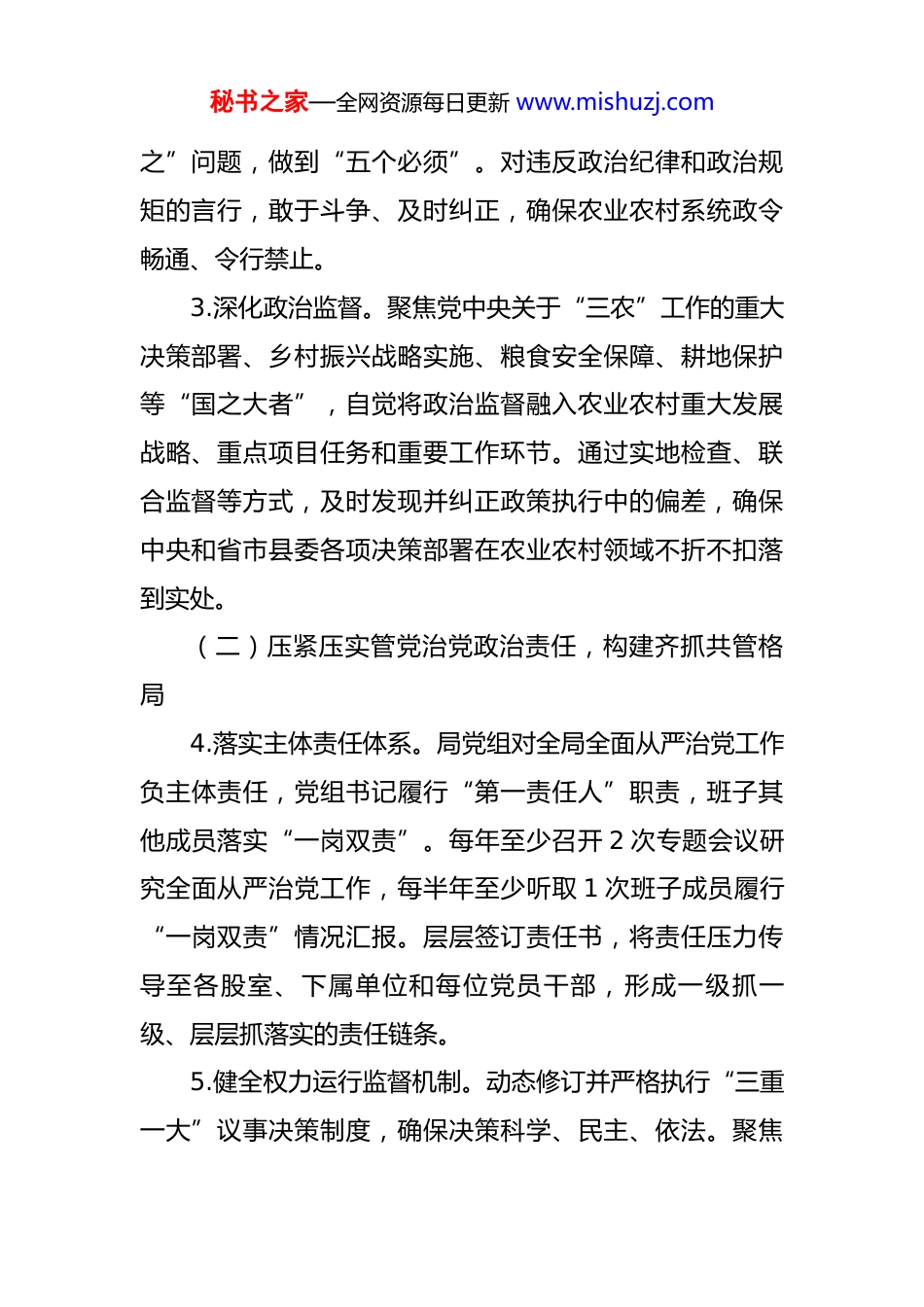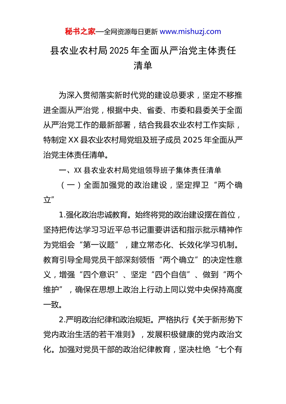 秘书之家—全网资源每日更新 www.mishuzj.com县农业农村局 2025 年全面从严治党主体责任清单 为深入贯彻落实新时代党的建设总要求,坚定不移推进全面从严治党,根据中央、省委、市委和县委关于全面从严治党工作的最新部署,结合我县农业农村工作实际,特制定 XX 县农业农村局党组及班子成员 2025 年全面从严治党主体责任清单。一、XX 县农业农村局党组领导班子集体责任清单(一)全面加强党的政治建设,坚定捍卫“两个确立”1.强化政治忠诚教育。始终将党的政治建设摆在首位,坚持把传达学习习近平总书记重要讲话和指示批示精神作为党组会“第一议题”,建立常态化、长效化学习机制。教育引导全局党员干部深刻领悟“两个确立”的决定性意义,增强“四个意识”、坚定“四个自信”、做到“两个维护”,确保在思想上政治上行动上同以党中央保持高度一致。2.严明政治纪律和政治规矩。严格执行《关于新形势下党内政治生活的若干准则》,发展积极健康的党内政治文化。加强对党员干部的政治纪律教育,坚决杜绝“七个有秘书之家—全网资源每日更新 www.mishuzj.com之”问题,做到“五个必须”。对违反政治纪律和政治规矩的言行,敢于斗争、及时纠正,确保农业农村系统政令畅通、令行禁止。3.深化政治监督。聚焦党中央关于“三农”工作的重大决策部署、乡村振兴战略实施、粮食安全保障、耕地保护等“国之大者”,自觉将政治监督融入农业农村重大发展战略、重点项目任务和重要工作环节。通过实地检查、联合监督等方式,及时发现并纠正政策执行中的偏差,确保中央和省市县委各项决策部署在农业农村领域不折不扣落到实处。(二)压紧压实管党治党政治责任,构建齐抓共管格局4.落实主体责任体系。局党组对全局全面从严治党工作负主体责任,党组书记履行“第一责任人”职责,班子其他成员落实“一岗双责”。每年至少召开 2 次专题会议研究全面从严治党工作,每半年至少听取 1 次班子成员履行“一岗双责”情况汇报。层层签订责任书,将责任压力传导至各股室、下属单位和每位党员干部,形成一级抓一级、层层抓落实的责任链条。5.健全权力运行监督机制。动态修订并严格执行“三重一大”议事决策制度,确保决策科学、民主、依法。聚焦秘书之家—全网资源每日更新 www.mishuzj.com农业项目审批、涉农资金分配、行政执法、大宗物资采购等重点领域和关键环节,完善风险防控机制。加强对权力运行的制约和监督,推进党务、政务公开,主动接受派驻纪检监察组监督、群众监督和舆论监督。6.强化考核问责。将全面从严治党工作纳入全局年度目标考核体系,与业务工作同部署、同落实、同检查、同考核。综合运用监督执纪“四种形态”,特别是“第一种形态”,对苗头性、倾向性问题早发现、早提醒、早处置。对履行管党治党责任不力、造成严重后果的,依规依纪严肃问责。(三)强化思想理论武装,筑牢意识形态坚固防线7.深化理论学习。严格落实党组理论学习中心组学习制度,年度集中学习不少于 12 次。以学习贯彻党的创新理论为重点,巩固拓展主题教育成果,组织专题研讨、读书班等,推动学习往深里走、往实里走、往心里走,切实把学习成果转化为推动农业农村高质量发展的实际成效。8.加强意识形态阵地管理。严格落实意识形态工作责任制,定期分析研判农业农村领域意识形态风险,加强对局属网站、微信公众号等宣传阵地的建设和管理。密切关注涉农领域舆情动态,特别是涉及农产品质量安全、惠农政策落实、农村社会稳定等方面的问题,及时有效引导舆秘书之家—全网资源每日更新 www.mishuzj.com论,坚决维护意识形态安全。(四)锻造高素质干部队伍,夯实事业发展组织基础9.坚持正确选人用人导向。严格执行新时代好干部标准和《党政领导干部选拔任用工作条例》,树立重实干、重实绩、重担当的用人导向。规范干部选拔任用程序,做好动议、民主推荐、考察等各环节工作,坚决防止和纠正选人用人上的不正之风。10.加强干部教育监督管理。把严管和厚爱结合起来,加强对年轻干部的教育管理监督,定期开展谈心谈话。强化干部日常监督,掌握干部思想、工作、作风、生活状况。认真落实个人有关事项报告、领导...