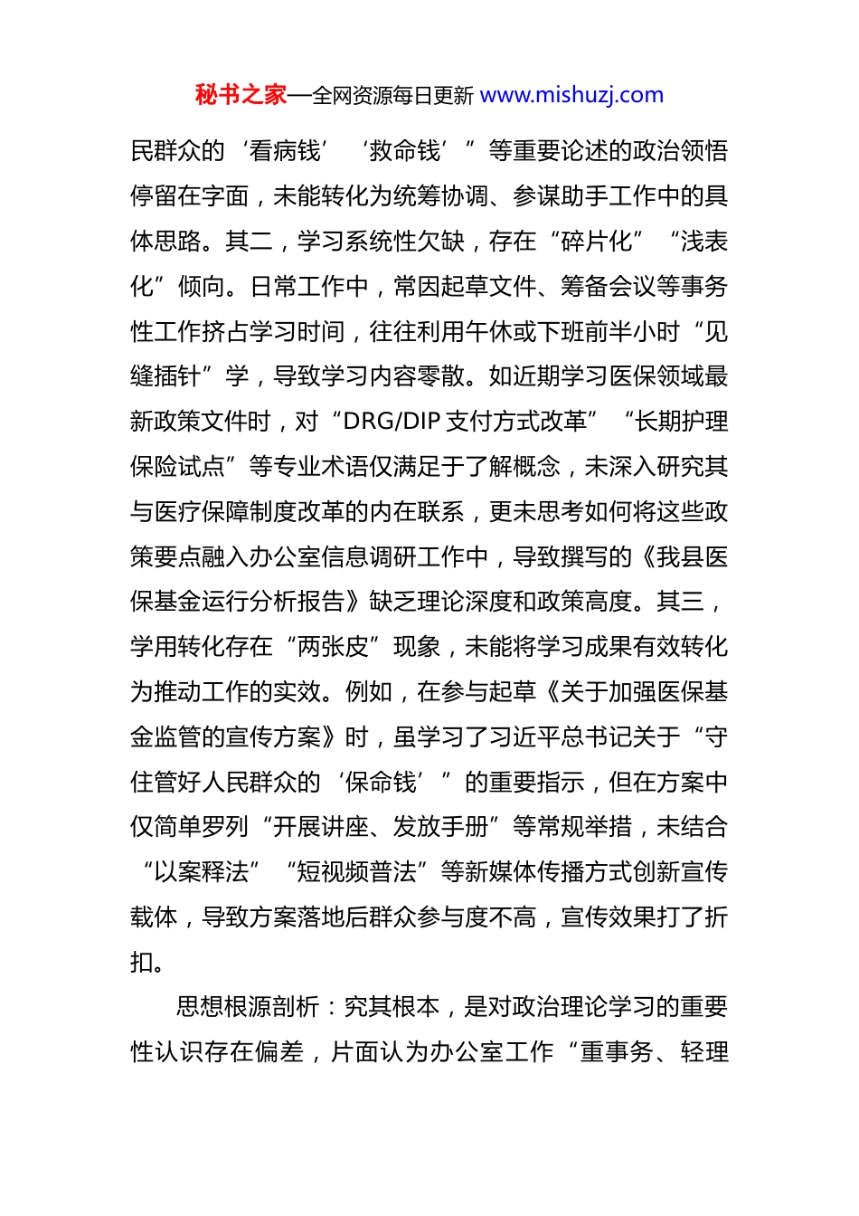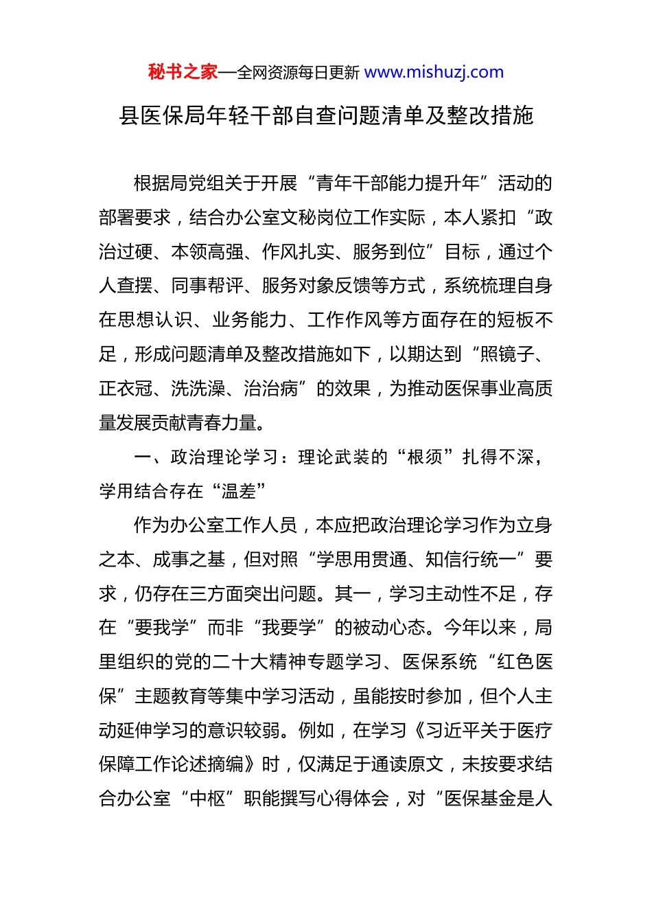 秘书之家—全网资源每日更新 www.mishuzj.com县医保局年轻干部自查问题清单及整改措施 根据局党组关于开展“青年干部能力提升年”活动的部署要求,结合办公室文秘岗位工作实际,本人紧扣“政治过硬、本领高强、作风扎实、服务到位”目标,通过个人查摆、同事帮评、服务对象反馈等方式,系统梳理自身在思想认识、业务能力、工作作风等方面存在的短板不足,形成问题清单及整改措施如下,以期达到“照镜子、正衣冠、洗洗澡、治治病”的效果,为推动医保事业高质量发展贡献青春力量。一、政治理论学习:理论武装的“根须”扎得不深,学用结合存在“温差”作为办公室工作人员,本应把政治理论学习作为立身之本、成事之基,但对照“学思用贯通、知信行统一”要求,仍存在三方面突出问题。其一,学习主动性不足,存在“要我学”而非“我要学”的被动心态。今年以来,局里组织的党的二十大精神专题学习、医保系统“红色医保”主题教育等集中学习活动,虽能按时参加,但个人主动延伸学习的意识较弱。例如,在学习《习近平关于医疗保障工作论述摘编》时,仅满足于通读原文,未按要求结合办公室“中枢”职能撰写心得体会,对“医保基金是人秘书之家—全网资源每日更新 www.mishuzj.com民群众的‘看病钱’‘救命钱’”等重要论述的政治领悟停留在字面,未能转化为统筹协调、参谋助手工作中的具体思路。其二,学习系统性欠缺,存在“碎片化”“浅表化”倾向。日常工作中,常因起草文件、筹备会议等事务性工作挤占学习时间,往往利用午休或下班前半小时“见缝插针”学,导致学习内容零散。如近期学习医保领域最新政策文件时,对“DRG/DIP 支付方式改革”“长期护理保险试点”等专业术语仅满足于了解概念,未深入研究其与医疗保障制度改革的内在联系,更未思考如何将这些政策要点融入办公室信息调研工作中,导致撰写的《我县医保基金运行分析报告》缺乏理论深度和政策高度。其三,学用转化存在“两张皮”现象,未能将学习成果有效转化为推动工作的实效。例如,在参与起草《关于加强医保基金监管的宣传方案》时,虽学习了习近平总书记关于“守住管好人民群众的‘保命钱’”的重要指示,但在方案中仅简单罗列“开展讲座、发放手册”等常规举措,未结合“以案释法”“短视频普法”等新媒体传播方式创新宣传载体,导致方案落地后群众参与度不高,宣传效果打了折扣。思想根源剖析:究其根本,是对政治理论学习的重要性认识存在偏差,片面认为办公室工作“重事务、轻理秘书之家—全网资源每日更新 www.mishuzj.com论”,未意识到政治能力是年轻干部的首要能力,理论素养不足会直接影响参谋辅政的精准性。同时,缺乏“钉钉子”精神,对学习缺乏长远规划,存在“完成任务”心态,导致学习效果打了折扣。整改措施:1.制定“每日半小时、每周一研讨、每月一总结”的学习计划。每日早 8:00-8:30 固定为个人自学时间,重点研读《习近平著作选读》《习近平新时代中国特色社会主义思想专题摘编》等原著原文,结合医保工作记录学习笔记;每周五下午办公室集体学习时,围绕“医保系统如何贯彻落实以人民为中心的发展思想”等主题开展研讨,主动分享学习心得;每月末梳理学习成果,形成 1 篇 500 字左右的学习感悟,报分管领导审阅。2.建立“政策学习台账”。针对医保领域最新政策文件,按“基金监管、待遇保障、经办服务”等类别分类整理,每季度至少开展 1 次“政策进科室”活动,为各业务股室解读政策要点,推动办公室从“文件中转站”向“政策翻译器”转变。3.强化学用结合实践。结合办公室“以文辅政”职能,在起草重要文件、筹备重要会议前,主动对接业务股室收集典型案例,将习近平总书记关于医保工作的重要论述贯秘书之家—全网资源每日更新 www.mishuzj.com穿材料始终。例如,在筹备下季度全县医保工作会议时,拟选取 3 个基金监管正面案例和 1 个反面警示案例,通过“案例+论述”的方式增强会议材料的感染力和指导性。二、业务能力提升:专业素养的“短板”补得不实,履职尽责存在“误差”办公室工作涉及公文处理、综合协调、信息调研等多个领域,对业务能力提出了更高要求。但对照“精...