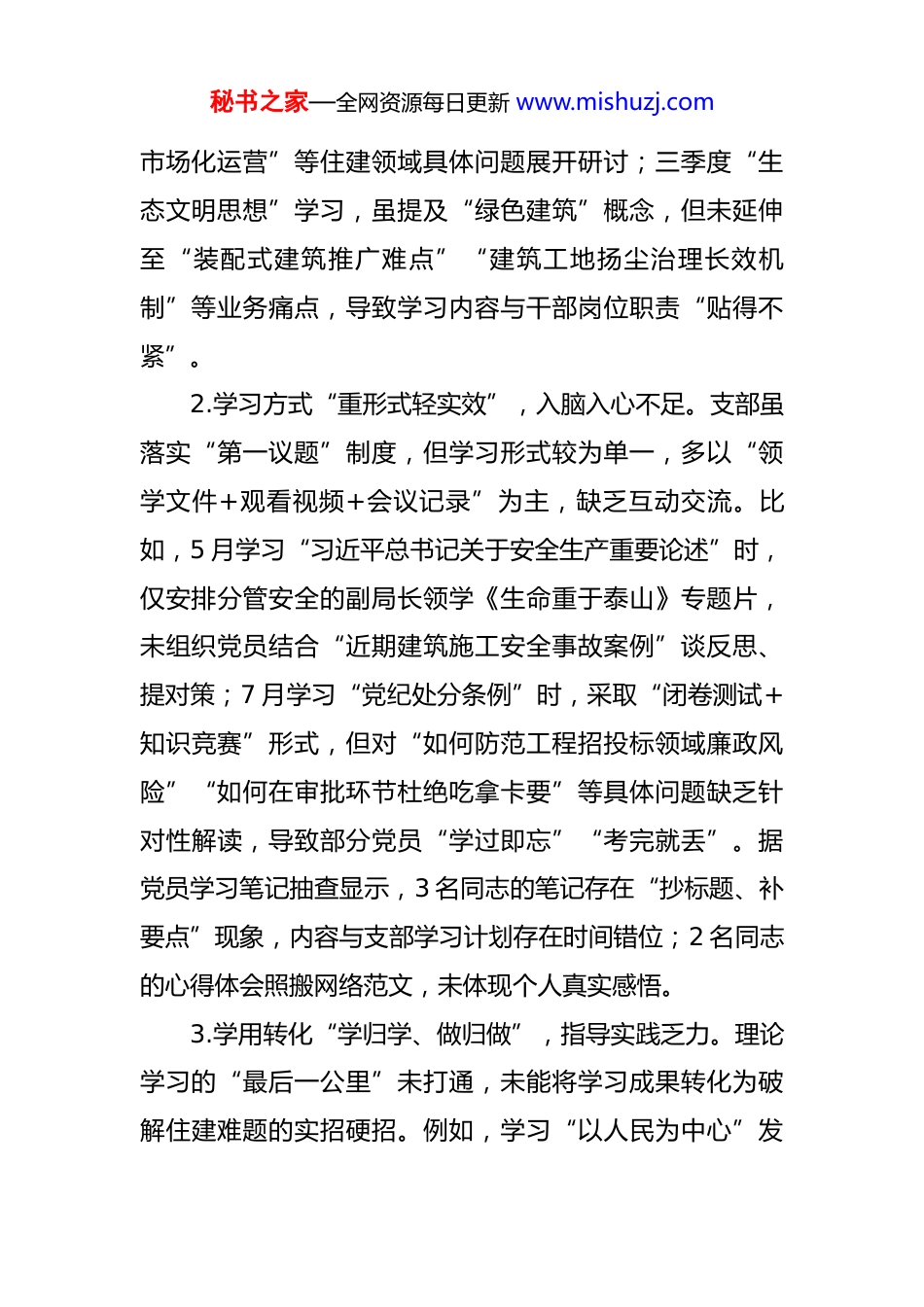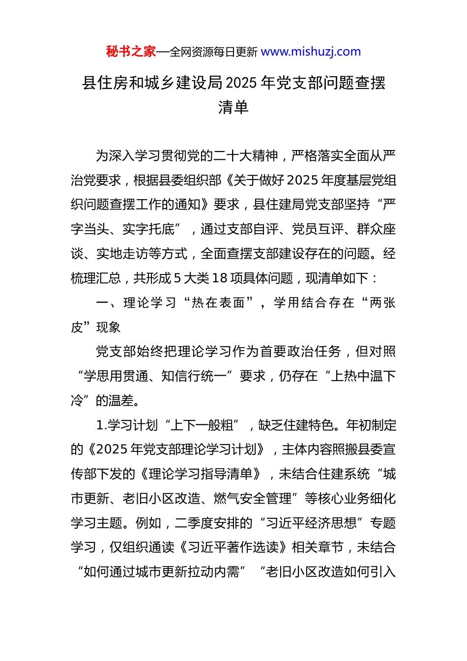 秘书之家—全网资源每日更新 www.mishuzj.com县住房和城乡建设局 2025 年党支部问题查摆清单 为深入学习贯彻党的二十大精神,严格落实全面从严治党要求,根据县委组织部《关于做好 2025 年度基层党组织问题查摆工作的通知》要求,县住建局党支部坚持“严字当头、实字托底”,通过支部自评、党员互评、群众座谈、实地走访等方式,全面查摆支部建设存在的问题。经梳理汇总,共形成 5 大类 18 项具体问题,现清单如下:一、理论学习“热在表面”,学用结合存在“两张皮”现象党支部始终把理论学习作为首要政治任务,但对照“学思用贯通、知信行统一”要求,仍存在“上热中温下冷”的温差。1.学习计划“上下一般粗”,缺乏住建特色。年初制定的《2025 年党支部理论学习计划》,主体内容照搬县委宣传部下发的《理论学习指导清单》,未结合住建系统“城市更新、老旧小区改造、燃气安全管理”等核心业务细化学习主题。例如,二季度安排的“习近平经济思想”专题学习,仅组织通读《习近平著作选读》相关章节,未结合“如何通过城市更新拉动内需”“老旧小区改造如何引入秘书之家—全网资源每日更新 www.mishuzj.com市场化运营”等住建领域具体问题展开研讨;三季度“生态文明思想”学习,虽提及“绿色建筑”概念,但未延伸至“装配式建筑推广难点”“建筑工地扬尘治理长效机制”等业务痛点,导致学习内容与干部岗位职责“贴得不紧”。2.学习方式“重形式轻实效”,入脑入心不足。支部虽落实“第一议题”制度,但学习形式较为单一,多以“领学文件+观看视频+会议记录”为主,缺乏互动交流。比如,5 月学习“习近平总书记关于安全生产重要论述”时,仅安排分管安全的副局长领学《生命重于泰山》专题片,未组织党员结合“近期建筑施工安全事故案例”谈反思、提对策;7 月学习“党纪处分条例”时,采取“闭卷测试+知识竞赛”形式,但对“如何防范工程招投标领域廉政风险”“如何在审批环节杜绝吃拿卡要”等具体问题缺乏针对性解读,导致部分党员“学过即忘”“考完就丢”。据党员学习笔记抽查显示,3 名同志的笔记存在“抄标题、补要点”现象,内容与支部学习计划存在时间错位;2 名同志的心得体会照搬网络范文,未体现个人真实感悟。3.学用转化“学归学、做归做”,指导实践乏力。理论学习的“最后一公里”未打通,未能将学习成果转化为破解住建难题的实招硬招。例如,学习“以人民为中心”发秘书之家—全网资源每日更新 www.mishuzj.com展思想后,虽认识到“老旧小区改造要倾听群众意见”,但在具体推进中,仍存在“重工程进度、轻居民需求”问题——今年 3 月启动的南环路片区改造项目,前期仅通过社区公示栏发布征求意见公告,未深入小区召开“板凳会”,导致部分居民提出的“增设电动车充电桩位置”“保留老槐树”等诉求未被采纳,施工期间多次引发群众投诉;学习“数字经济”相关论述后,对“智慧住建”平台建设仅停留在“安装监控摄像头、搭建数据大屏”层面,未深入研究“如何通过大数据分析优化燃气巡检路线”“如何利用 BIM 技术提升工程监管效率”等具体应用场景,平台建成半年来,数据利用率不足 20%。二、服务群众“浮在面上”,宗旨意识践行存在“温差感”党支部始终强调“住建工作一头连着发展、一头连着民生”,但对照“把群众的事当成自家事”要求,仍存在“脚步到了、心意没到”的问题。1.调研走访“打卡式”完成任务,问题解决“挂空挡”。虽制定《支部党员联系服务群众实施方案》,要求每月至少 1 次下沉社区、工地、企业,但部分党员存在“完成任务”心态。比如,二季度开展的“住建领域民生问题大排查”中,有的党员仅到联系点社区“转一圈”,秘书之家—全网资源每日更新 www.mishuzj.com与物业、业委会负责人聊几句,未入户走访普通居民;有的党员将调研变成“资料收集”,对“某小区电梯频繁故障”“某工地夜间施工扰民”等问题,仅记录在本子上,未按程序转交相关股室跟踪督办。今年上半年,支部共收集群众诉求 42 件,其中 15 件因“调查不深、责任不清”未及时办结,3 件因“推诿扯皮”被群众二次投诉(如某老旧小区化粪池堵塞问题...
