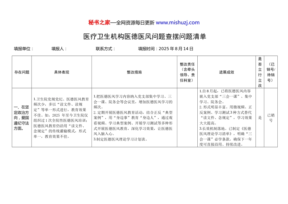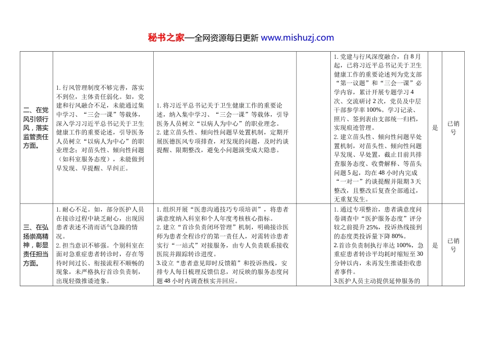 秘书之家—全网资源每日更新 www.mishuzj.com医疗卫生机构医德医风问题查摆问题清单填报单位: 填报人: 联系方式: 填报时间:2025 年 8 月 14 日存在问题具体表现整改措施整改责任(含牵头领导、责任科室)进展成效是否立行立改(已销号/待销号)一、在坚定政治方向,爱国遵纪守法方面。1.卫生院党规党纪、医德医风教育频次少,多以“读文件、读规定”等单一形式进行,教育效果不佳。如,2025 年至今卫生院仅组织过 1 次全院性医德医风培训;医德医风教育仍沿用“读文件、念规定”的传统灌输模式,形式单一,教育效果不佳。1.把医德医风学习内容纳入党支部集中学习、三会一课、院务会等会议里,增加医德医风学习的频次。2.定期开展医德医风教育活动,结合正反“典型案例”,用“身边事”教育“身边人”,通过观看视频、学习典型案例、开展学习测试等多种形式开展医德医风教育,深化学习效果,让医德医风入脑入心。3.制定医德医风理论学习计划表。1.自 8 月起,已将医德医风内容嵌入党支部“三会一课”、集中学习、院务会。2.形式明显丰富。用微视频、正反案例、学习测试 3 种方式替代“读文件、念规定”,学习效果大大提高。3.长效机制落地。已制定《医德医风理论学习清单》,明确“三会一课”必学条款,确保下一年度可直接沿用、持续改进。是已销号秘书之家—全网资源每日更新 www.mishuzj.com二、在党风引领行风,落实监管责任方面。1.行风管理制度不够完善,落实不到位,主体责任弱化。如,党建和行风融合不足,未能通过集中学习、“三会一课”等载体,深入学习习近平总书记关于卫生健康工作的重要论述,引导医务人员树立“以病人为中心”的职业理念;对苗头性、倾向性问题(如科室服务态度),未能做到早发现、早提醒、早纠正。1.将习近平总书记关于卫生健康工作的重要论述,纳入集中学习、“三会一课”等载体,引导医务人员树立“以病人为中心”的职业理念。2.建立苗头性、倾向性问题早处置机制,定期开展医德医风专项排查,对发现的问题,及时约谈提醒、限期整改,避免小问题演变成大隐患。1.党建与行风深度融合,自 8 月起,已将习近平总书记关于卫生健康工作的重要论述列为党支部“第一议题”和“三会一课”必学内容,累计开展专题学习 4次、交流研讨 2 次,党员及中层干部参学率 100%。学习记录、照片、签到表由支部统一归档,实现痕迹管理。2.建立苗头性、倾向性问题早处置机制,对苗头性、倾向性问题早发现、早处置,截止目前共排查服务态度、收费解释、等苗头问题 5 起,均在 48 小时内完成“一对一”约谈提醒并限期 3 天整改,且整改后复查全部通过,无重复发生。是已销号三、在弘扬崇高精神,彰显责任担当方面。1.耐心不足。如,部分医护人员在接诊过程中缺乏耐心,出现因患者表述不清而语气急躁的情况。2.担当意识不够强。个别科室在面对急重症患者转诊时,存在等待时间过长、衔接流程不顺畅的现象,未严格执行首诊负责制,出现轻微推诿迹象。1.组织开展“医患沟通技巧专项培训”,将患者满意度纳入科室和个人年度考核核心指标。2.建立“首诊负责闭环管理”机制,明确接诊医师为患者全程诊疗的第一责任人,对需转诊患者实行“一站式”对接服务,由专人负责联系接收医院并跟踪转诊进度。3.设立“患者意见即时反馈箱”和投诉热线,安排专人每日梳理反馈信息,对反映的服务态度问题 48 小时内调查核实并回应。1.通过专项整治,患者满意度问卷调查中“医护服务态度”评分较之前提升 25%,投诉热线接到的态度类投诉量下降 80%。2.首诊负责制执行率达 100%,急重症患者转诊平均耗时缩短至 30分钟以内,未再发生推诿拒收患者事件。3.医护人员主动提供延伸服务的是已销号秘书之家—全网资源每日更新 www.mishuzj.com意识显著增强,如为行动不便患者提供代取药、陪同检查等服务累计达 120 余次。四、在爱岗敬业钻研,恪守伦理规范方面。1.监管机制落实不到位,多是纸上规定与实际执行存在一定差距。如,对医务人员迟到早退等行为放任不管,未将“医德医风评价与职称晋升、评优评先”挂钩,难以形成有效的约束。1.完善《医德医风考评...
