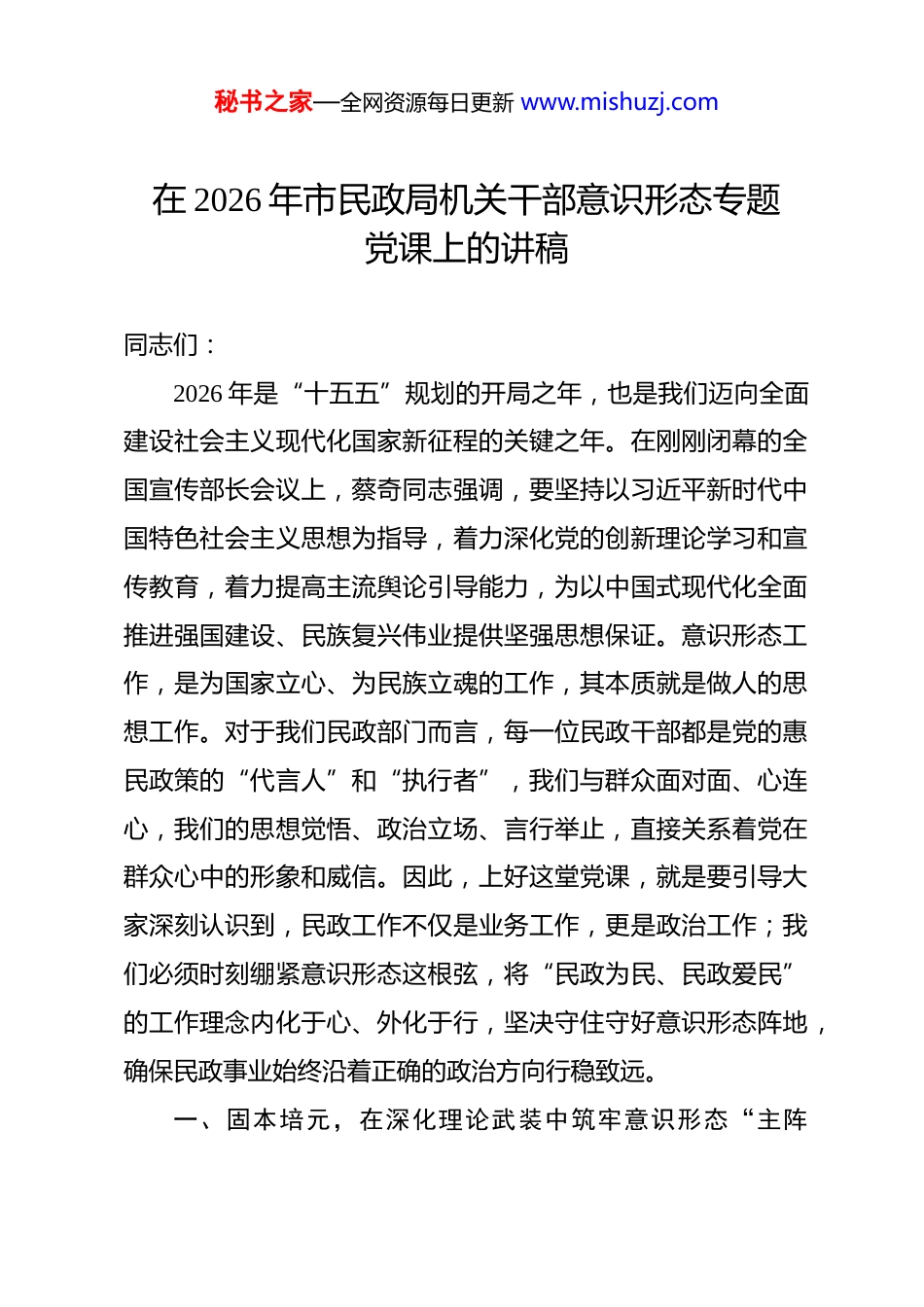 秘书之家—全网资源每日更新 www.mishuzj.com在 2026 年市民政局机关干部意识形态专题党课上的讲稿 同志们:2026 年是“十五五”规划的开局之年,也是我们迈向全面建设社会主义现代化国家新征程的关键之年。在刚刚闭幕的全国宣传部长会议上,蔡奇同志强调,要坚持以习近平新时代中国特色社会主义思想为指导,着力深化党的创新理论学习和宣传教育,着力提高主流舆论引导能力,为以中国式现代化全面推进强国建设、民族复兴伟业提供坚强思想保证。意识形态工作,是为国家立心、为民族立魂的工作,其本质就是做人的思想工作。对于我们民政部门而言,每一位民政干部都是党的惠民政策的“代言人”和“执行者”,我们与群众面对面、心连心,我们的思想觉悟、政治立场、言行举止,直接关系着党在群众心中的形象和威信。因此,上好这堂党课,就是要引导大家深刻认识到,民政工作不仅是业务工作,更是政治工作;我们必须时刻绷紧意识形态这根弦,将“民政为民、民政爱民”的工作理念内化于心、外化于行,坚决守住守好意识形态阵地,确保民政事业始终沿着正确的政治方向行稳致远。一、固本培元,在深化理论武装中筑牢意识形态“主阵秘书之家—全网资源每日更新 www.mishuzj.com地”(一)理论上清醒,政治上才能坚定。意识形态领域的较量,本质上是信仰信念的较量。习近平总书记深刻指出,“理论上的成熟是政治上成熟的基础,政治上的坚定源于理论上的清醒”。民政工作千头万绪,涉及社会救助、养老服务、基层治理等多个领域,每一项工作都带有鲜明的政治属性。如果不注重理论武装,思想就容易“跑偏”,工作就容易“走样”。因此,我们必须把学习党的创新理论作为首要政治任务,以理论上的清醒确保政治上的坚定,从根本上筑牢意识形态的思想根基。具体而言,要在以下三个维度上持续发力。一是坚持“第一议题”制度,在深学细悟中提升政治站位。我们要将学习习近平新时代中国特色社会主义思想,特别是关于民政工作的重要论述,作为局党组会、理论中心组学习、支部“三会一课”的“第一议题”,形成制度化、常态化机制。要在读原著、学原文、悟原理上下功夫,不仅要知其然,更要知其所以然,深刻领会蕴含其中的马克思主义立场观点方法。要紧密结合2026 年最新形势,将习近平文化思想的学习引向深入,确保我们的思想认知跟上党中央要求、跟上时代步伐。我们要深刻理解“两个确立”的决定性意义,把讲政治的要求落实到民政工作的全过程,无论是制定政策、分配资金,还是开展服务、回秘书之家—全网资源每日更新 www.mishuzj.com应诉求,都要首先对标对表党中央决策部署,确保执行不偏向、不走样。二是强化“知行合一”导向,在履职尽责中检验学习成效。理论学习的落脚点在于指导实践、推动工作。我们要坚决反对“学习归学习、工作归工作”的“两张皮”现象。要把意识形态工作责任制落实情况纳入领导班子和领导干部年度考核,与民政业务工作同部署、同落实、同检查、同考核。例如,在制定社会救助政策时,我们是否充分考虑了如何既保障困难群众基本生活,又有效激发其内生动力,避免产生“等靠要”的消极思想?在推进移风易俗、殡葬改革时,我们是否做到了既依法依规推进,又注重方式方法,避免因简单粗暴引发负面舆情?这些都需要我们用党的创新理论来审视、来指导,确保业务工作的政治效果、社会效果相统一。三是拓展“多元载体”覆盖,在潜移默化中凝聚思想共识。意识形态工作不能空对空,必须依托有效的载体。我们要用好“学习强国”“干部网络学院”等线上平台,鼓励干部利用碎片化时间学习;要组织好线下研讨、现场教学,依托本地红色资源开展党性教育,让干部在“行走的党课”中感悟思想伟力。我们要在局机关内部打造“党建文化墙”“民政故事角”,展示优秀党员干部风采,传播民政正能量。特别是针对年轻干部,要注重运用他们喜闻乐见的方式,开展“青年理论学习小组”活动,围绕“新秘书之家—全网资源每日更新 www.mishuzj.com时代民政青年的使命担当”等主题开展交流研讨,引导他们在思想碰撞中筑牢信仰之基,将个人的理想融入党和人民的事业之中。(二)思想上对标,行动上才...