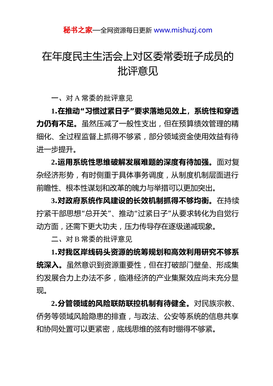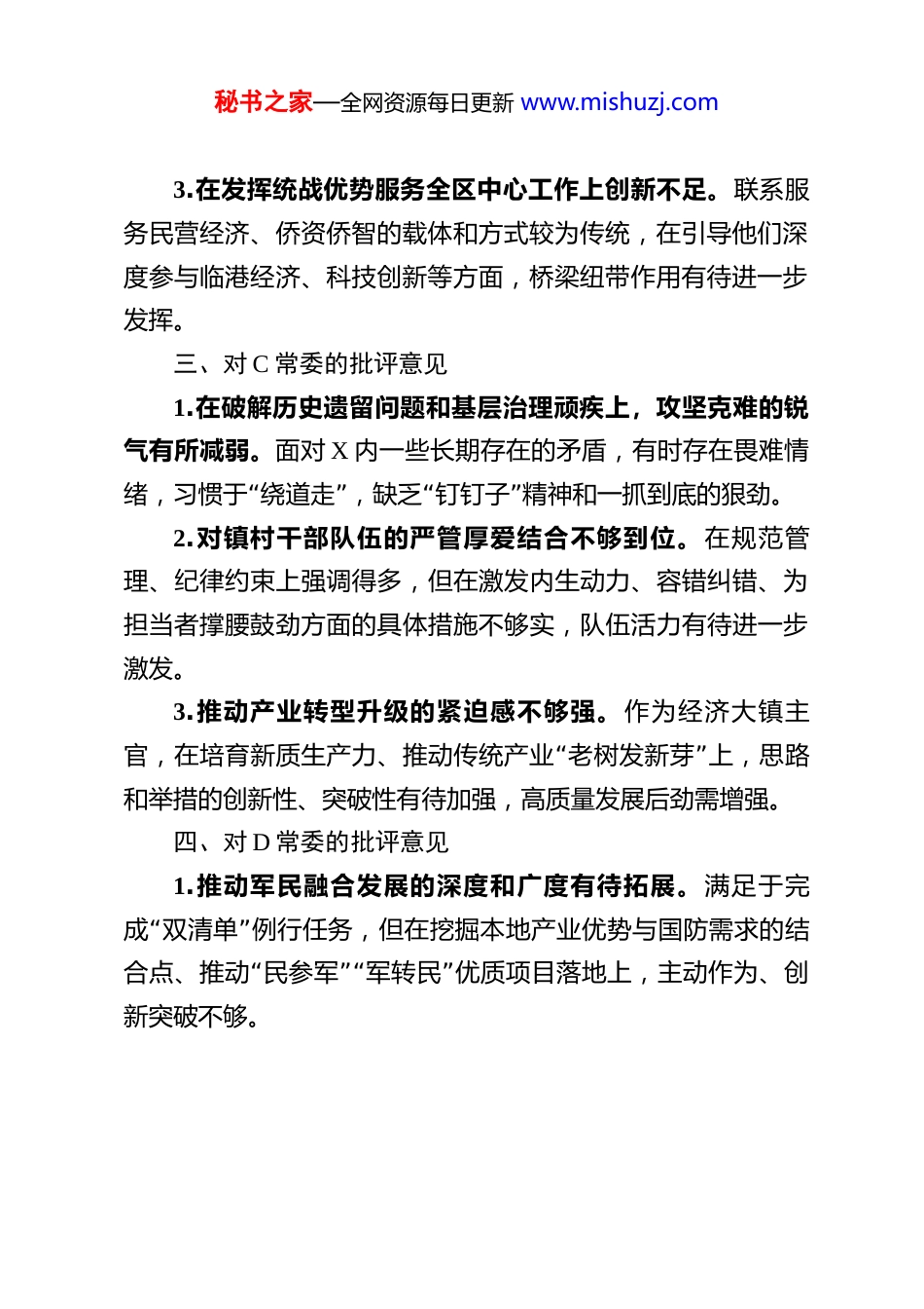秘书之家—全网资源每日更新 www.mishuzj.com在年度民主生活会上对区委常委班子成员的批评意见 一、对 A 常委的批评意见1.“”在推动 习惯过紧日子 要求落地见效上,系统性和穿透力仍有不足。虽然压减了一般性支出,但在预算绩效管理的精细化、全过程监督上抓得不够紧,部分领域资金使用效益有待进一步提升。2.运用系统性思维破解发展难题的深度有待加强。面对复杂经济形势,有时侧重于具体事务调度,从制度机制层面进行前瞻性、根本性谋划和改革的魄力与举措可以更加突出。3.对政府系统作风建设的长效机制抓得不够均衡。在持续“”“”拧紧干部思想 总开关 、推动 过紧日子 从要求转化为自觉行动方面,还需下更大功夫,压力传导存在逐级递减现象。二、对 B 常委的批评意见1.对我区岸线码头资源的统筹规划和高效利用研究不够系统深入。虽然意识到资源重要性,但在打破部门壁垒、形成集约发展合力上办法不多,临港经济的产业集聚效应尚未充分显现。2.分管领域的风险联防联控机制有待健全。对民族宗教、侨务等领域风险隐患的排查,与政法、公安等系统的信息共享和协同处置可以更紧密,底线思维的弦有时绷得不够紧。秘书之家—全网资源每日更新 www.mishuzj.com3.在发挥统战优势服务全区中心工作上创新不足。联系服务民营经济、侨资侨智的载体和方式较为传统,在引导他们深度参与临港经济、科技创新等方面,桥梁纽带作用有待进一步发挥。三、对 C 常委的批评意见1.在破解历史遗留问题和基层治理顽疾上,攻坚克难的锐气有所减弱。面对 X 内一些长期存在的矛盾,有时存在畏难情“”绪,习惯于 绕道走 ,“”缺乏 钉钉子 精神和一抓到底的狠劲。2.对镇村干部队伍的严管厚爱结合不够到位。在规范管理、纪律约束上强调得多,但在激发内生动力、容错纠错、为担当者撑腰鼓劲方面的具体措施不够实,队伍活力有待进一步激发。3.推动产业转型升级的紧迫感不够强。作为经济大镇主“”官,在培育新质生产力、推动传统产业 老树发新芽 上,思路和举措的创新性、突破性有待加强,高质量发展后劲需增强。四、对 D 常委的批评意见1.推动军民融合发展的深度和广度有待拓展。满足于完“”成 双清单 例行任务,但在挖掘本地产业优势与国防需求的结“”“”合点、推动 民参军军转民 优质项目落地上,主动作为、创新突破不够。秘书之家—全网资源每日更新 www.mishuzj.com2.国防动员潜力调查和转化的实效性有待提高。调查数据有时停留在纸面,如何将经济、科技、人才等潜力高效转化为国防实力,缺乏行之有效的常态化机制和抓手。3.在利用国防资源服务地方发展上思考不深。如何组织民兵预备役人员在应急抢险、平安建设等方面发挥更大作用,思路和举措可以更丰富,军地共建共享的效益有待提升。五、对 E 常委的批评意见1.“”对基层社会治理先进经验的总结推广存在 盆景 现象。虽然培育了一些点上的好做法,但在将其上升为普遍性制度机“”制、实现 花园 效应上,系统集成和复制推广力度不足,成效不够显著。2.应对突发公共安全事件的应急处突能力建设存在短板。应急预案的实战化演练不够,多部门协同响应的效率和流畅度有待提升,风险预见性和处置精准性需加强。3.在化解信访积案和矛盾纠纷上,有时过于依赖程序性化解。深入溯源、从根本上解决问题的韧劲不足,运用法治思维和法治方式化解矛盾的能力有待进一步提高。六、对 F 常委的批评意见1.在深化教育、医疗等领域人事制度改革上魄力不足。虽然认识到问题,但在打破体制机制障碍、推动优质人才资源均衡配置上,改革的系统性设计和攻坚力度有待加强,与群众期盼有差距。秘书之家—全网资源每日更新 www.mishuzj.com2.干部队伍专业化能力培养的精准度不够。培训内容有时“与全区中心工作和产业发展需求结合不够紧密,培养 复合”“”型专家型 干部的路径和措施有待优化。3.党建引领基层治理的实效性有待提升。部分领域存在党“”建与业务 两张皮 现象,党组织在服务中心工作、凝聚群众方面的战斗堡垒作用发挥不够充分。七、对 G 常委的批评意见1.“”在推动文旅产业突破发展上,深入一线 解剖麻雀 、破解瓶...