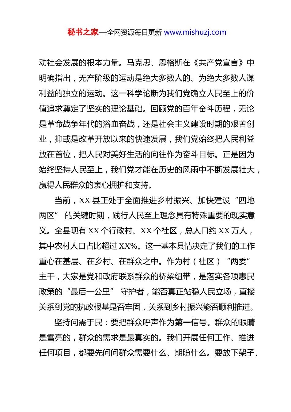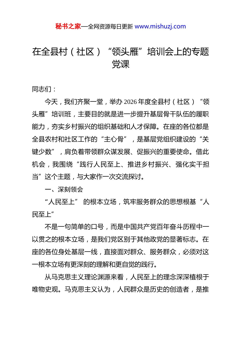 秘书之家—全网资源每日更新 www.mishuzj.com在全县村(社区)“领头雁”培训会上的专题党课 同志们:今天,我们齐聚一堂,举办 2026 年度全县村(社区)“领头雁”培训班,主要目的就是进一步提升基层骨干队伍的履职能力,夯实乡村振兴的组织基础和人才保障。在座的各位都是全县农村和社区工作的“主心骨”,是基层党组织建设的“关键少数”,肩负着带领群众谋发展、促振兴的重要使命。借此机会,我围绕“践行人民至上、推进乡村振兴、强化实干担当”这个主题,与大家作一次交流探讨。一、深刻领会“人民至上” 的根本立场,筑牢服务群众的思想根基“人民至上”不是一句简单的口号,而是中国共产党百年奋斗历程中一以贯之的根本立场,是我们党区别于其他政党的显著标志。在座的各位身处基层一线,直接面对群众、服务群众,必须对这一根本立场有更深刻的理解和更自觉的践行。从马克思主义理论渊源来看,人民至上的理念深深植根于唯物史观。马克思主义认为,人民群众是历史的创造者,是推秘书之家—全网资源每日更新 www.mishuzj.com动社会发展的根本力量。马克思、恩格斯在《共产党宣言》中明确指出,无产阶级的运动是绝大多数人的、为绝大多数人谋利益的独立的运动。这一科学论断为我们党确立人民至上的价值追求奠定了坚实的理论基础。回顾党的百年奋斗历程,无论是革命战争年代的浴血奋战,还是社会主义建设时期的艰苦创业,抑或是改革开放以来的快速发展,我们党始终把人民利益放在首位,把人民对美好生活的向往作为奋斗目标。正是因为始终坚持人民至上,我们党才能在历史的风雨中不断发展壮大,赢得人民群众的衷心拥护和支持。当前,XX 县正处于全面推进乡村振兴、加快建设“四地两区” 的关键时期,践行人民至上理念具有特殊重要的现实意义。全县现有 XX 个行政村、XX 个社区,总人口约 XX 万人,其中农村人口占比超过 XX%。这一基本县情决定了我们的工作重心在基层、在乡村、在群众之中。作为村(社区)“两委”主干,大家是党和政府联系群众的桥梁纽带,是落实各项惠民政策的“最后一公里” 守护者,能否真正站稳人民立场,直接关系到党的执政根基是否牢固,关系到乡村振兴能否顺利推进。坚持问需于民:要把群众呼声作为第一信号。群众的眼睛是雪亮的,群众的需求是最真实的。我们开展任何工作、推进任何项目,都要先问问群众需要什么、期盼什么。要放下架子、秘书之家—全网资源每日更新 www.mishuzj.com扑下身子,走进田间地头、深入农户家中,认真倾听群众的操心事、烦心事、揪心事。要建立健全民情民意收集机制,畅通群众诉求表达渠道,把群众的意见建议作为改进工作的重要依据。过去一年,全县各村(社区)累计收集群众意见建议 XX条,解决群众急难愁盼问题 XX 件,涌现出一批心系群众、服务群众的先进典型。但也要清醒看到,仍有少数干部存在群众观念淡薄、宗旨意识不强的问题,有的坐在办公室听汇报多、下基层走访少,有的对群众诉求敷衍应付、推诿扯皮,这些现象必须坚决纠正。坚持问计于民:要把群众参与作为第一路径。人民群众中蕴藏着无穷的智慧和力量。无论是产业发展、环境整治,还是基层治理、乡风建设,都要充分尊重群众主体地位,发挥群众首创精神。要善于向群众学习、拜群众为师,把群众的实践经验总结好、推广好。要健全民主决策机制,涉及群众切身利益的重大事项,必须广泛听取群众意见,通过村民议事会、居民议事会等程序充分讨论,让群众真正成为基层治理的参与者、受益者。XX 镇 XX 村在推进农村人居环境整治中,创新实行“村民议事会+镇联村机制”,让群众全过程参与整治规划、实施和监督,不仅调动了群众的积极性,也有效化解了矛盾纠纷,该村的做法值得大家学习借鉴。秘书之家—全网资源每日更新 www.mishuzj.com坚持问效于民:要把群众受益作为第一目标。工作的成效好不好、实不实,群众最有发言权。要建立健全群众评价机制,把群众满意度作为检验工作成效的重要标尺。要坚决杜绝形式主义、官僚主义,不搞劳民伤财的“形象工程”“政绩工程”,真正把有限的资金和资源用在刀刃上,让群众有实实在在的获得感。去年,我们对...