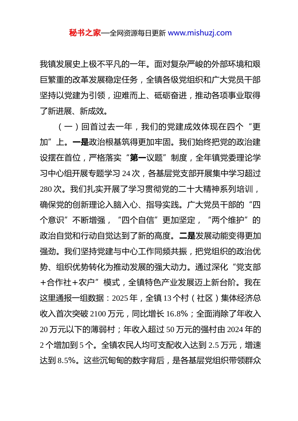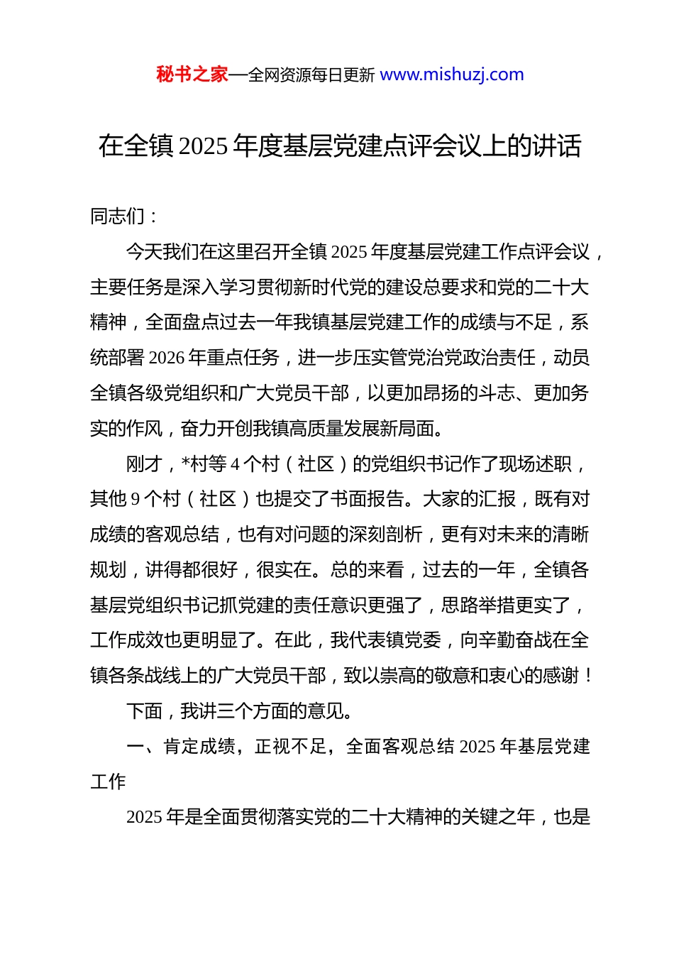 秘书之家—全网资源每日更新 www.mishuzj.com在全镇 2025 年度基层党建点评会议上的讲话 同志们:今天我们在这里召开全镇 2025 年度基层党建工作点评会议,主要任务是深入学习贯彻新时代党的建设总要求和党的二十大精神,全面盘点过去一年我镇基层党建工作的成绩与不足,系统部署 2026 年重点任务,进一步压实管党治党政治责任,动员全镇各级党组织和广大党员干部,以更加昂扬的斗志、更加务实的作风,奋力开创我镇高质量发展新局面。刚才,*村等 4 个村(社区)的党组织书记作了现场述职,其他 9 个村(社区)也提交了书面报告。大家的汇报,既有对成绩的客观总结,也有对问题的深刻剖析,更有对未来的清晰规划,讲得都很好,很实在。总的来看,过去的一年,全镇各基层党组织书记抓党建的责任意识更强了,思路举措更实了,工作成效也更明显了。在此,我代表镇党委,向辛勤奋战在全镇各条战线上的广大党员干部,致以崇高的敬意和衷心的感谢!下面,我讲三个方面的意见。一、肯定成绩,正视不足,全面客观总结 2025 年基层党建工作2025 年是全面贯彻落实党的二十大精神的关键之年,也是秘书之家—全网资源每日更新 www.mishuzj.com我镇发展史上极不平凡的一年。面对复杂严峻的外部环境和艰巨繁重的改革发展稳定任务,全镇各级党组织和广大党员干部坚持以党建为引领,迎难而上、砥砺奋进,推动各项事业取得了新进展、新成效。(一)回首过去一年,我们的党建成效体现在四个“更加”上。一是政治根基筑得更加牢固。我们始终把党的政治建设摆在首位,严格落实“第一议题”制度,全年镇党委理论学习中心组开展专题学习 24 次,各基层党支部开展集中学习超过280 次。我们扎实开展了学习贯彻党的二十大精神系列培训,确保党的创新理论入脑入心、指导实践。广大党员干部的“四个意识”不断增强,“四个自信”更加坚定,“两个维护”的政治自觉和行动自觉达到了新的高度。二是发展动能变得更加强劲。我们坚持党建与中心工作同频共振,把党组织的政治优势、组织优势转化为推动发展的强大动力。通过深化“党支部+合作社+农户”模式,全镇特色产业发展迈上新台阶。我在这里通报一组数据:2025 年,全镇 13 个村(社区)集体经济总收入首次突破 2100 万元,同比增长 16.8%;全面消除了年收入20 万元以下的薄弱村;年收入超过 50 万元的强村由 2024 年的2 个增加到 5 个。全镇农民人均可支配收入达到 2.5 万元,增速达到 8.5%。这些沉甸甸的数字背后,是各基层党组织带领群众秘书之家—全网资源每日更新 www.mishuzj.com苦干实干的结果,是党建引领产业提质增效的最好证明。三是治理效能实现更加彰显。我们坚持和发展新时代“枫桥经验”,党建引领基层治理的体系不断完善。特别是*社区探索出的“六步工作法”,通过党员带头、群众参与,将大量矛盾纠纷化解在萌芽、解决在基层,全年社区矛盾纠纷调解成功率达到 98%以上,群众安全感和满意度显著提升。全镇深化网格化管理,320 余名党员干部下沉到 210 个网格中,担任政策宣传员、民情信息员、矛盾调解员,打通了服务群众的“最后一米”,基层治理真正实现了从“管理”到“服务”的深刻转变。四是干部队伍焕发更具活力的风貌。我们坚持党管干部、党管人才原则,树立了重实干、重实绩的鲜明用人导向。全年发展新党员 28 名,其中 35 岁以下青年党员占比超过 60%,高知识群体和产业带头人比例显著提高,党员队伍结构进一步优化。我们扎实推进村级后备干部“育苗计划”,为每个村都储备了 2 名以上优秀后备力量,为乡村振兴注入了源头活水。(二)在肯定成绩的同时,我们更要清醒地看到存在的问题和短板。成绩固然可喜,但问题不容忽视。我们必须坚持问题导向,敢于揭短亮丑。当前,我镇基层党建工作还存在一些亟待解决的突出问题,主要体现在以下几个方面:第一,工作推进存在“不平衡”现象。从刚才的述职和日常调研来看,秘书之家—全网资源每日更新 www.mishuzj.com“上热中温下冷”的问题在一定程度上仍然存在。有的党组织书记对党建工作的重要性认识还不够到位,抓党建的精力投入不足,导致不...